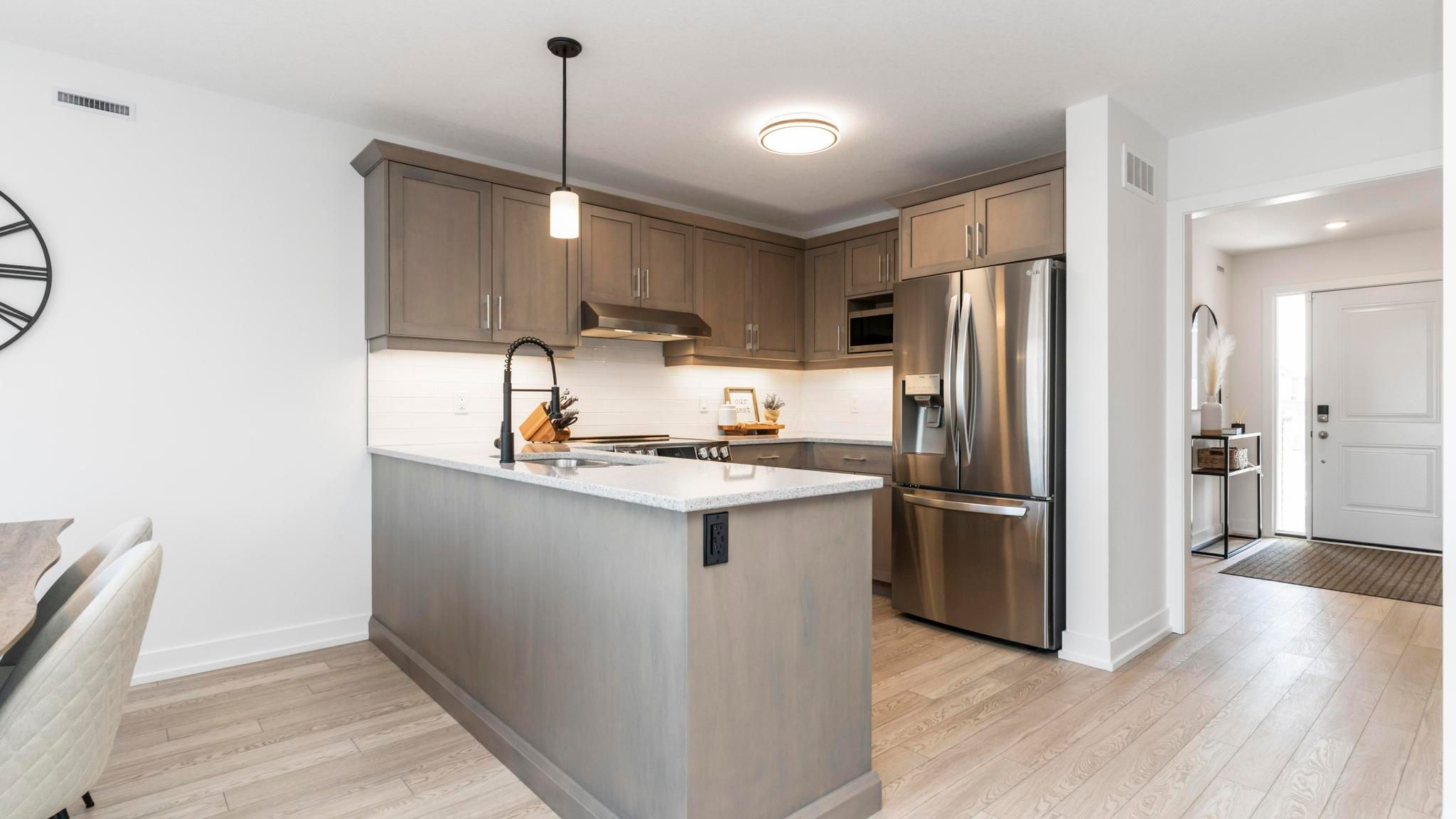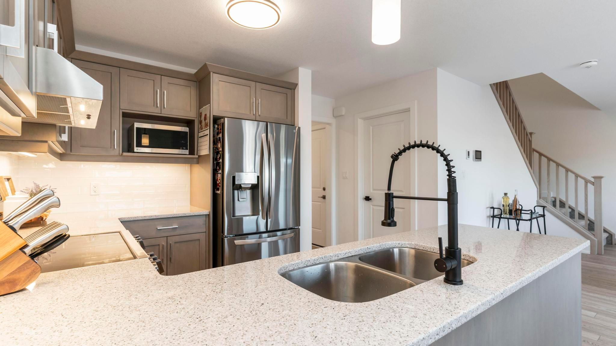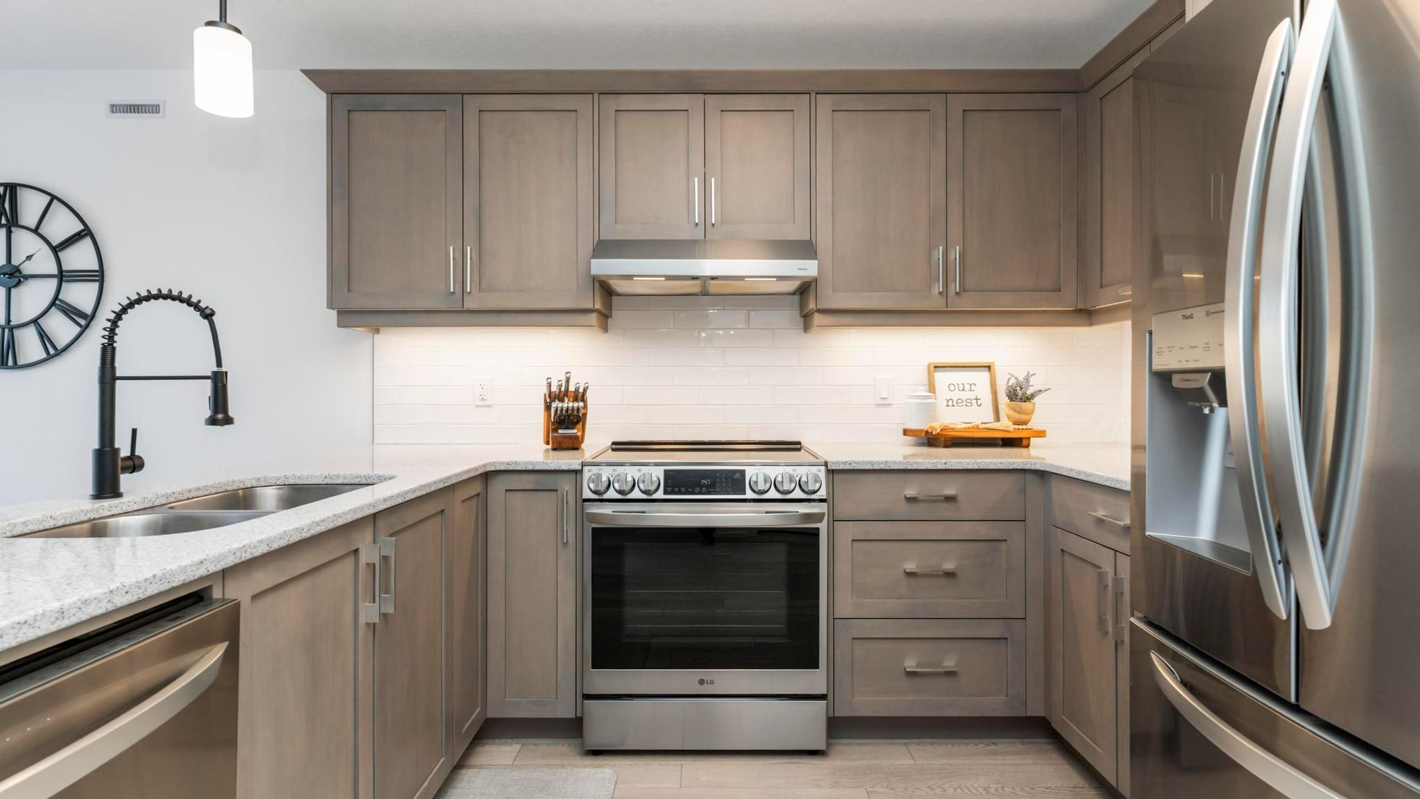 • Modern kitchen featuring quartz counters and tiled backsplash.