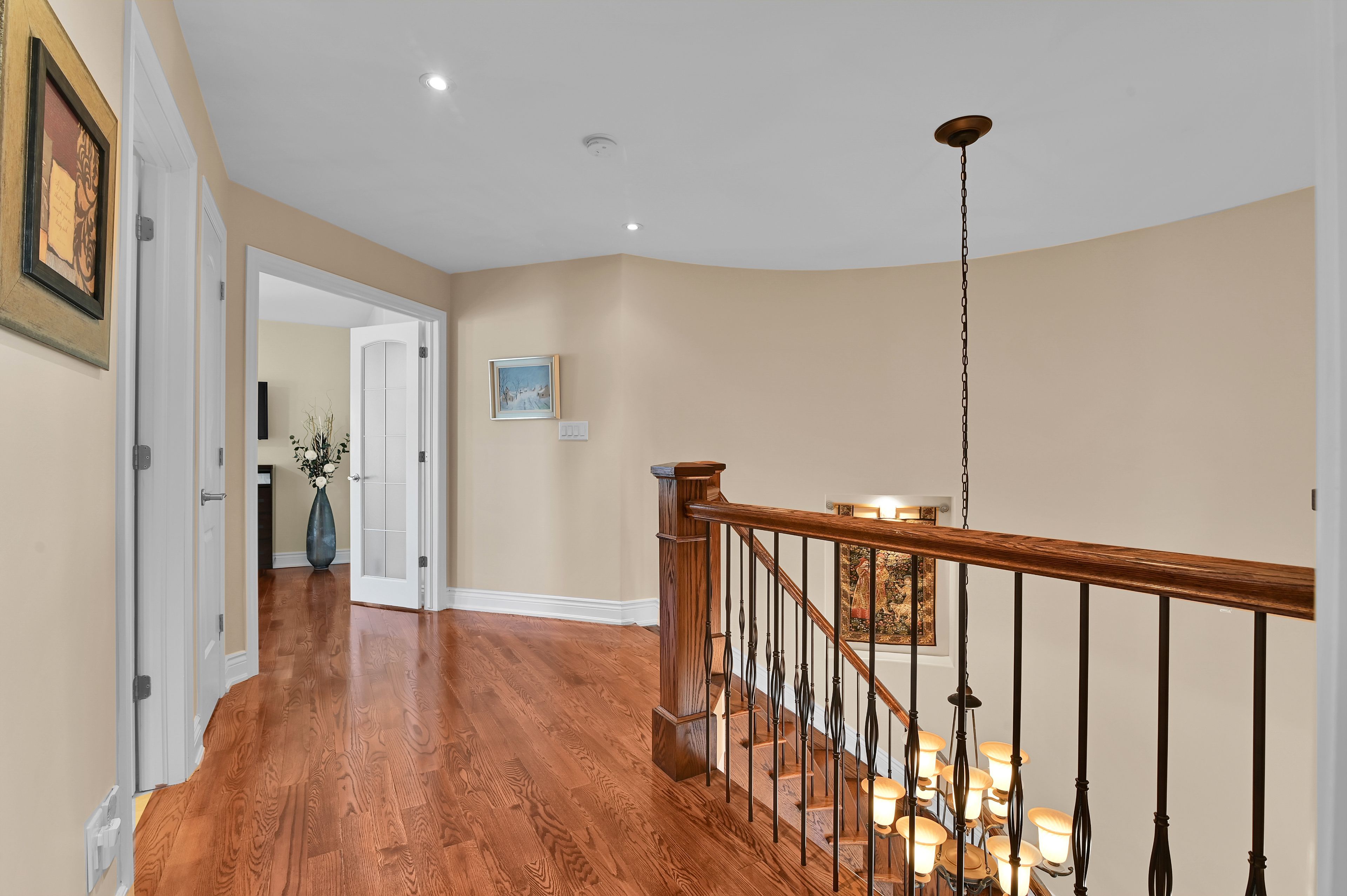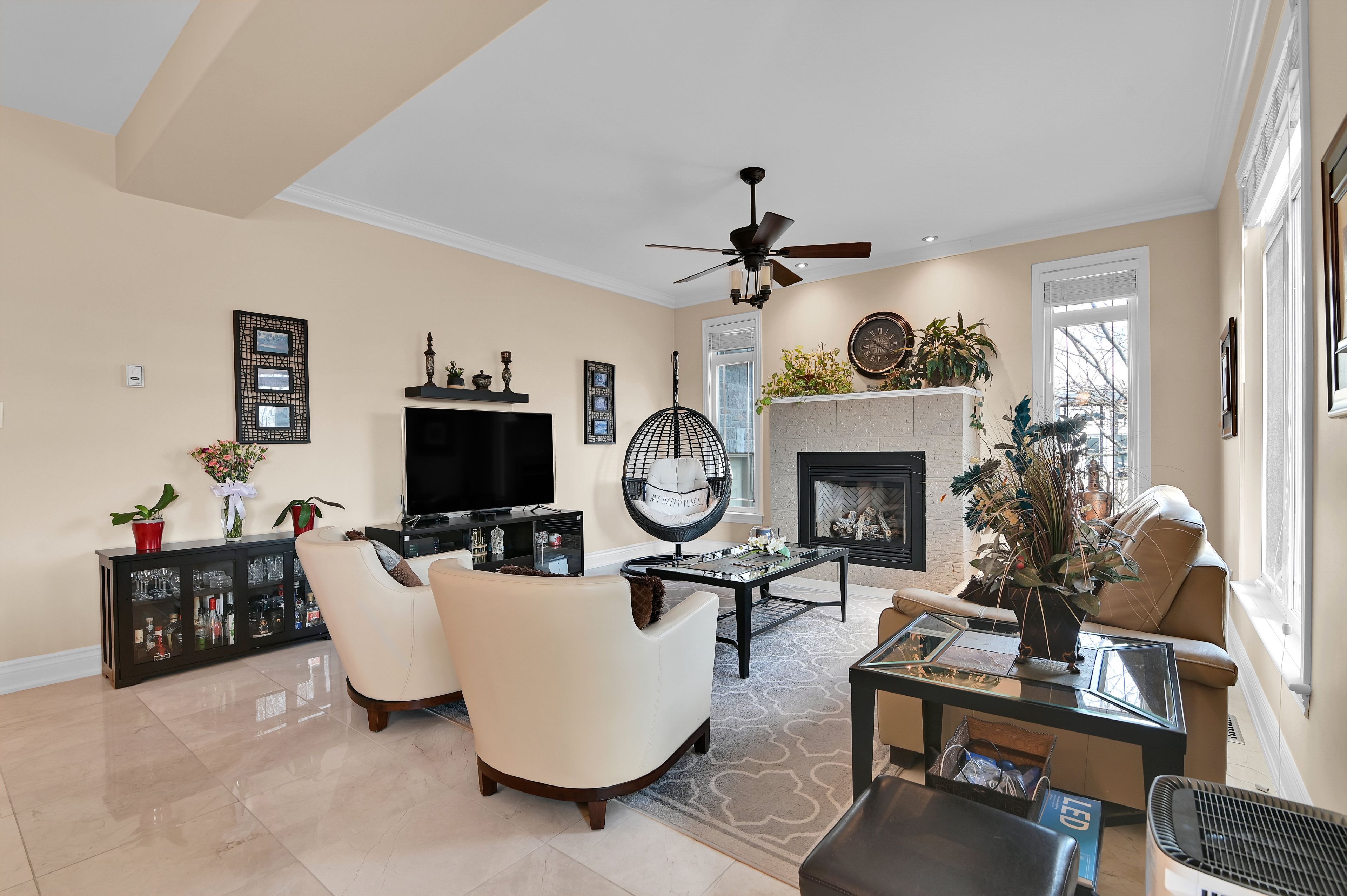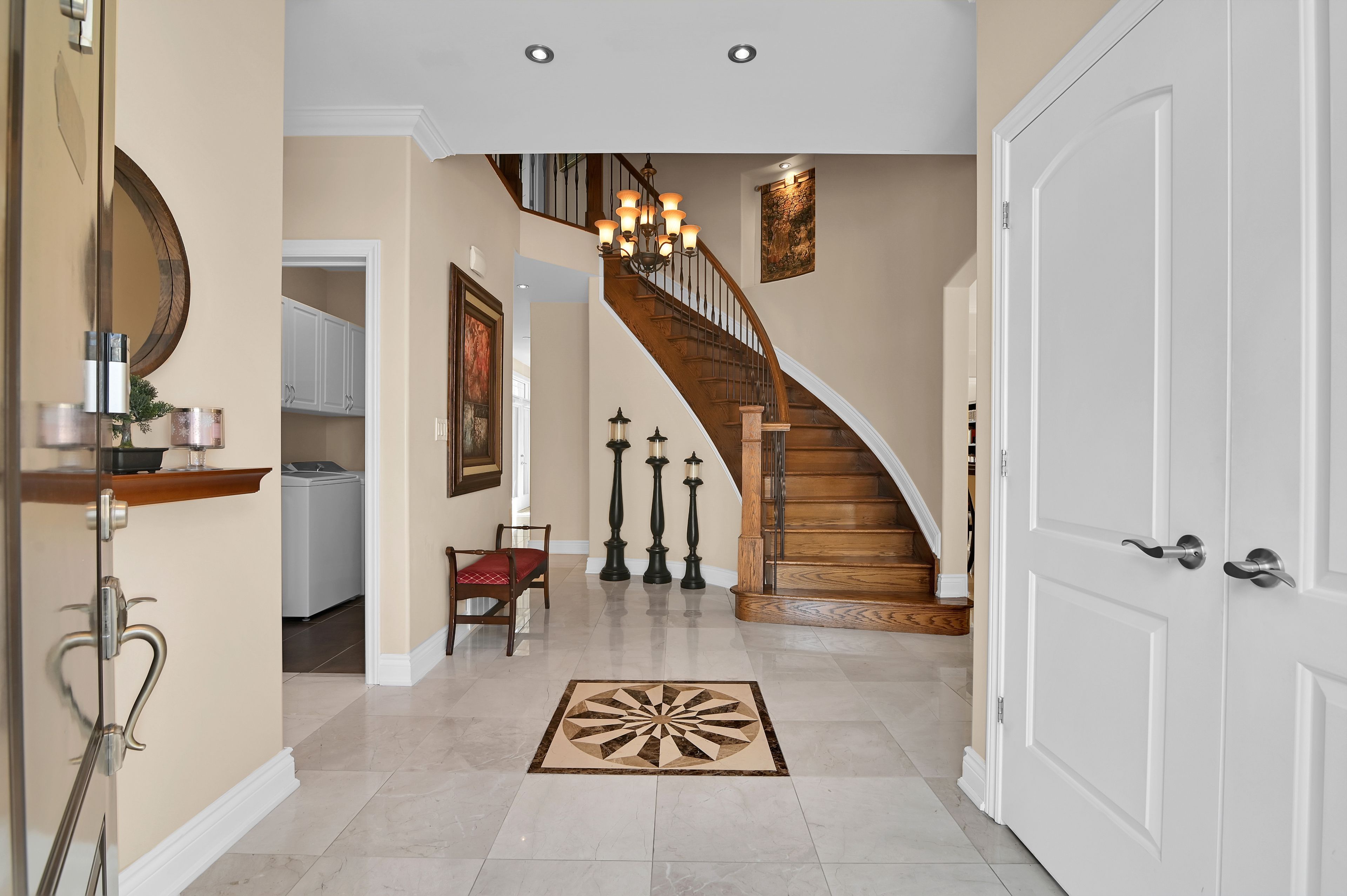 Tucked away in a peaceful enclave, this custom-built stone house delivers sophisticated design, premium finishes, and an enviable lifestyle. It sits on a beautifully landscaped corner lot surrounded by vibrant flower beds and is perfect for summer entertaining, morning coffee/evening relaxation under the stars. Step into the grand foyer featuring custom inlaid marble medallion floor in a dramatic compass design, a curved oak staircase with hardwood stairs and ornate wrought-iron railings, and soaring ceilings bathed in natural light. The main level flows effortlessly into generously proportioned principal rooms. The gourmet kitchen is a chef's dream with rich dark cherry wood cabinetry, sleek black granite countertops, a large central island with breakfast bar and top-tiered stainless steel appliances. It opens seamlessly to the family room anchored by a striking stone fireplace and warm hardwood floors. Adjacent, the formal living and dining areas impress with arched windows dressed in custom blinds, multiple chandeliers, crown moulding, and neutral designer tones that create an inviting yet refined atmosphere. You will love the 11 feet super high ceiling through out and an additional office/bedroom in the corner to meet your various needs. Upstairs are three spacious bedrooms offer oversized windows flooding with light and a serene palette. The master bedroom ensuite features his and her sink, dark wood vanity and a separate toilet with a close door and. Downstairs, the fully finished recreation room is an entertainer's delight-complete with a full-size ping-pong table, comfortable lounge seating, and can be converted to an in-law suite by adding a small kitchenette. This house was designed by the current owner and was built with love and passion: 9-inch poured concrete foundation, solid wood, reinforced roof support just to mention a few. 750$ per year association fee to cover the snow plowing for the private rd. Hot-water tank is rental at 50$ including hst.