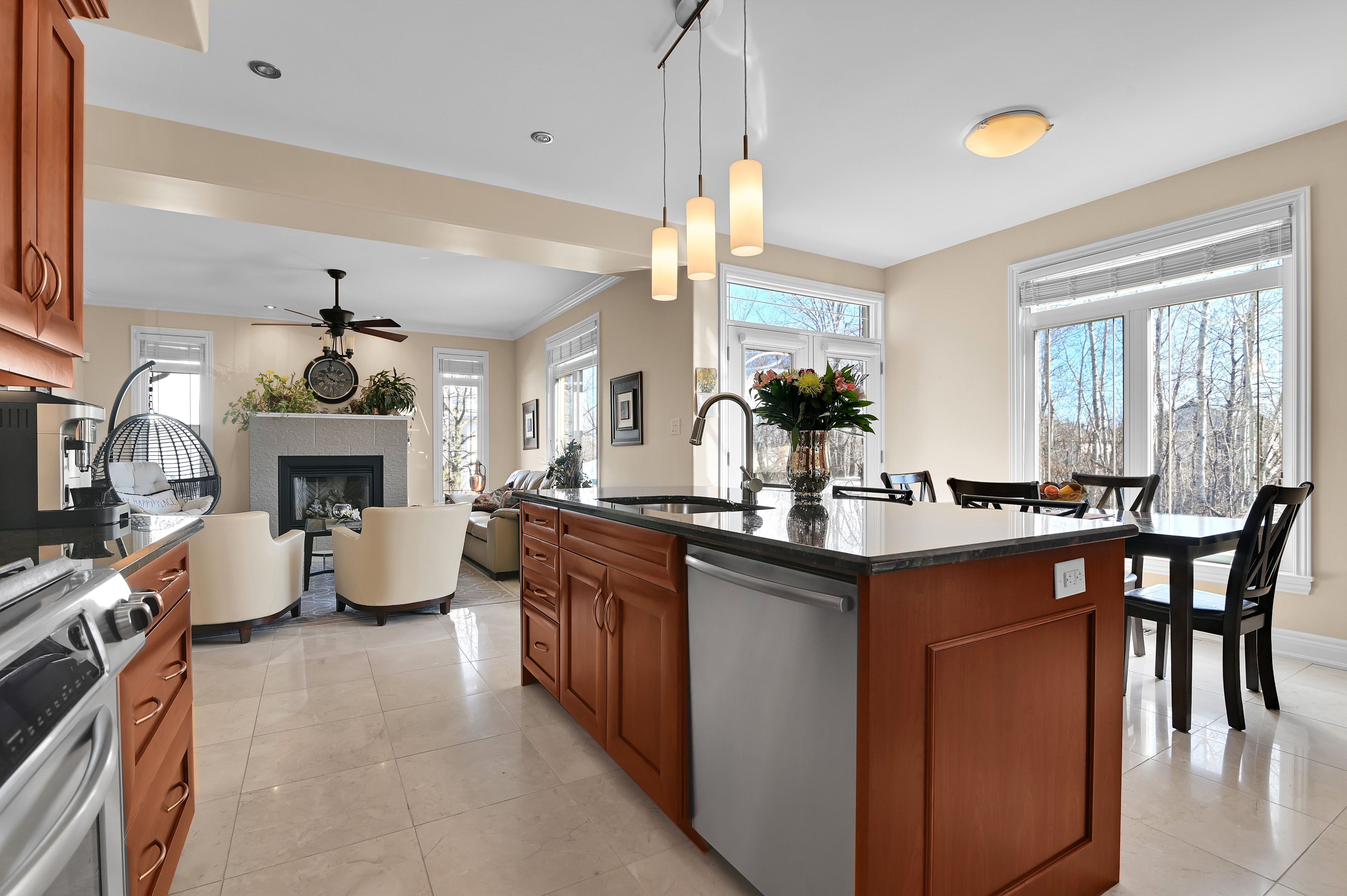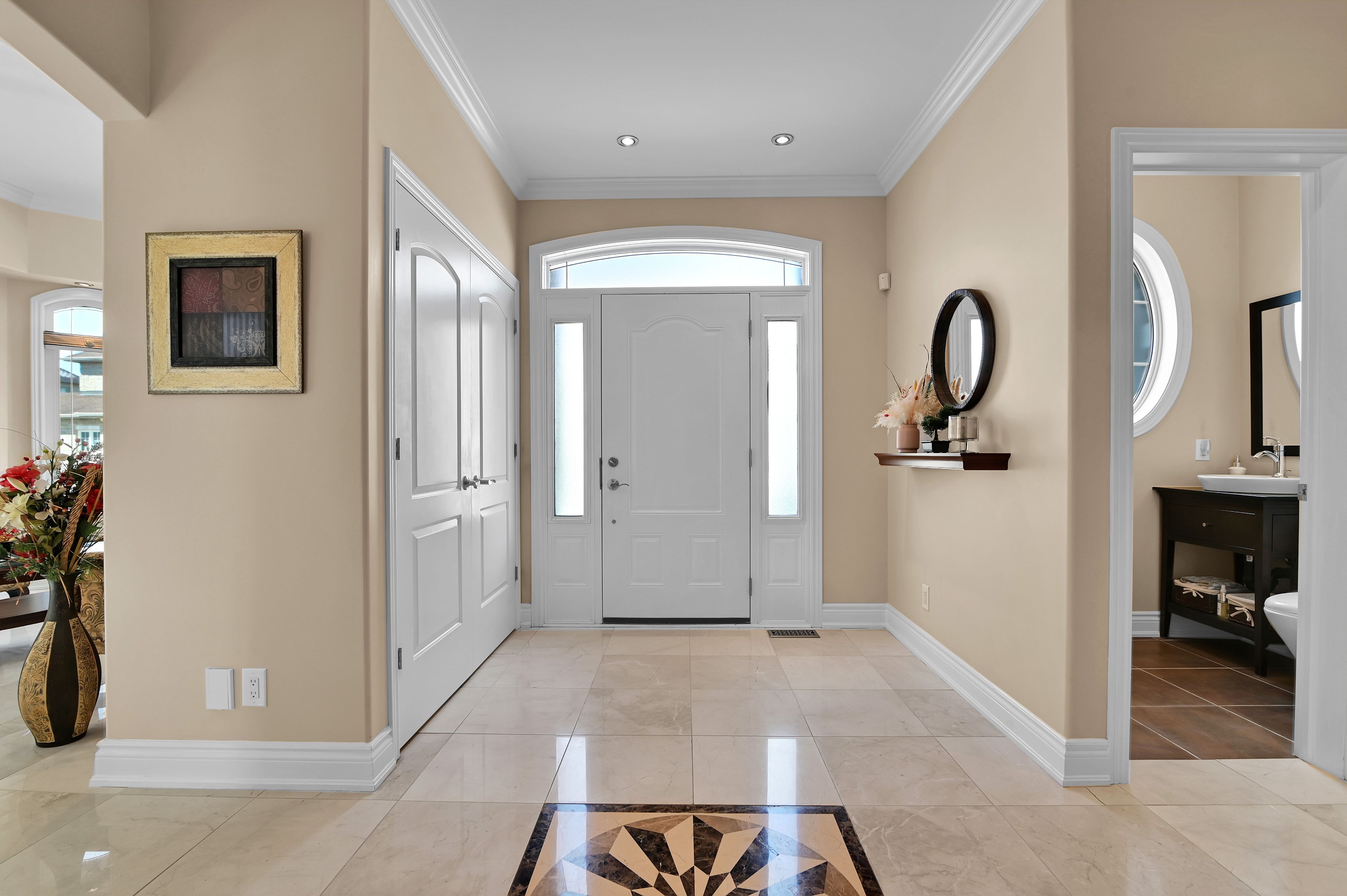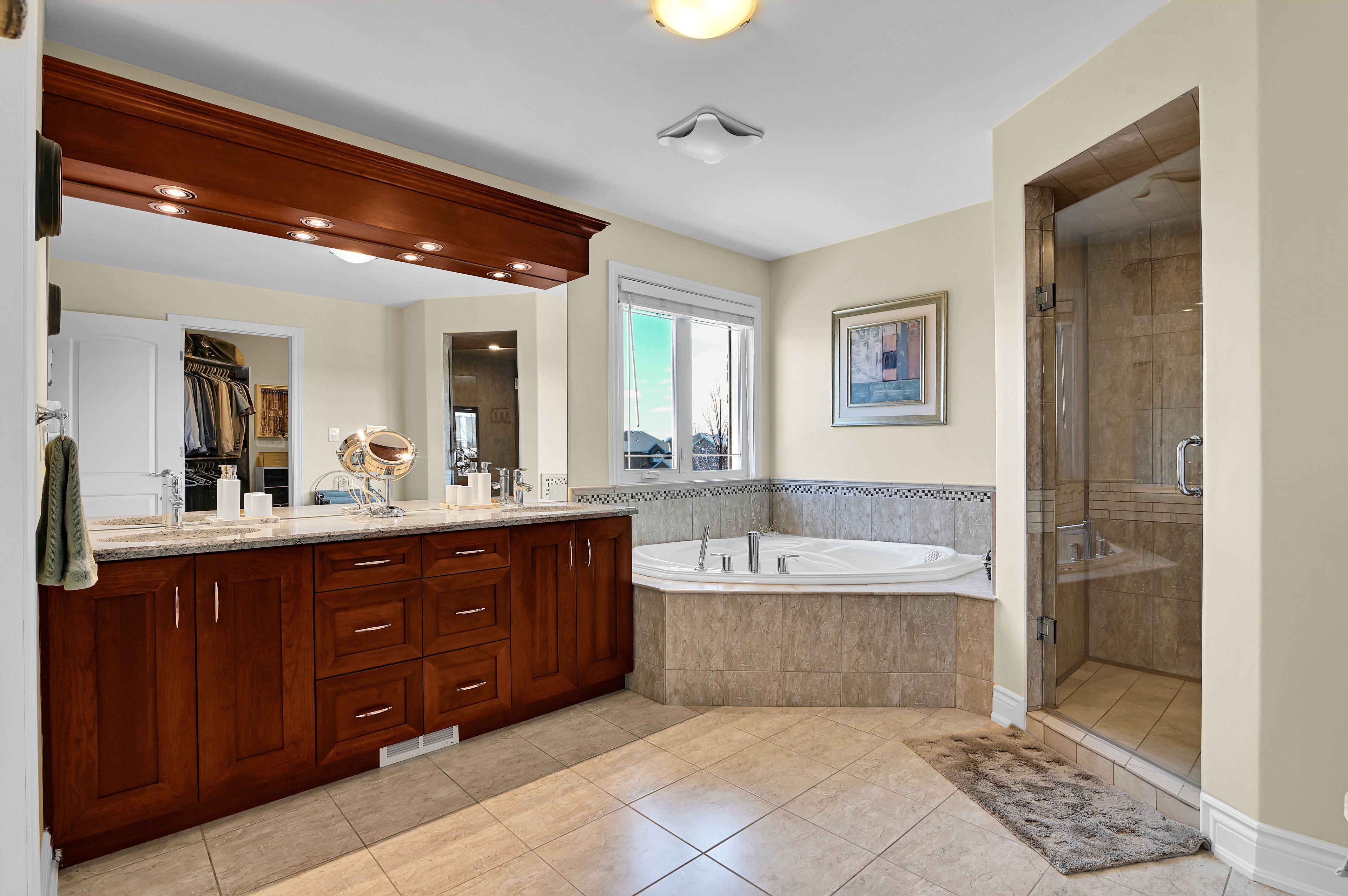 Tucked away in a peaceful enclave, this custom-built stone house delivers sophisticated design, premium finishes, and an enviable lifestyle. It sits on a beautifully landscaped corner lot surrounded by vibrant flower beds and is perfect for summer entertaining, morning coffee/evening relaxation under the stars. Step into the grand foyer featuring custom inlaid marble medallion floor in a dramatic compass design, a curved oak staircase with hardwood stairs and ornate wrought-iron railings, and soaring ceilings bathed in natural light. The main level flows effortlessly into generously proportioned principal rooms. The gourmet kitchen is a chef's dream with rich dark cherry wood cabinetry, sleek black granite countertops, a large central island with breakfast bar and top-tiered stainless steel appliances. It opens seamlessly to the family room anchored by a striking stone fireplace and warm hardwood floors. Adjacent, the formal living and dining areas impress with arched windows dressed in custom blinds, multiple chandeliers, crown moulding, and neutral designer tones that create an inviting yet refined atmosphere. You will love the 11 feet super high ceiling through out and an additional office/bedroom in the corner to meet your various needs. Upstairs are three spacious bedrooms offer oversized windows flooding with light and a serene palette. The master bedroom ensuite features his and her sink, dark wood vanity and a separate toilet with a close door and. Downstairs, the fully finished recreation room is an entertainer's delight-complete with a full-size ping-pong table, comfortable lounge seating, and can be converted to an in-law suite by adding a small kitchenette. This house was designed by the current owner and was built with love and passion: 9-inch poured concrete foundation, solid wood, reinforced roof support just to mention a few. 750$ per year association fee to cover the snow plowing for the private rd. Hot-water tank is rental at 50$ including hst.