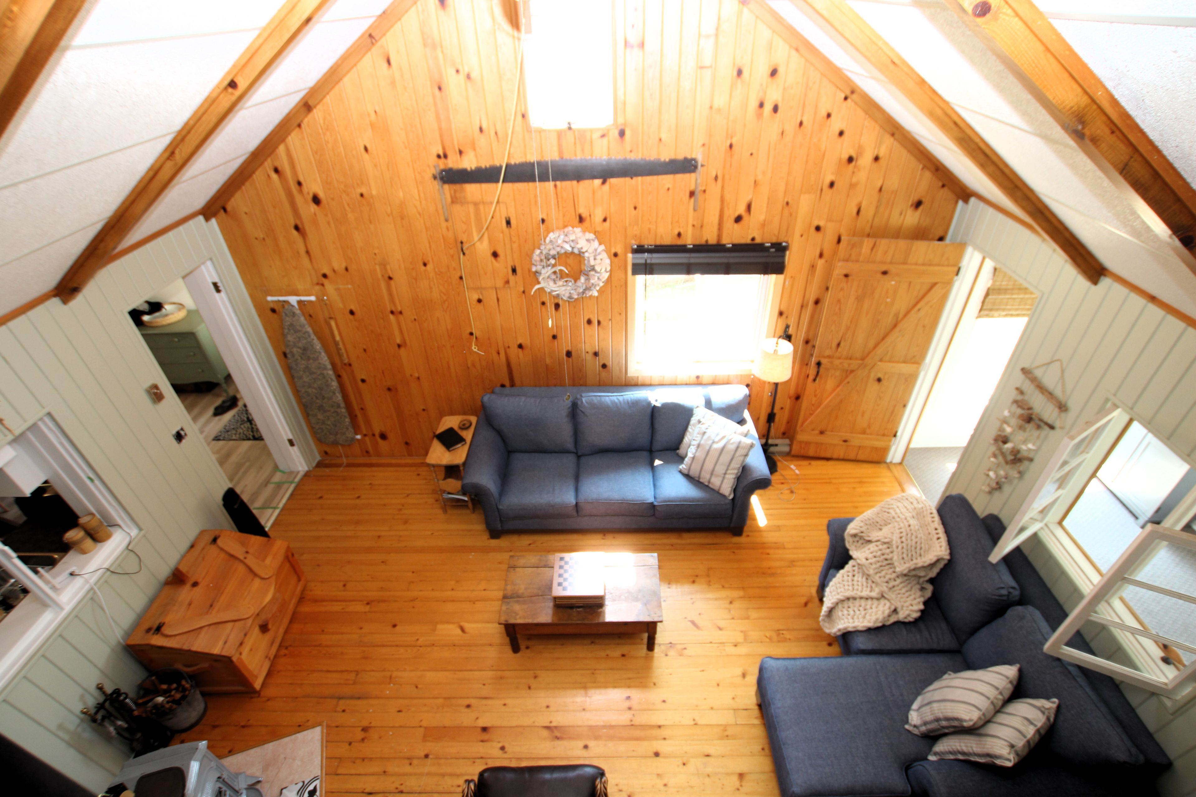 • Cozy living room featuring a wood stove and warm pine finishes.