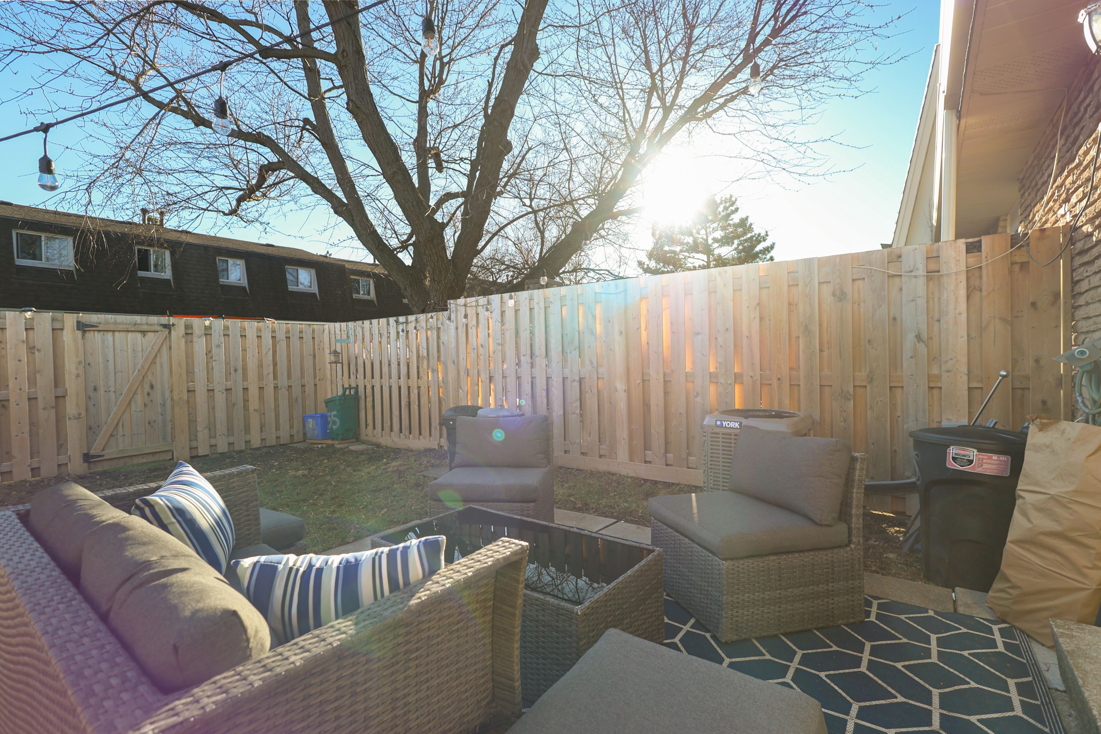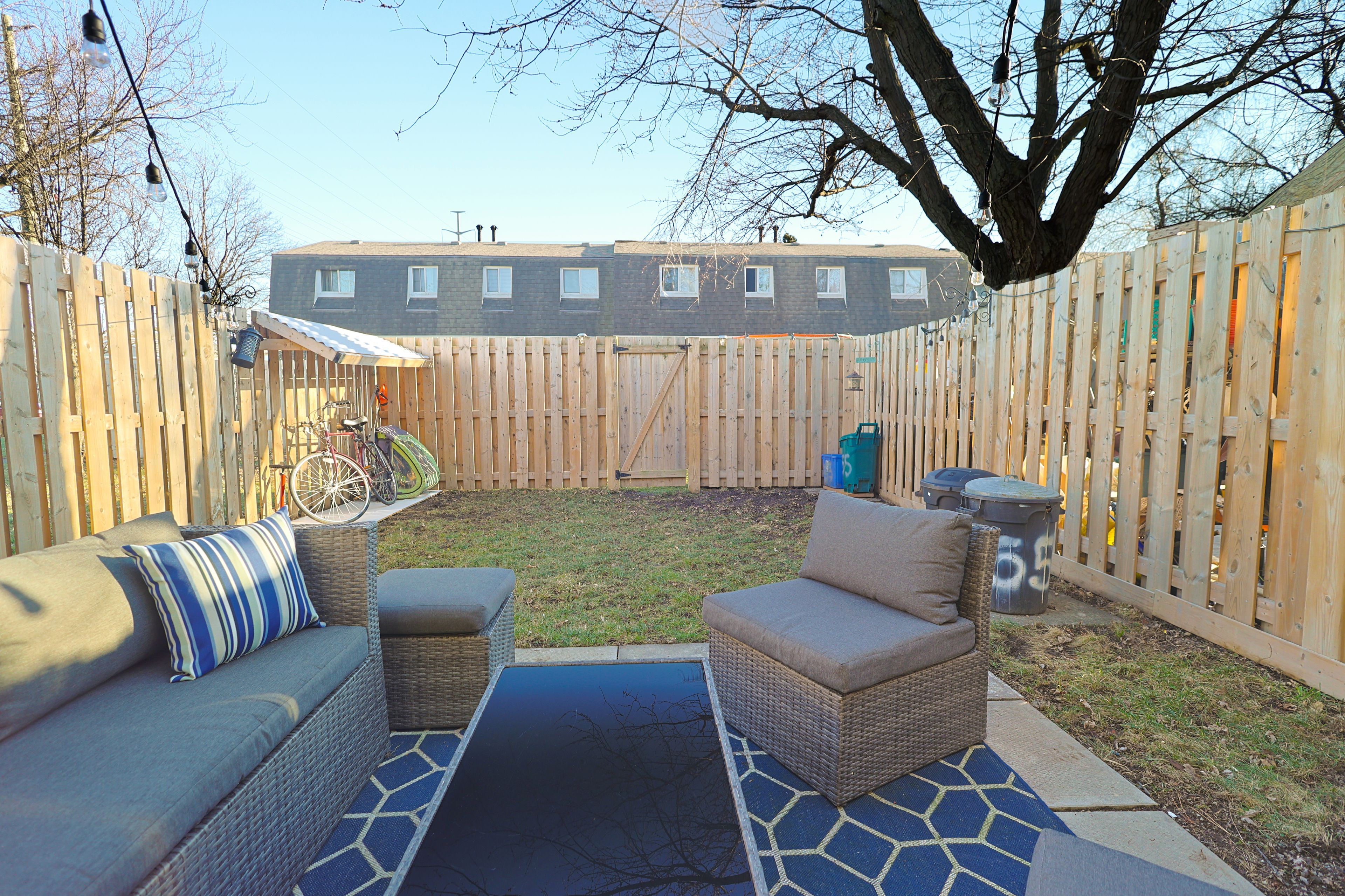 • Fully fenced backyard with large patio and outdoor seating area.