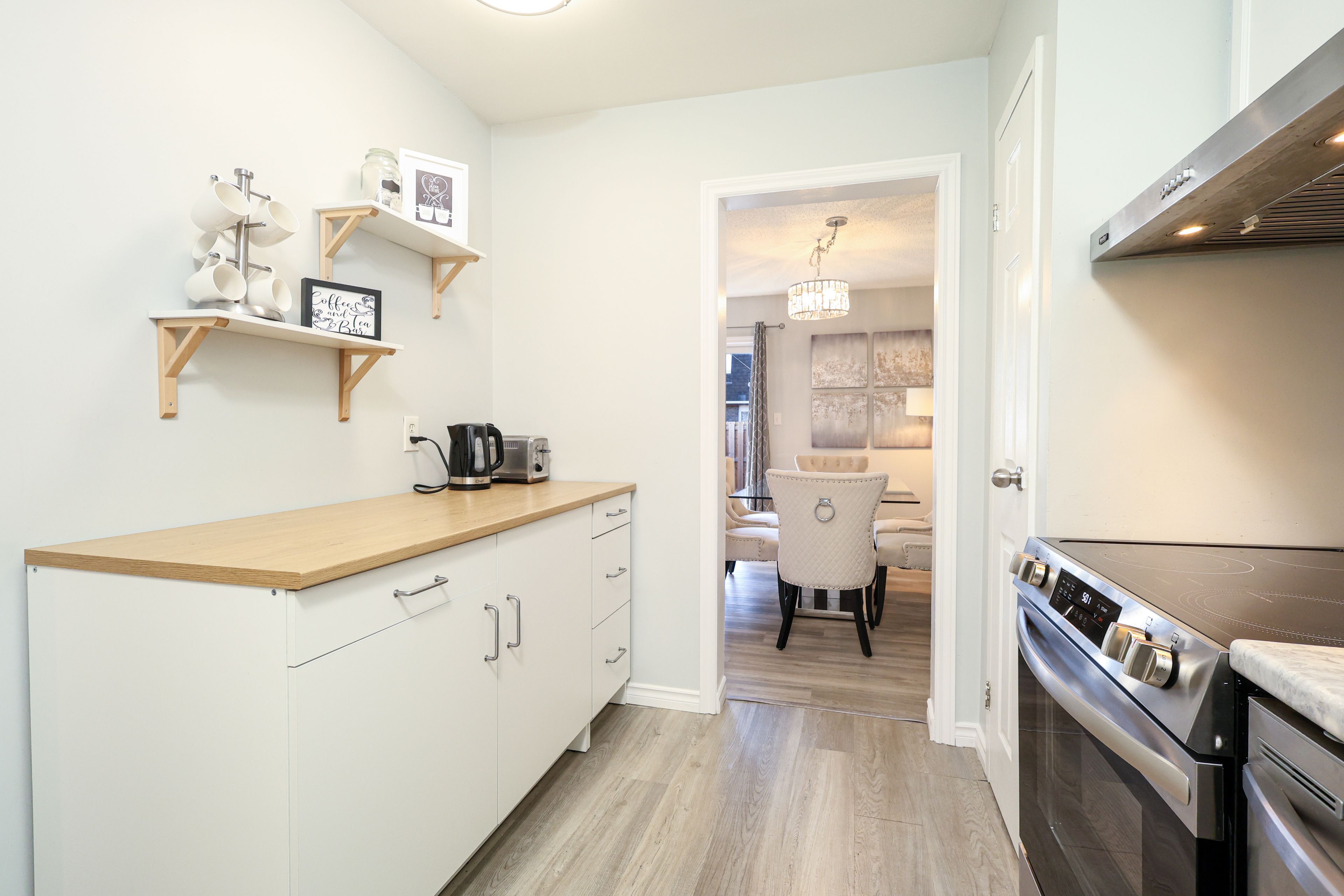 • Modern kitchen with new appliances and exterior exhaust hood.