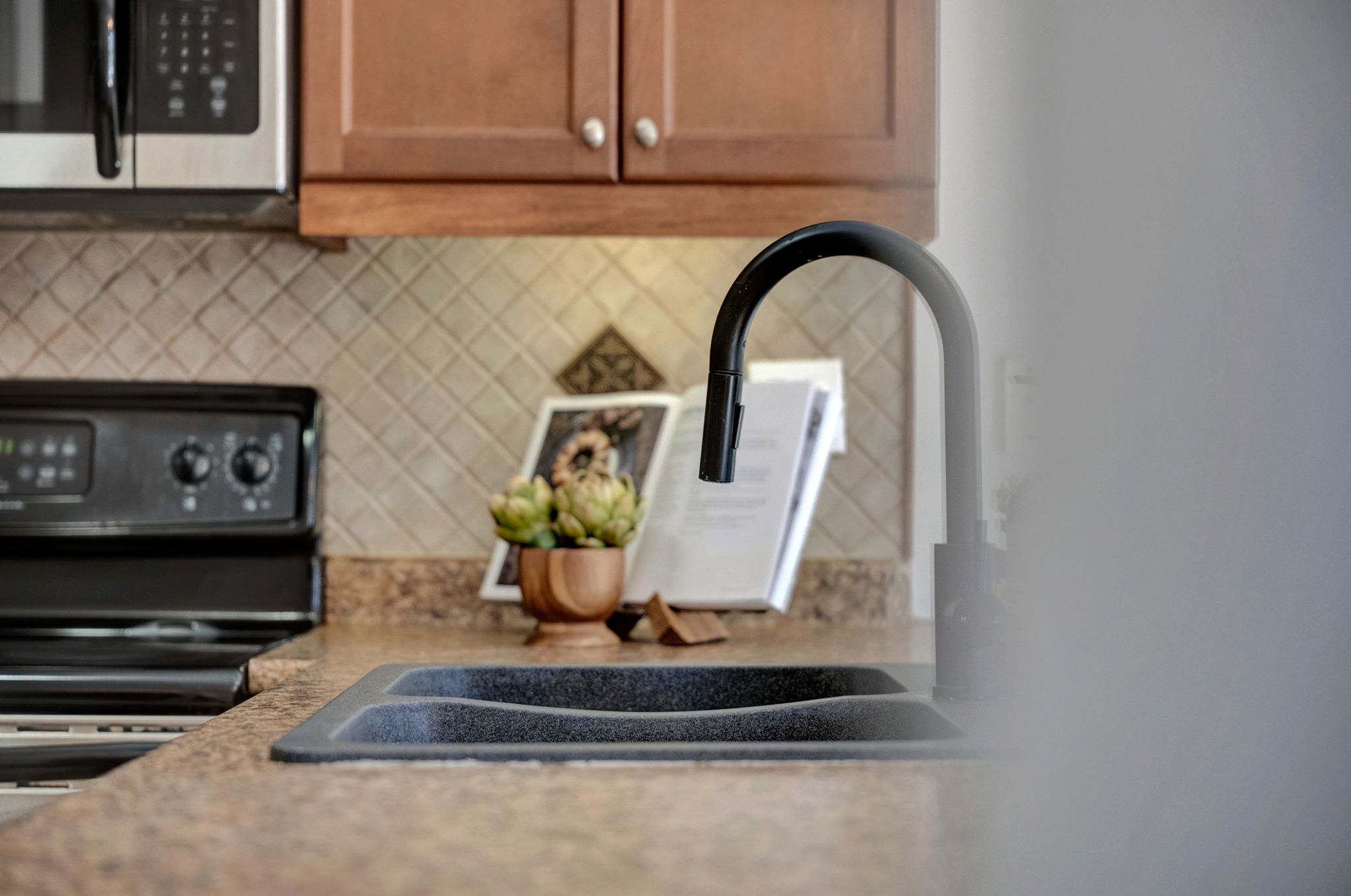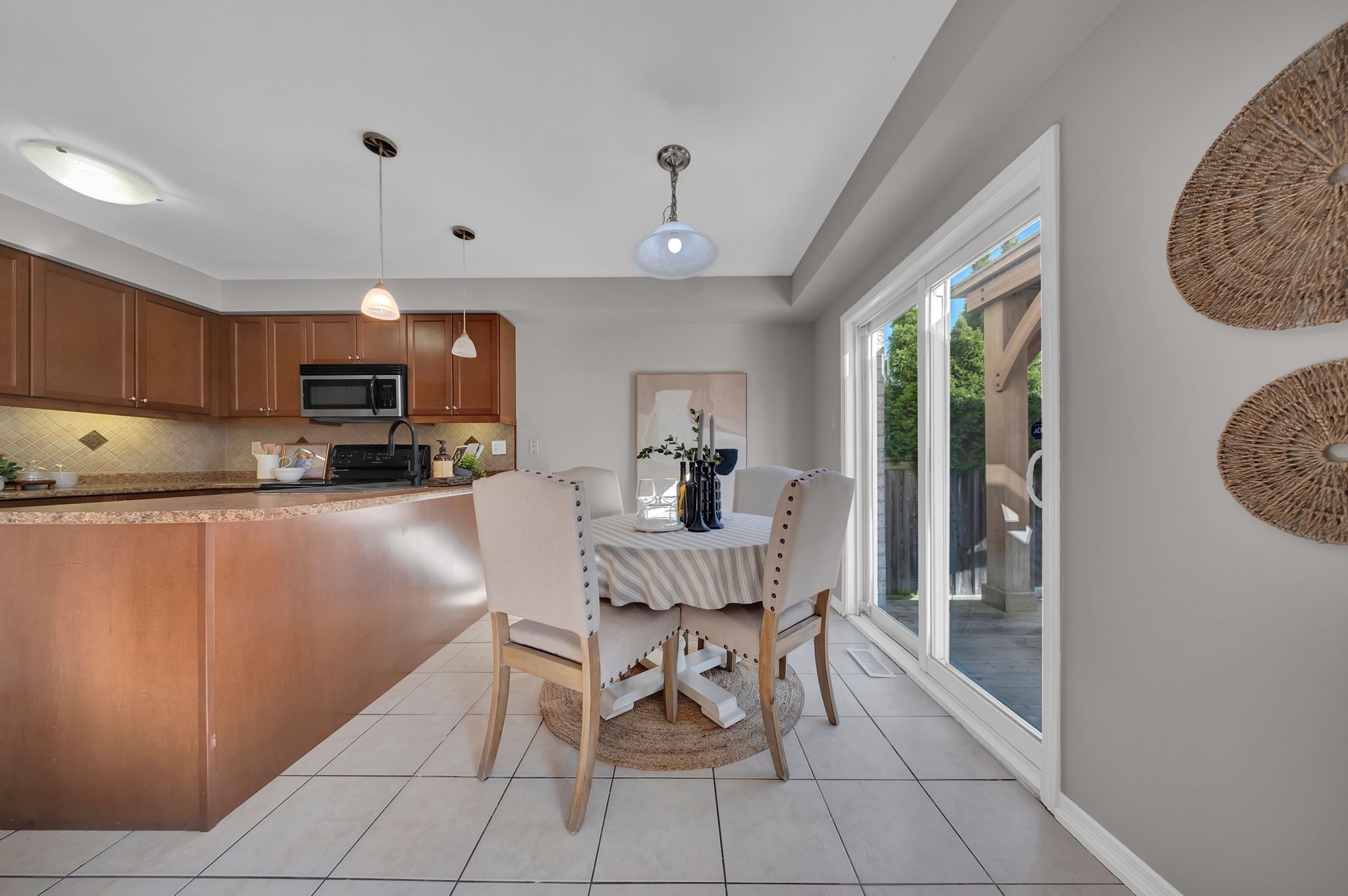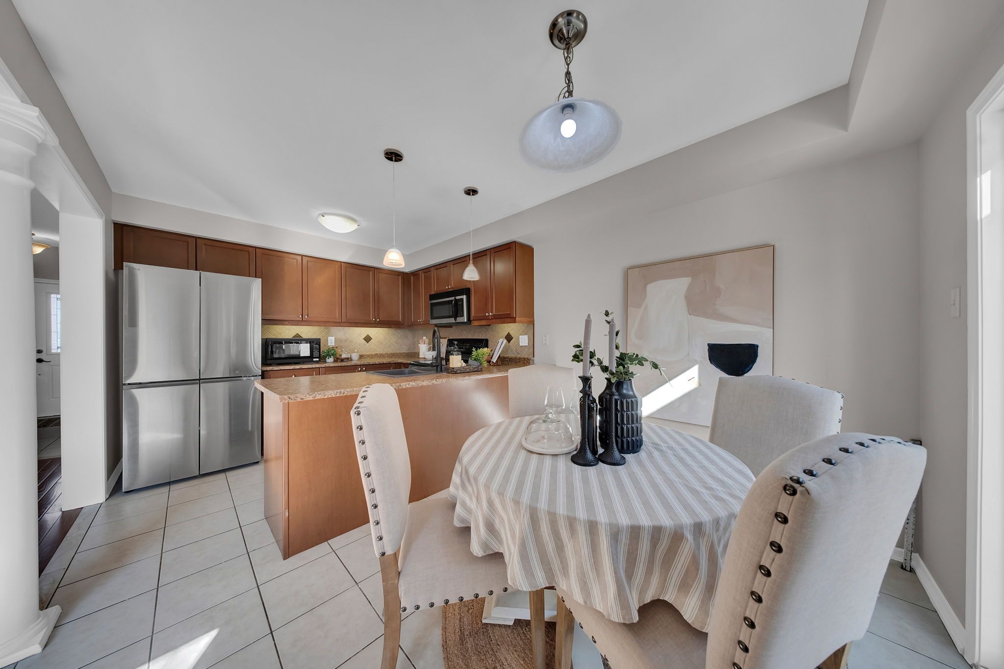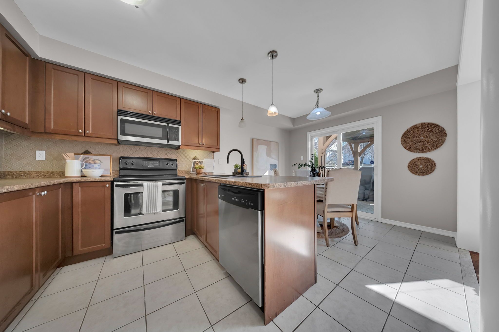 • Spacious eat-in kitchen with stainless steel appliances and dining area.