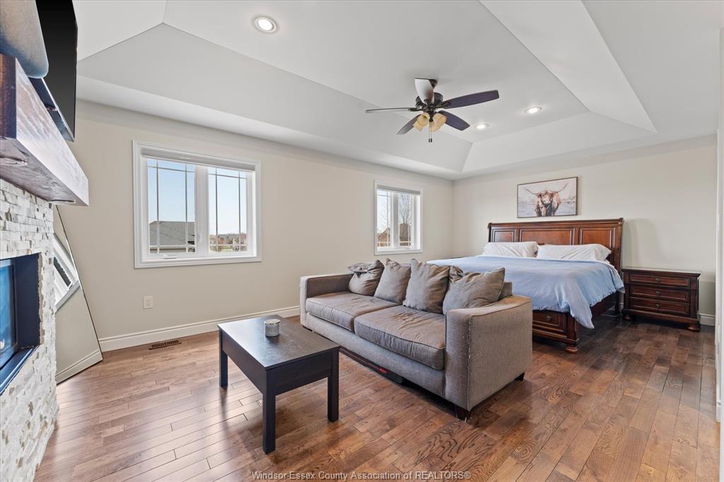 • Large primary bedroom with fireplace, walk-in closet, and private ensuite.
