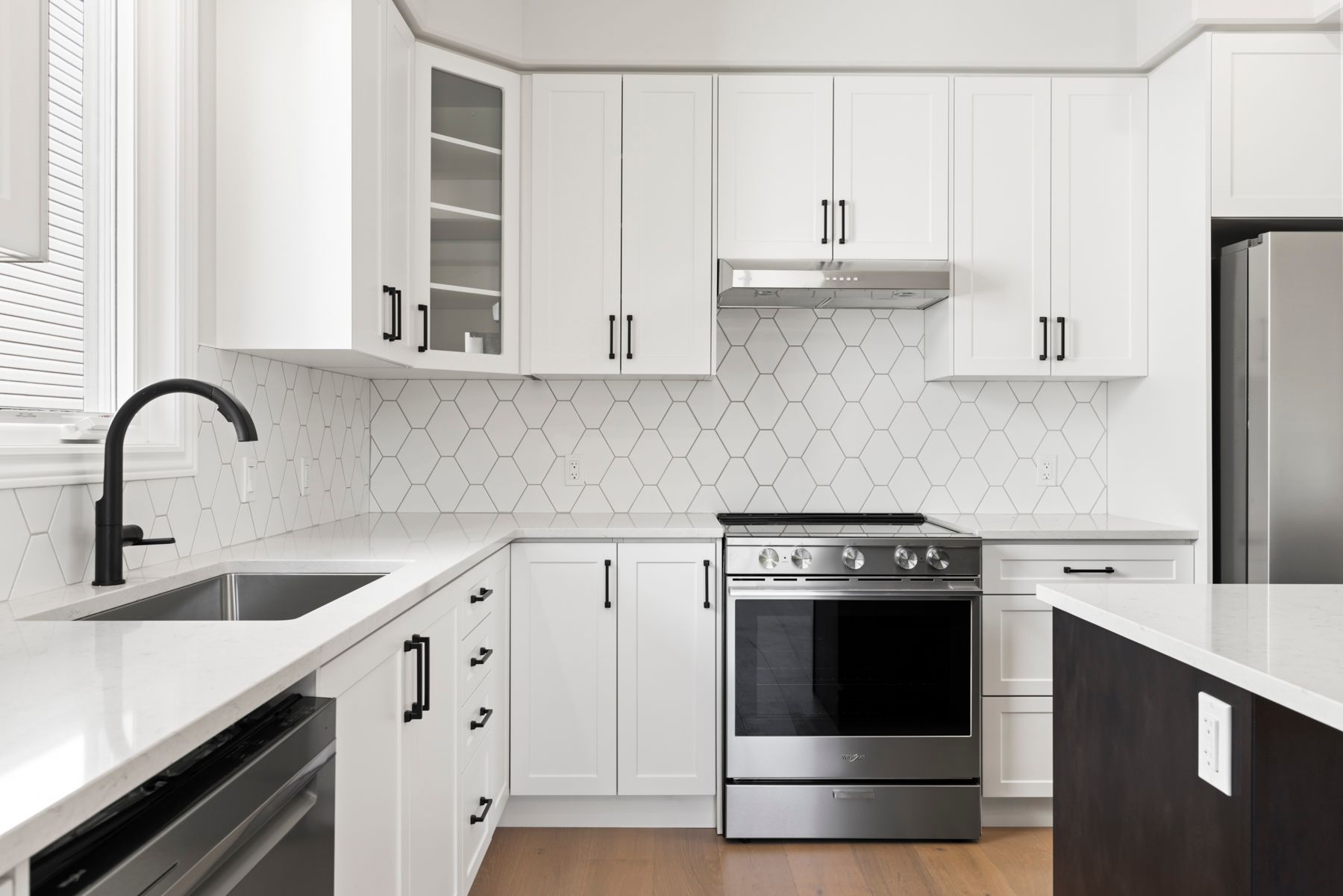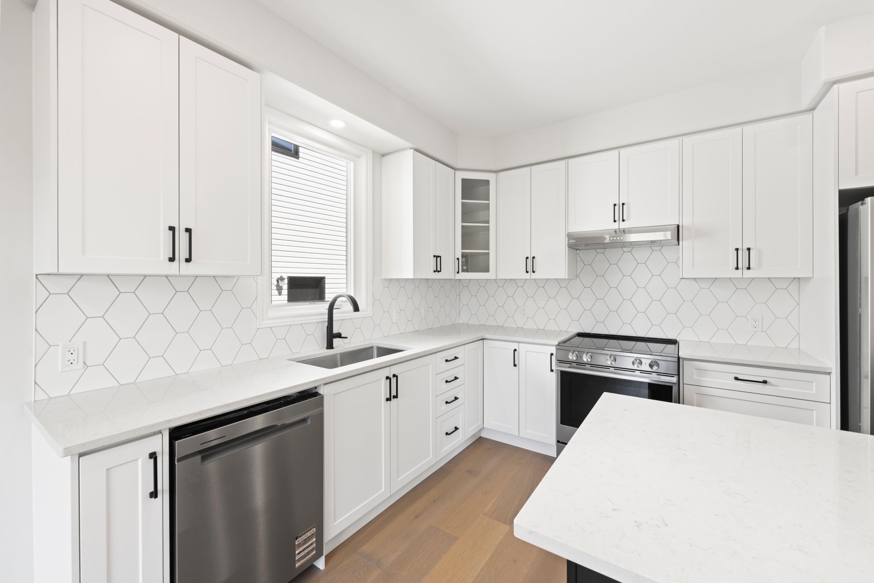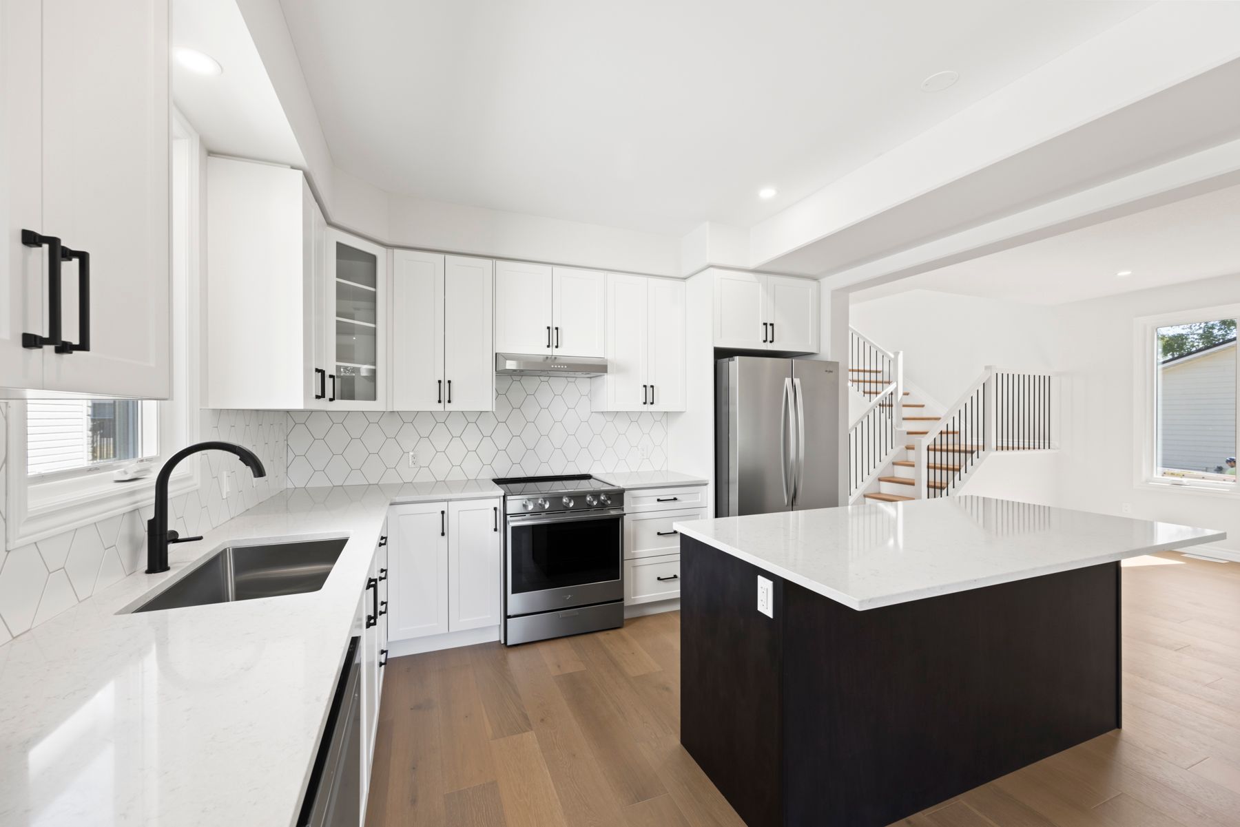 • Well-equipped kitchen featuring a large 6ft island and quartz countertops.