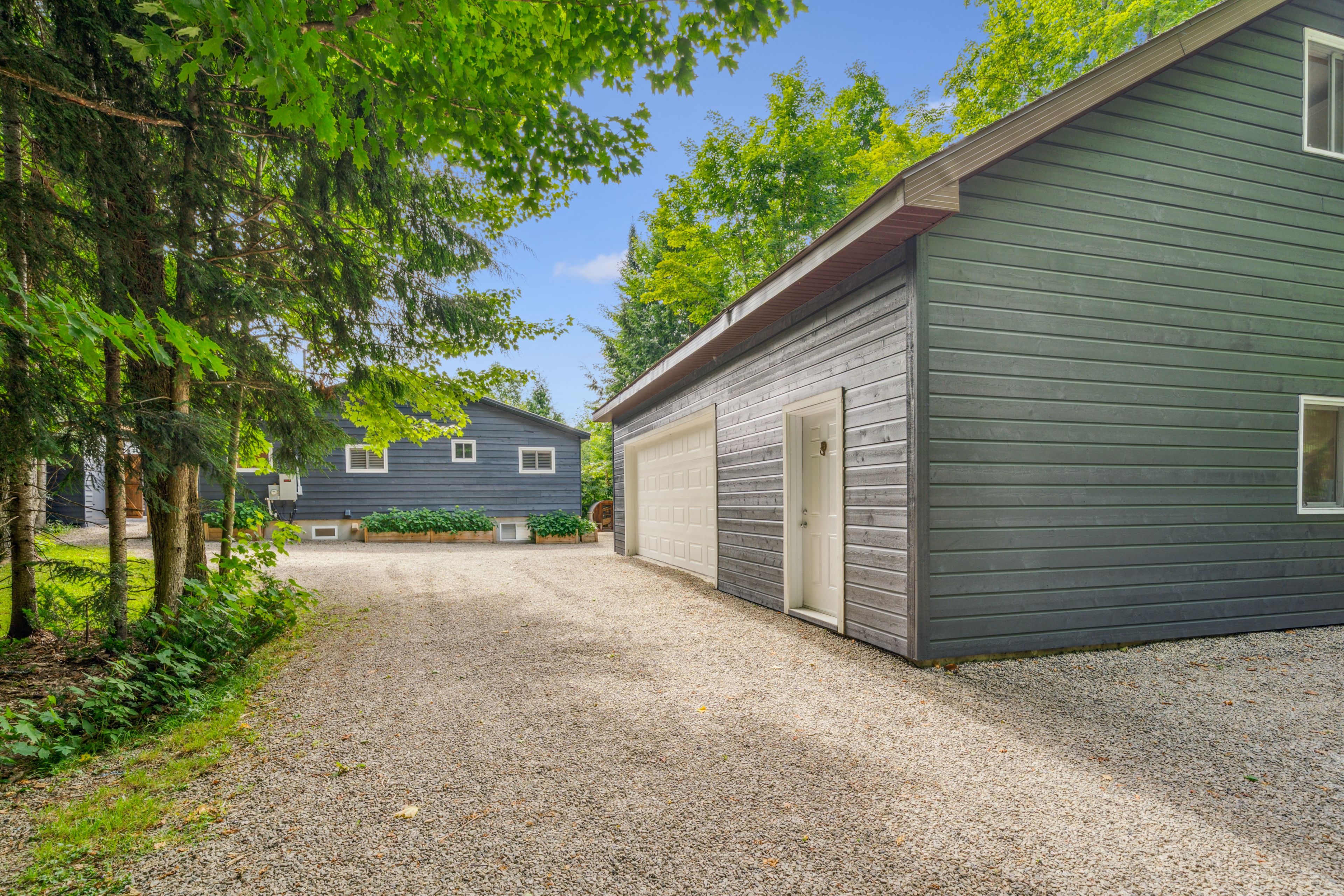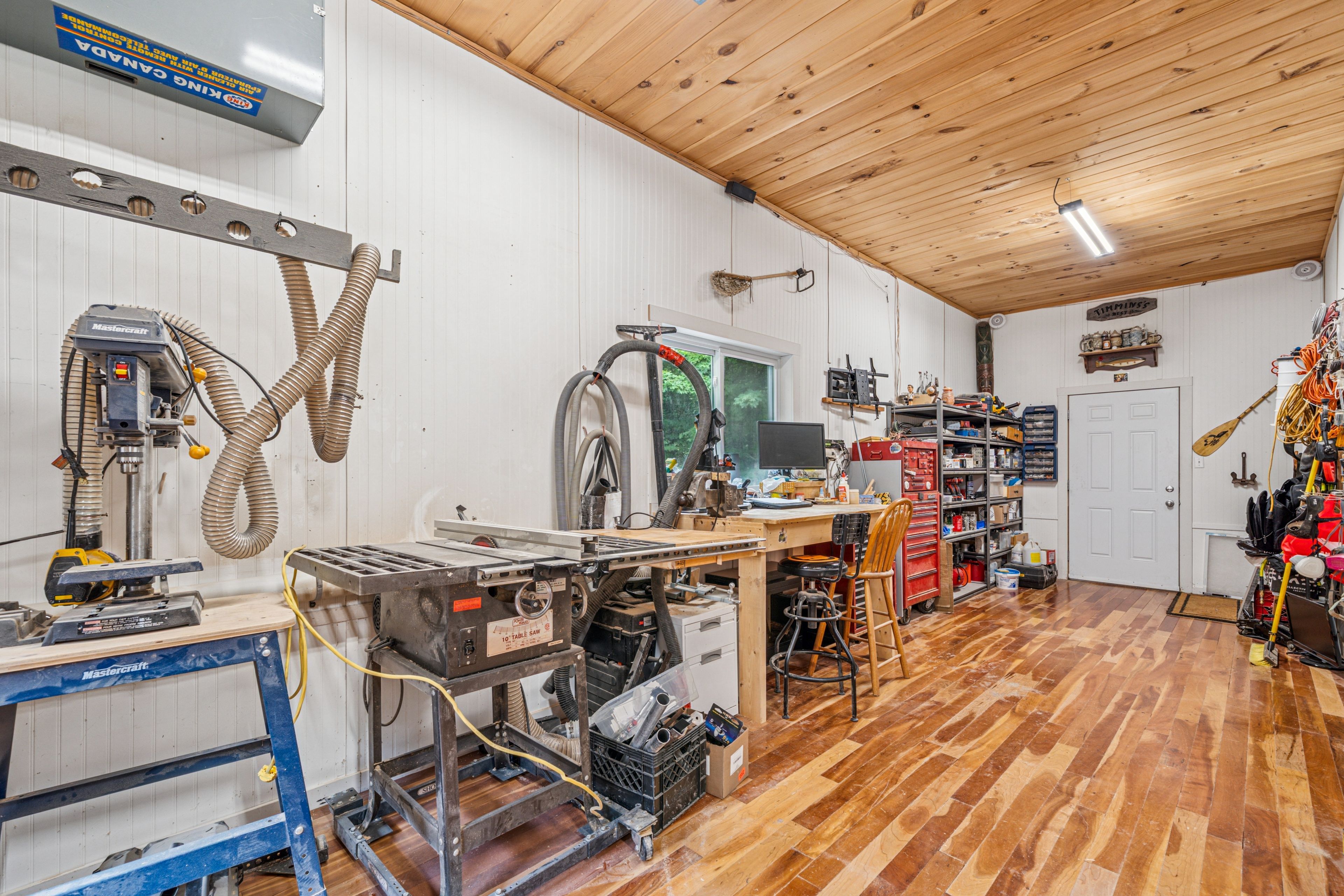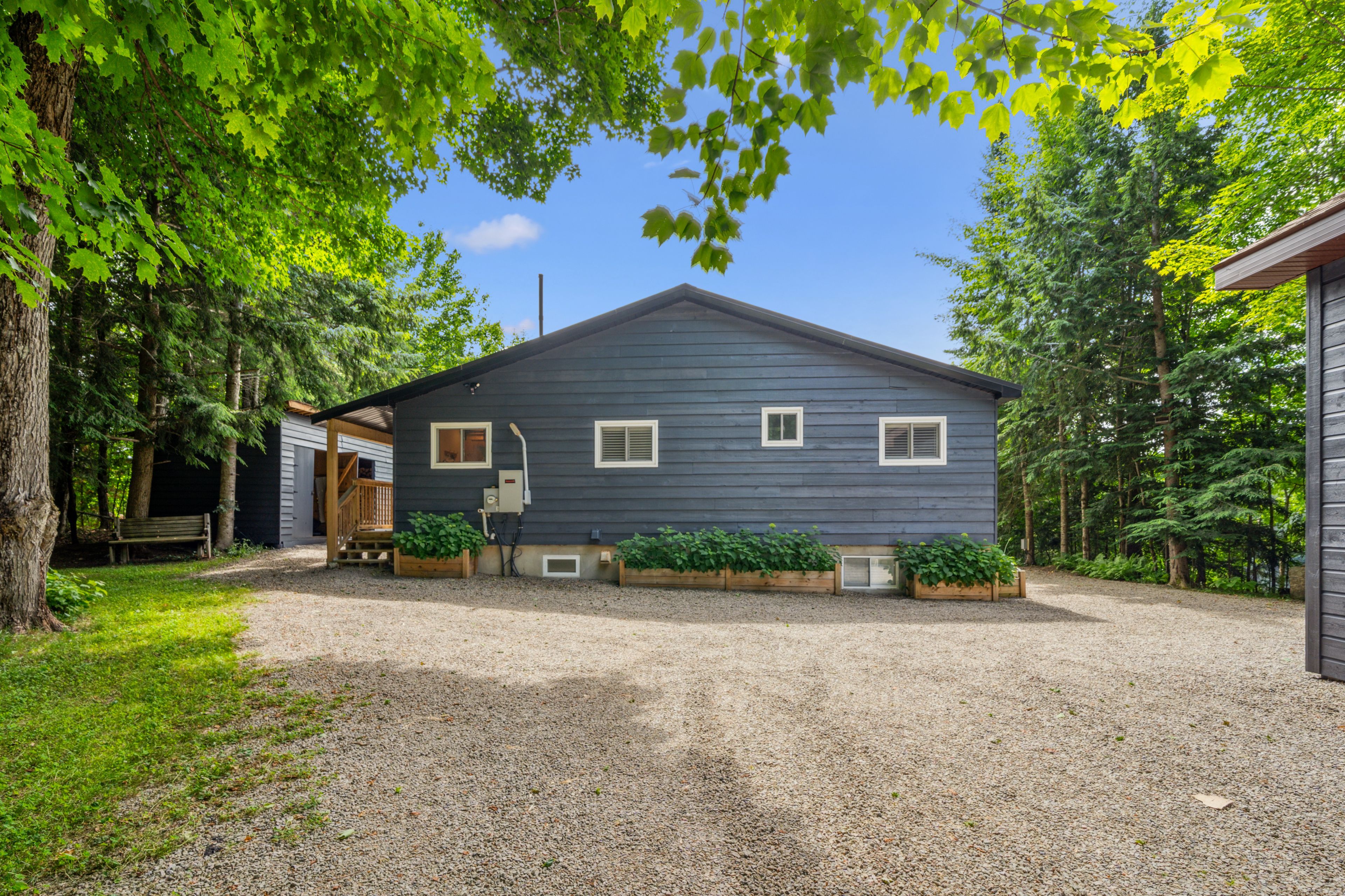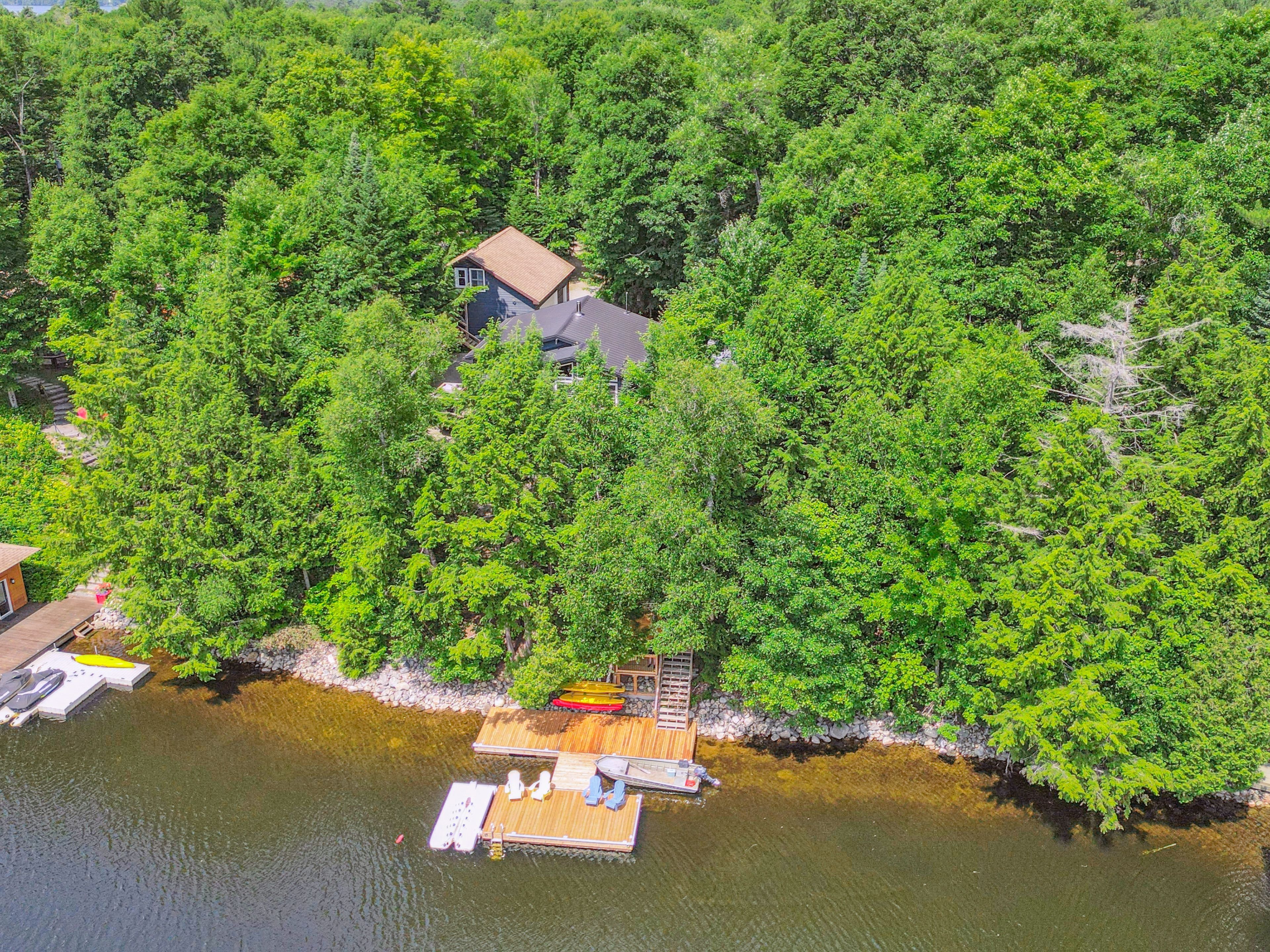 A peaceful year round retreat on a privately maintained road just 15 minutes from dorset. This quiet, low traffic setting is ideal for walking, biking, and safe enjoyment by children and pets. The property offers exceptional privacy, with lake views across to crown land and direct access to a 31+ acre private park-the wolf sanctuary-jointly owned by surrounding cottage owners. Ownership shares transfer with the property, providing wooded trails for walking and snowshoeing. Wolf inlet remains calm even when the main lake is windy, making it perfect for paddling, swimming, and relaxed waterfront living. The cottage/home is bright and inviting, surrounded by mature trees that create a natural, sheltered feel. The main level features an open concept layout with two bedrooms, a full bath, and a spacious sunroom that can serve as additional dining or lounging space. The lower level primary bedroom offers excellent privacy and walkout access to the gardens and lake. The landscaped areas blend seamlessly with the natural tree cover, maintaining strong privacy throughout the property. A large double garage includes a workshop, fitness area, and a loft currently used as a private office-ideal for remote work. Mechanical systems are solid, with a drilled well, forced air propane furnace, airtight woodstove, gas fireplace in the primary bedroom, and a fully automatic 17 kw generac generator. At the shoreline, enjoy quality docking with both shallow entry and deeper water for secure boat mooring. A rare combination of privacy, community, and year round comfort on beautiful kawagama lake.