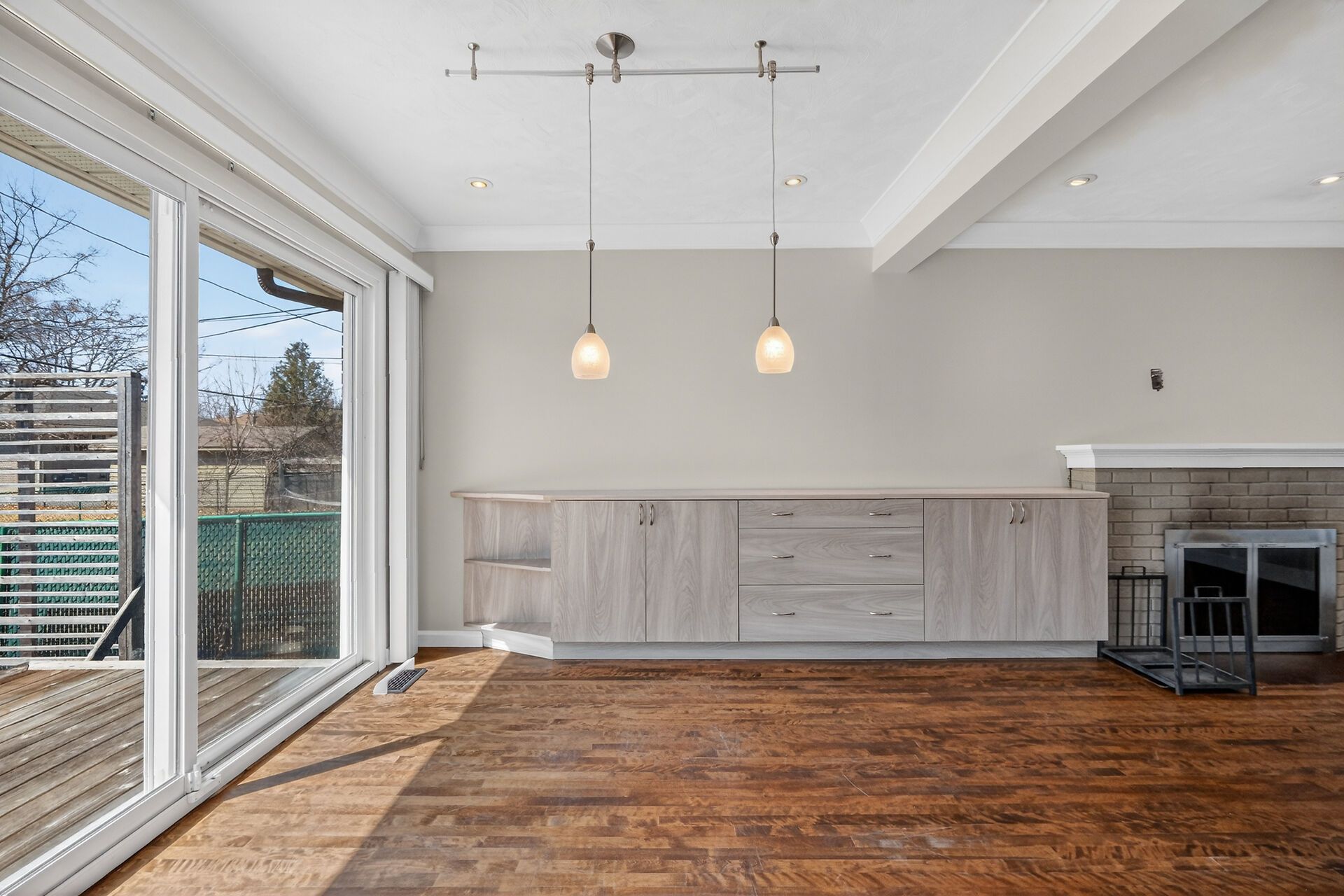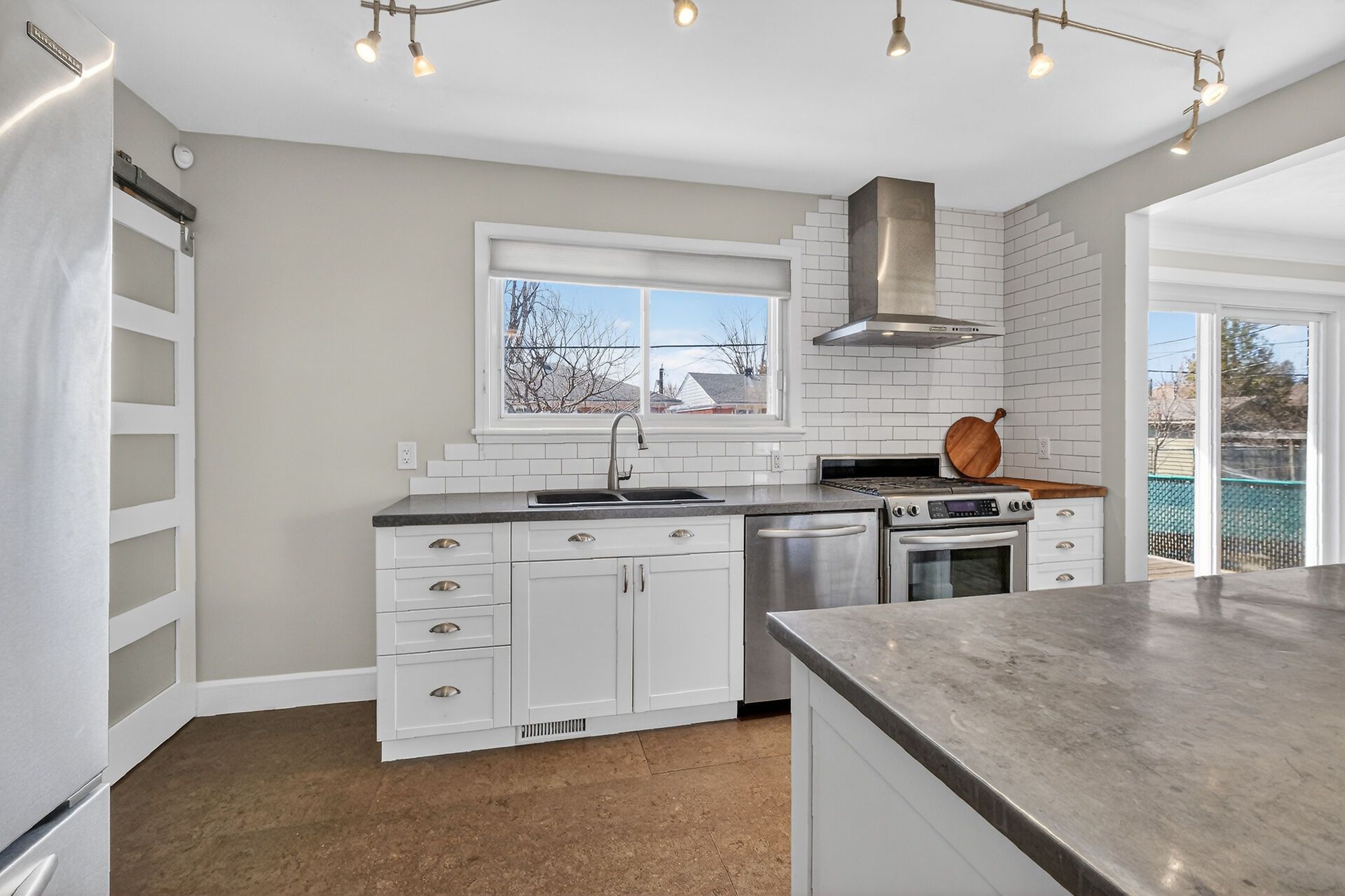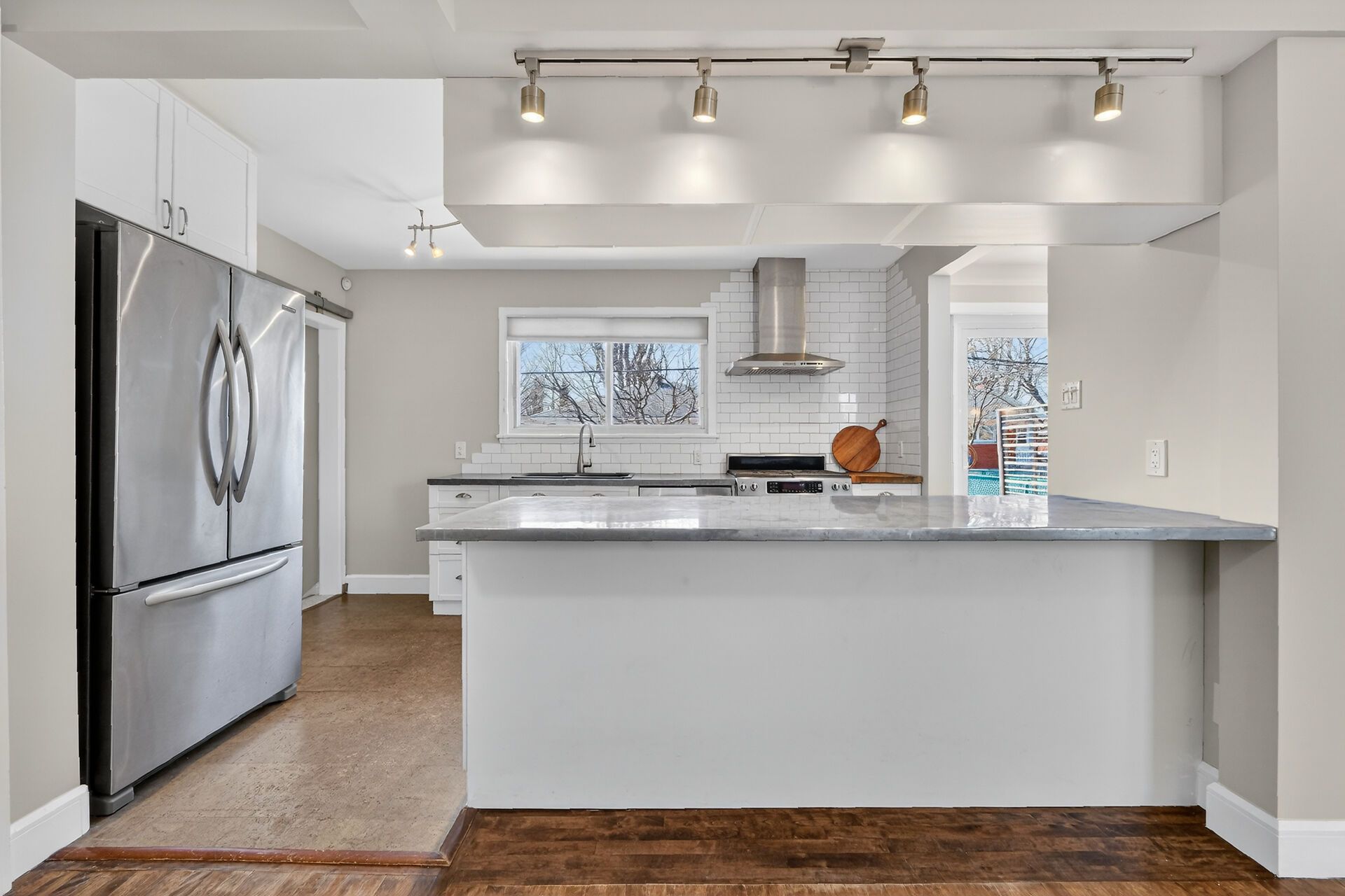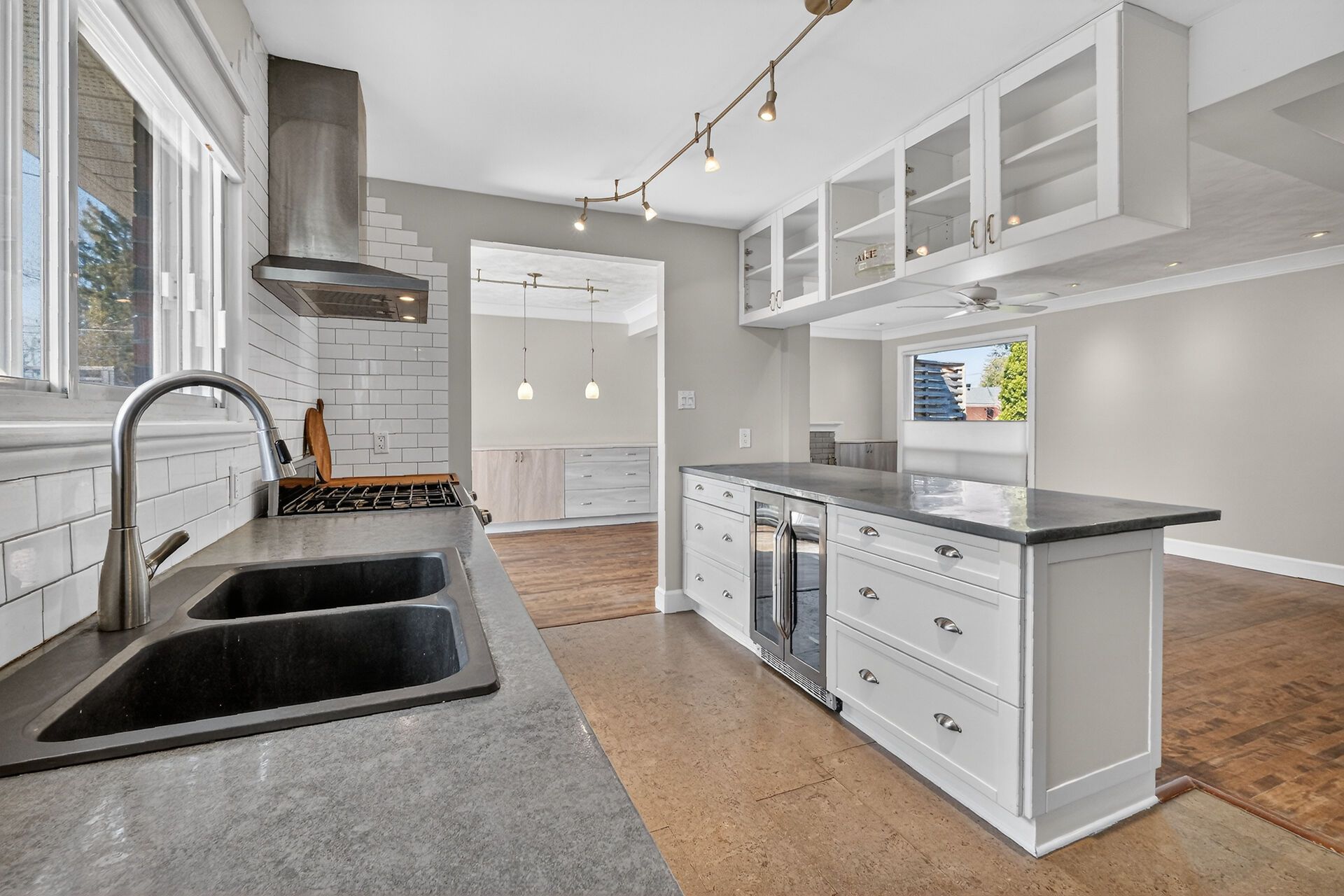 • Renovated kitchen with stainless steel appliances and a breakfast bar.