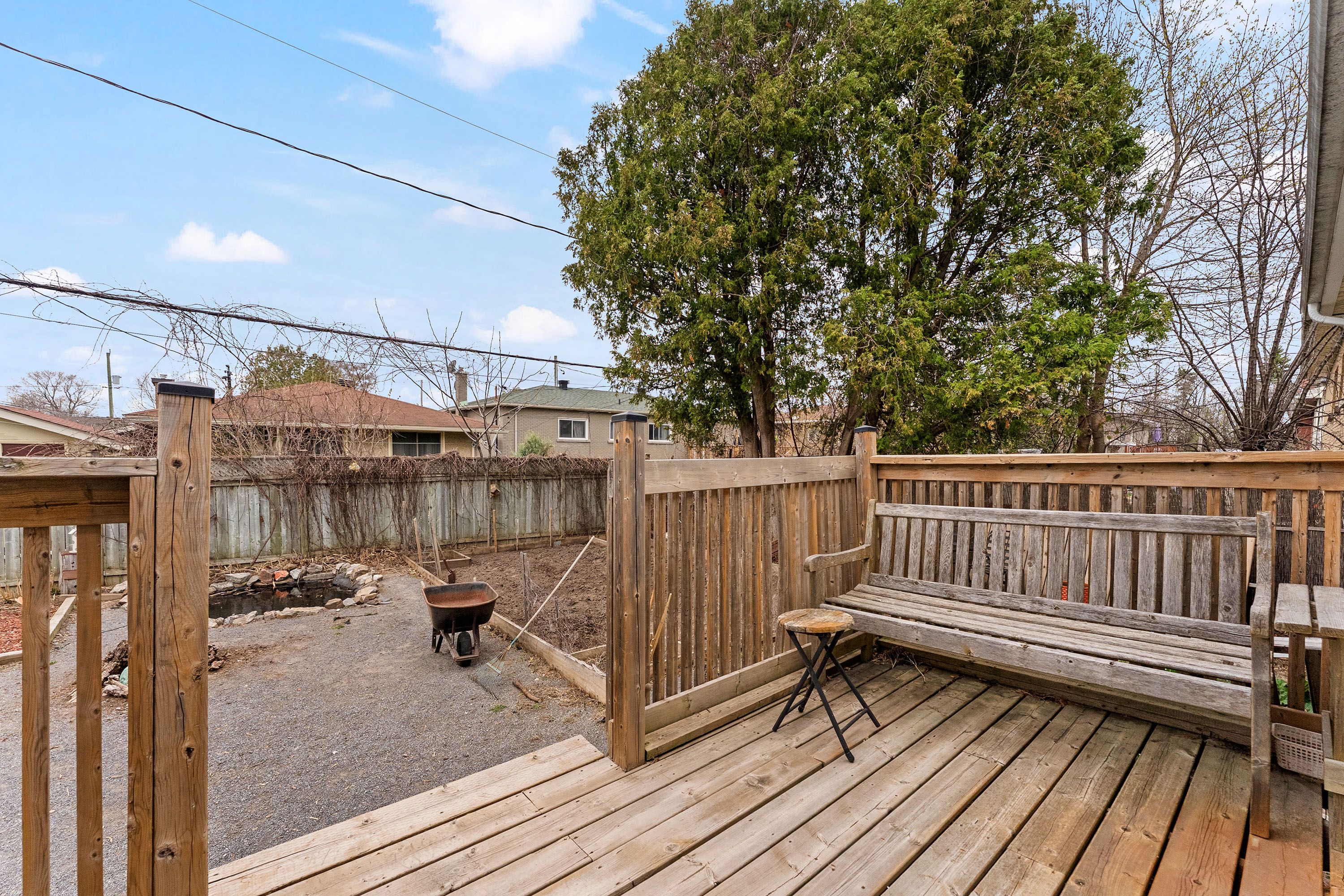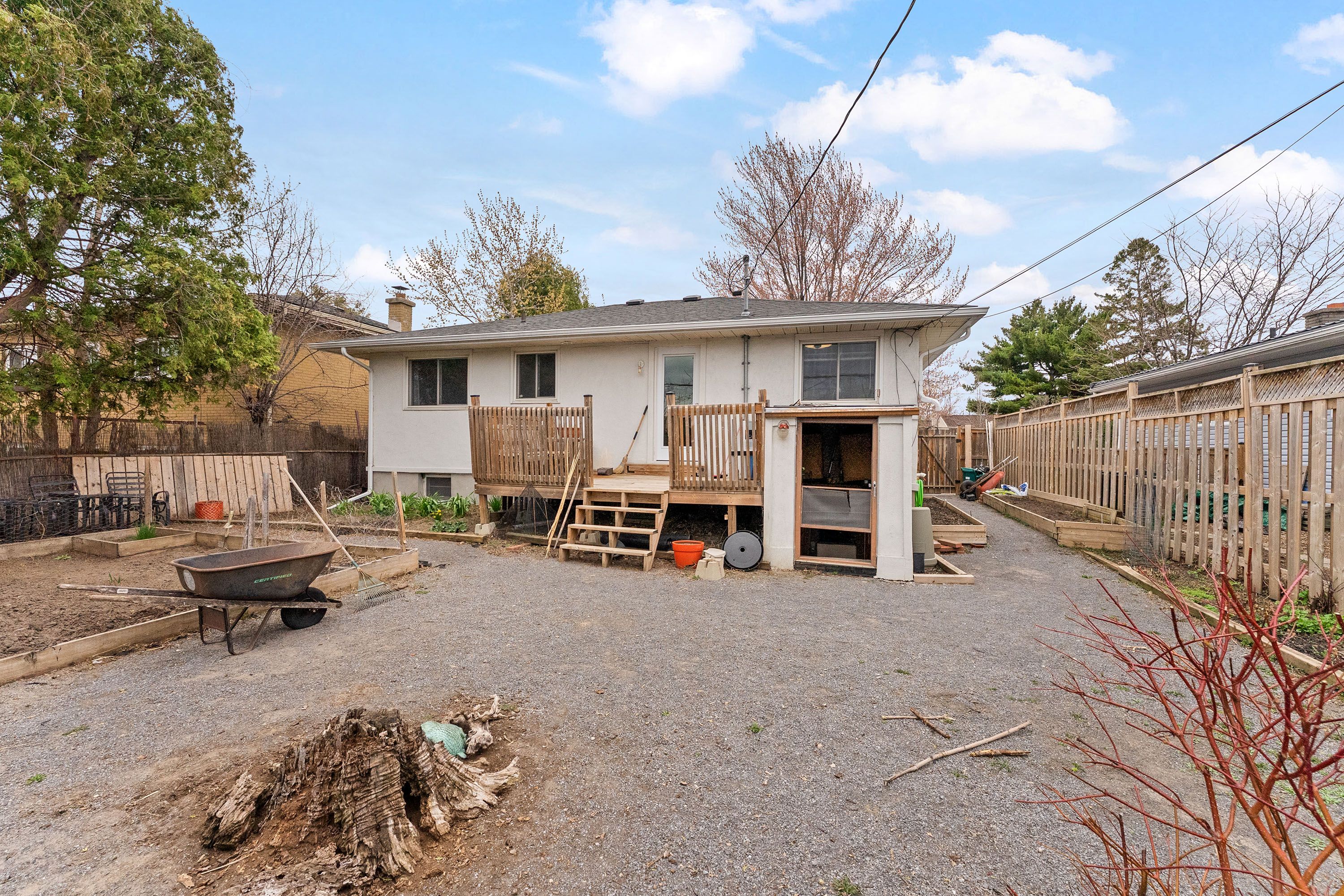 • Sun-drenched backyard with raised garden beds for outdoor activities.