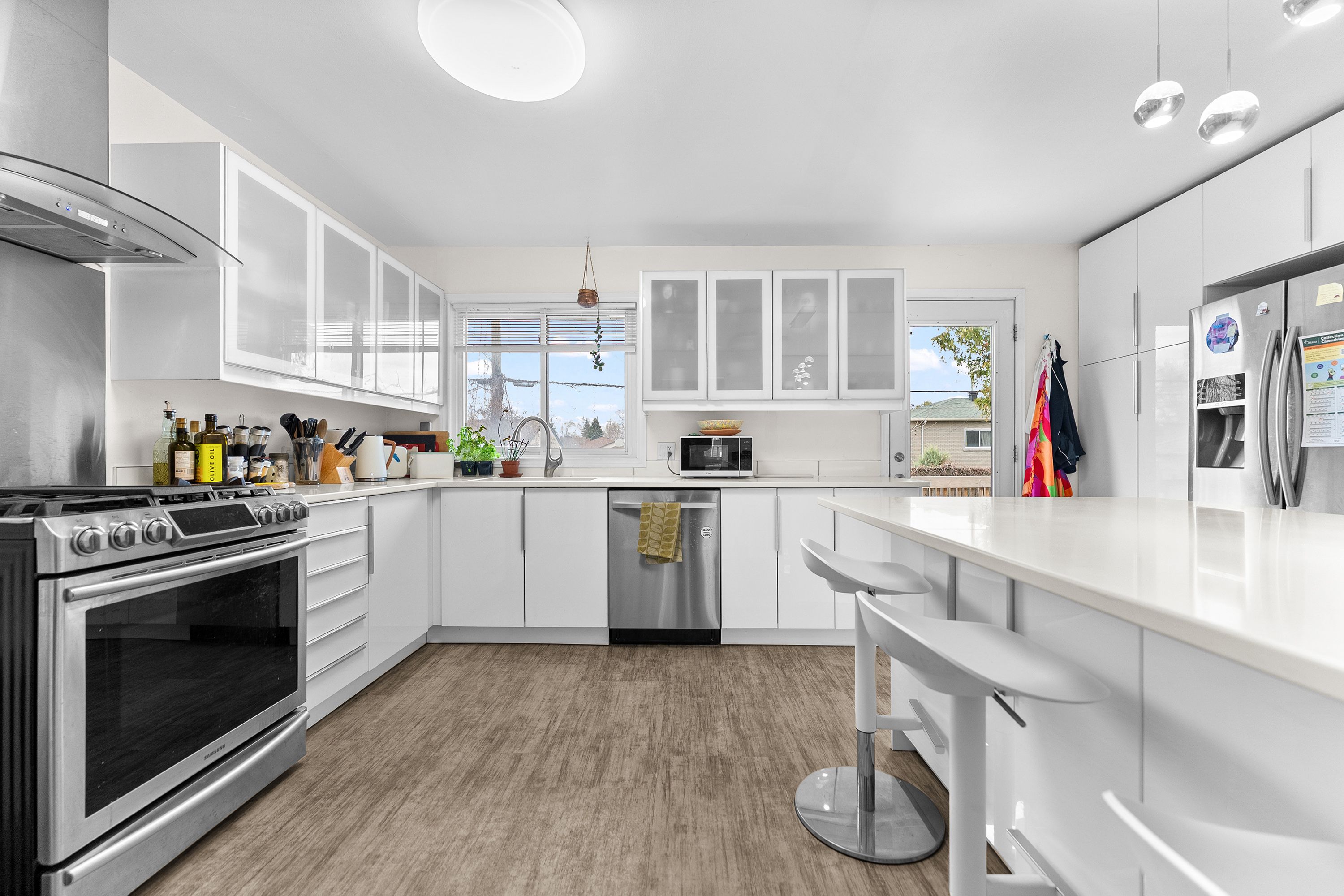 • Spacious kitchen with a gas range, perfect for family meal preparation.