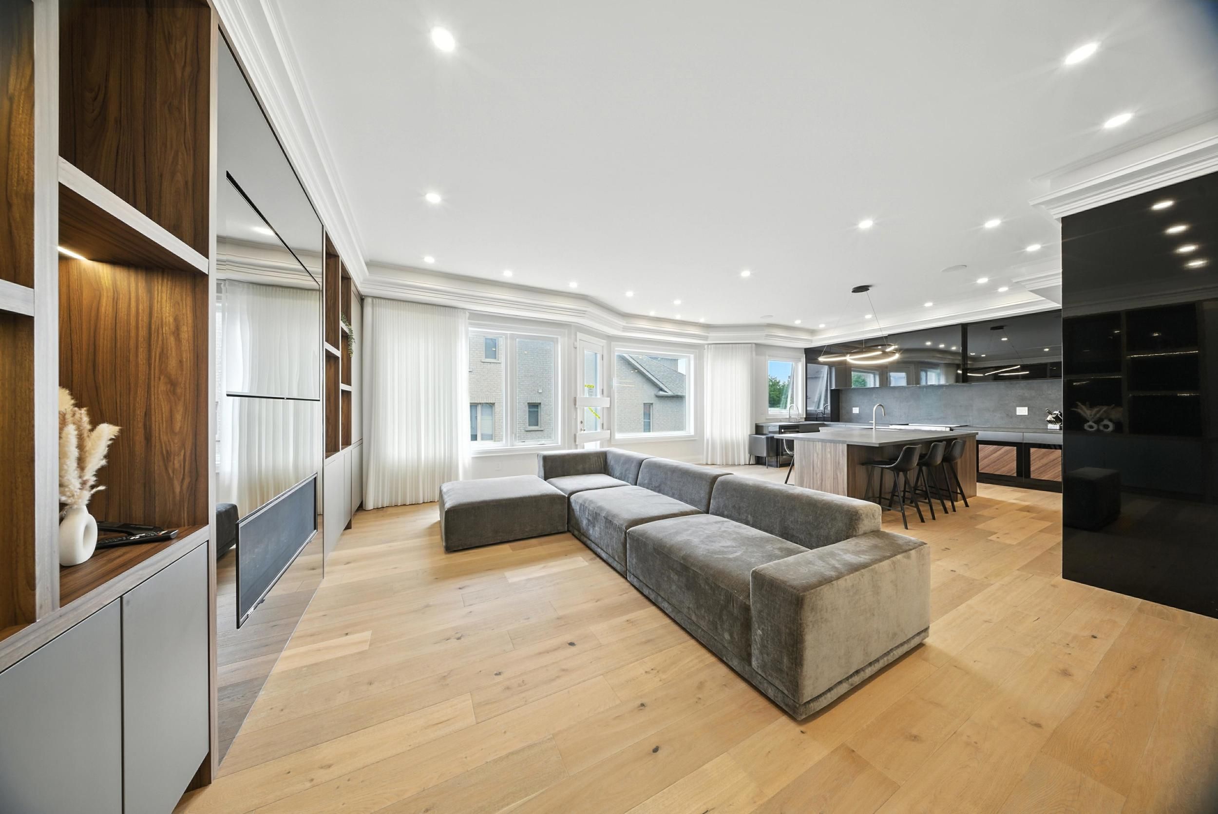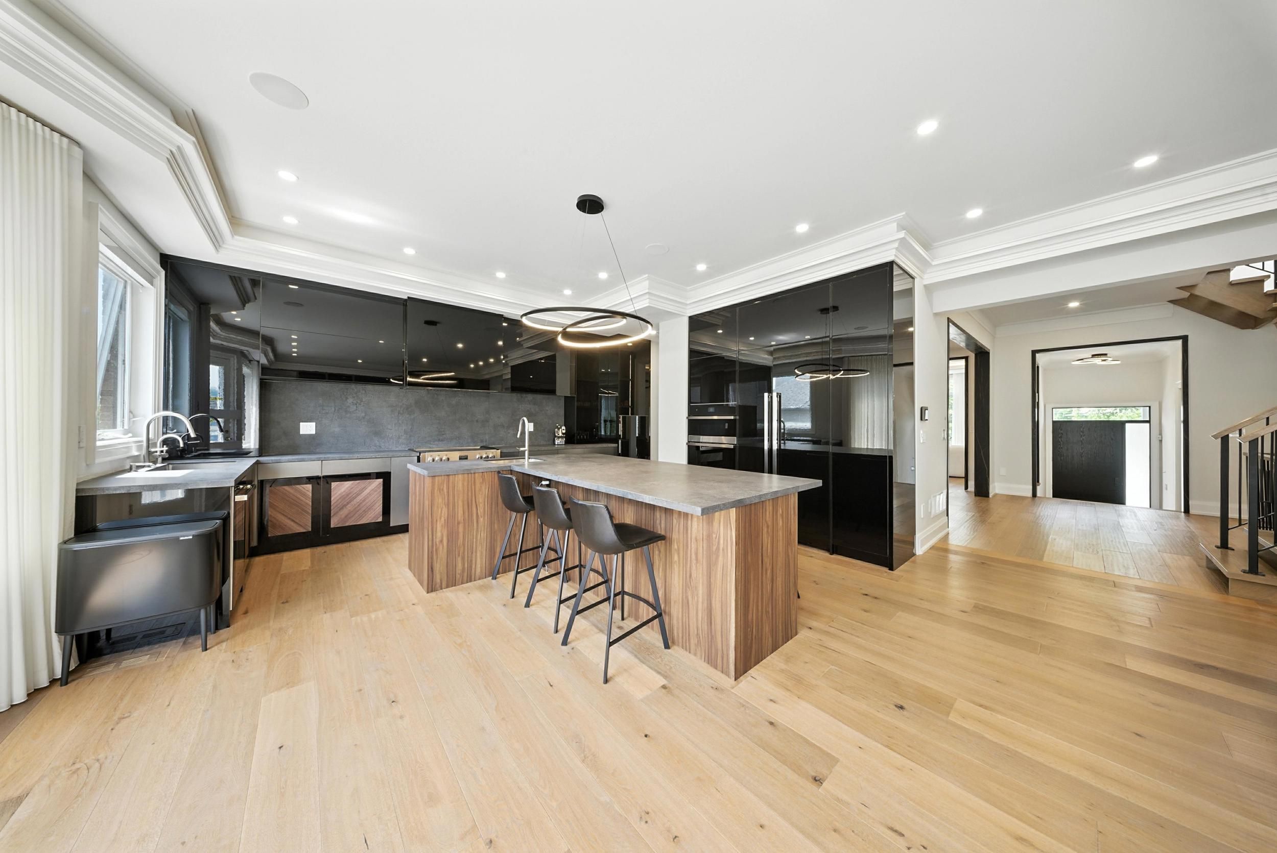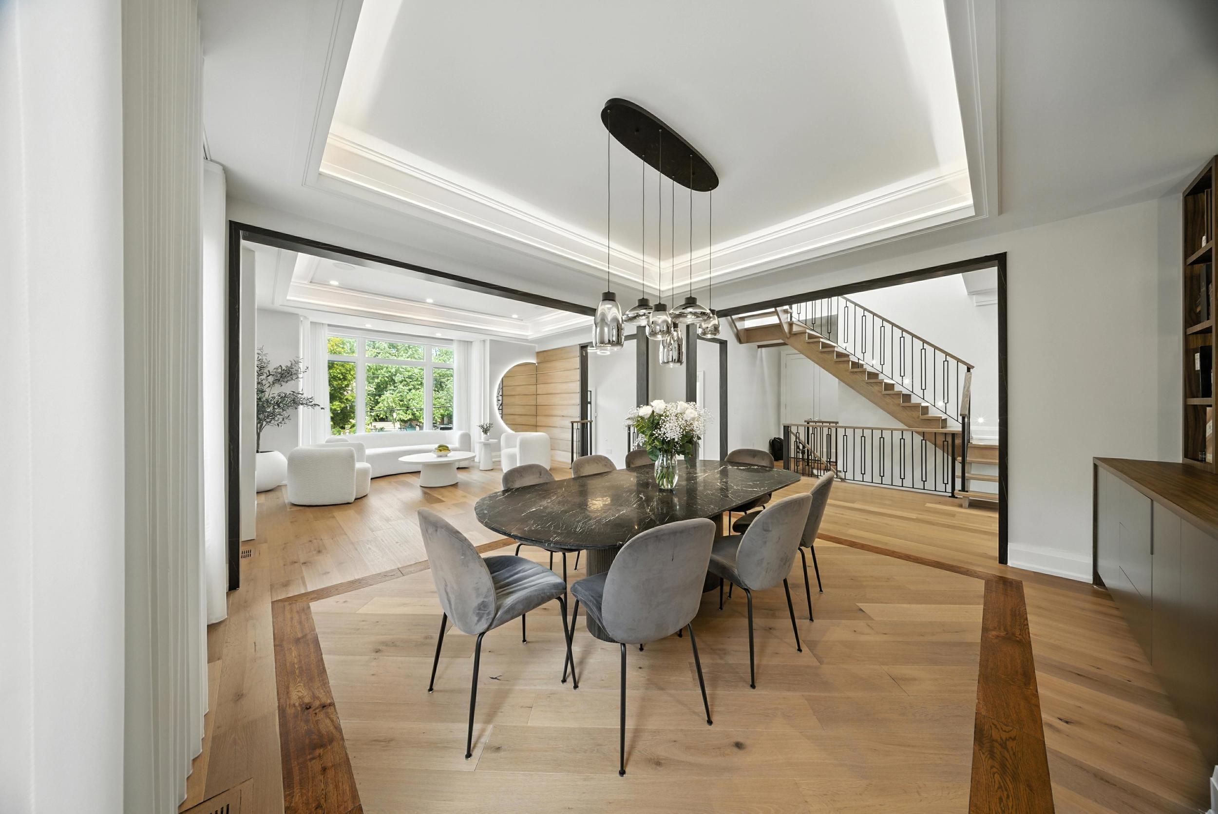• High-end custom kitchen and elegant living/dining areas.