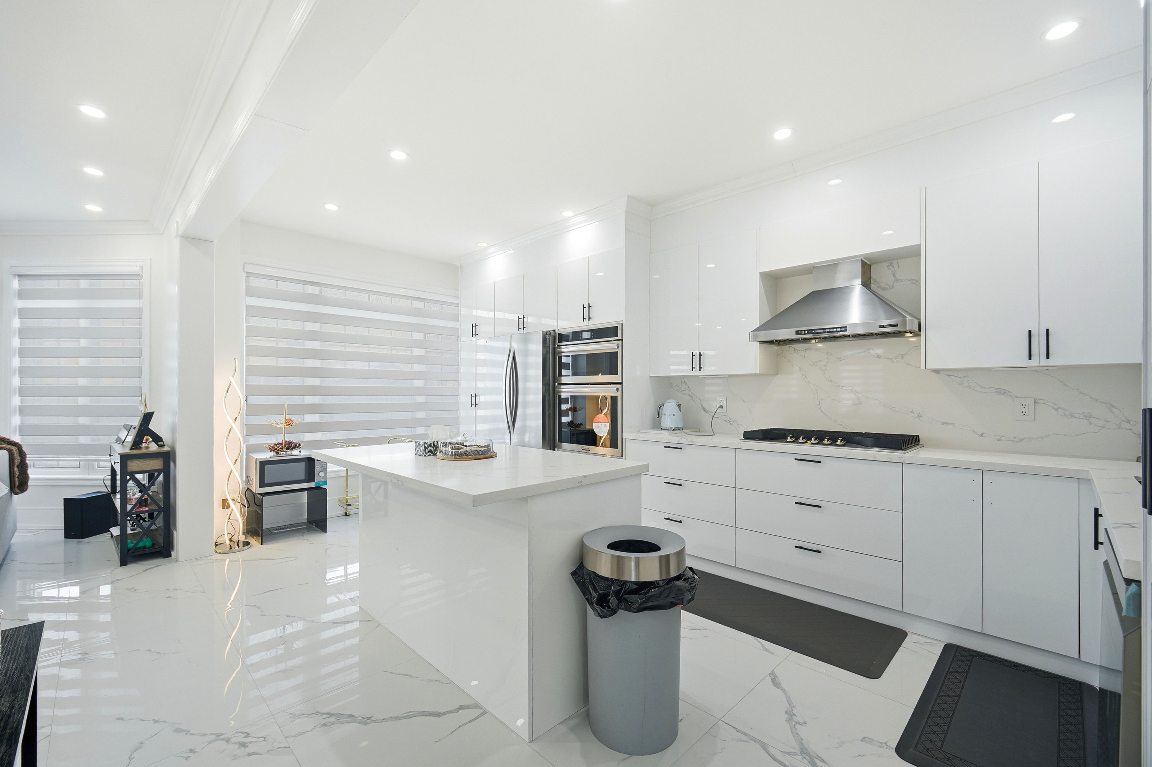 • Modern kitchen with quartz countertops and stainless steel appliances.