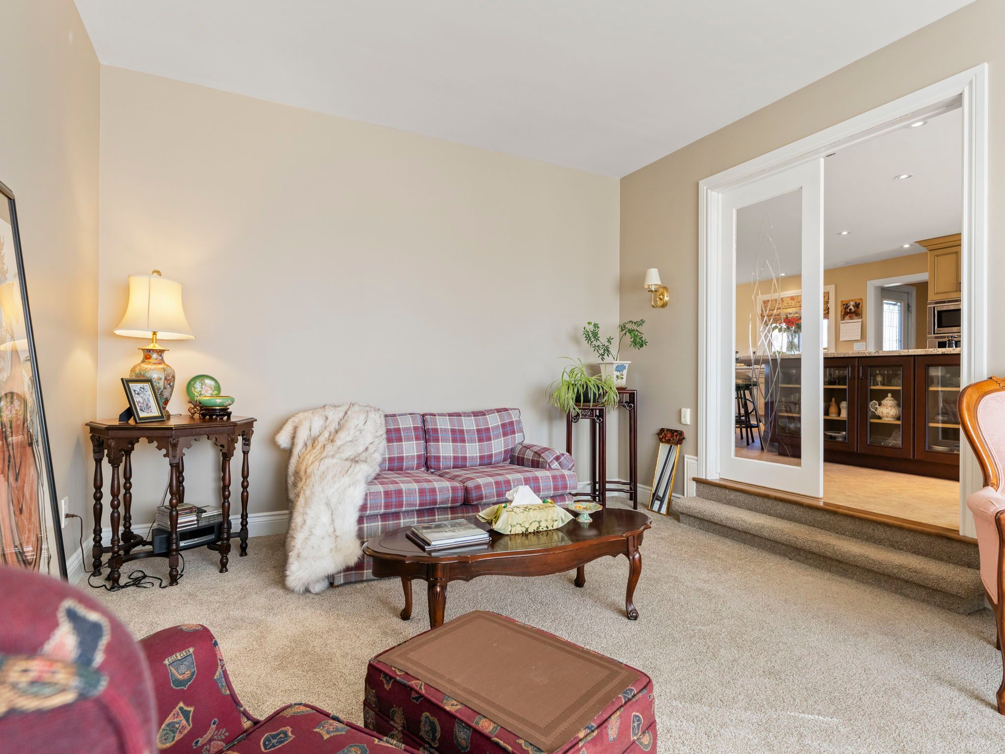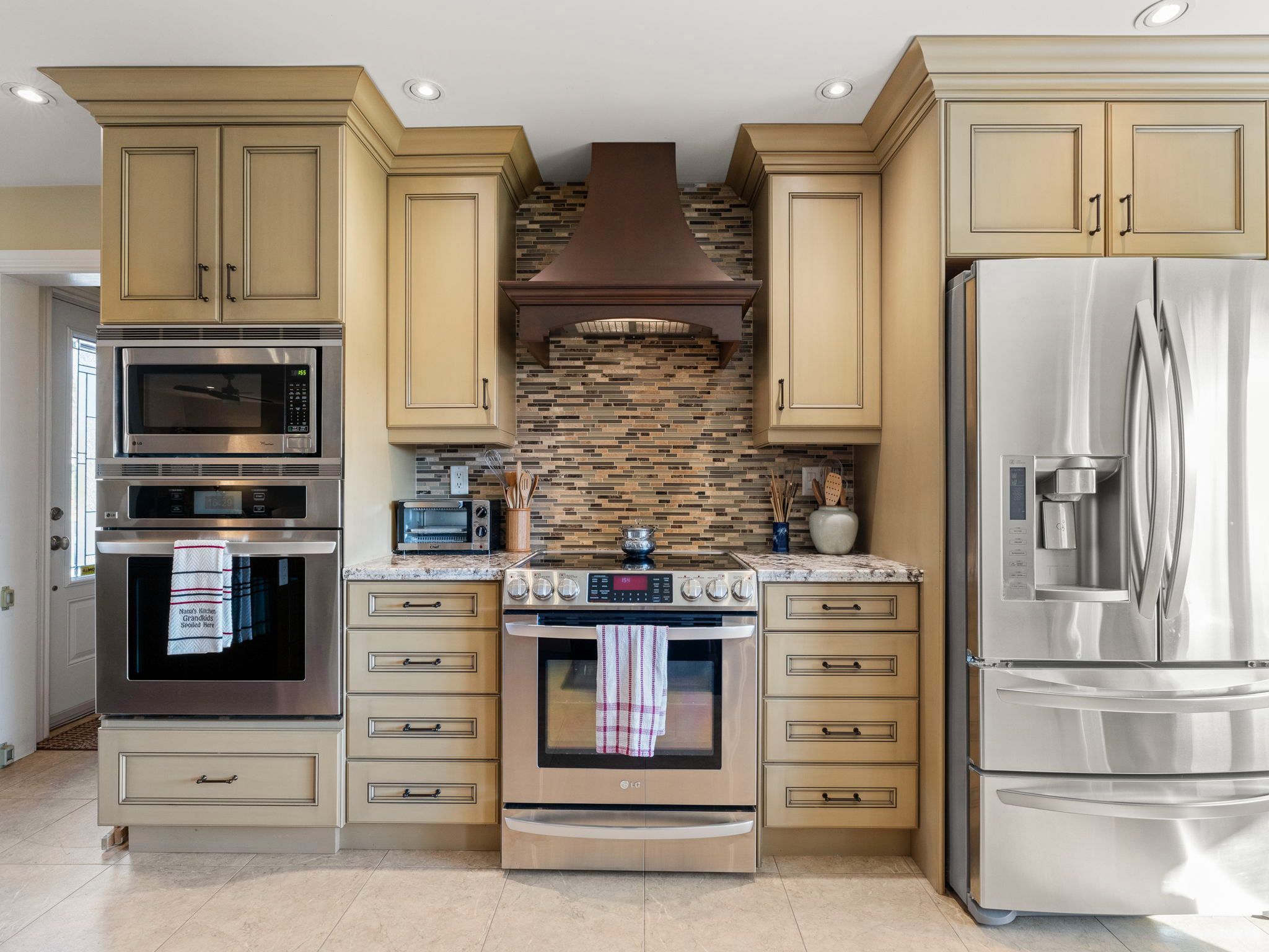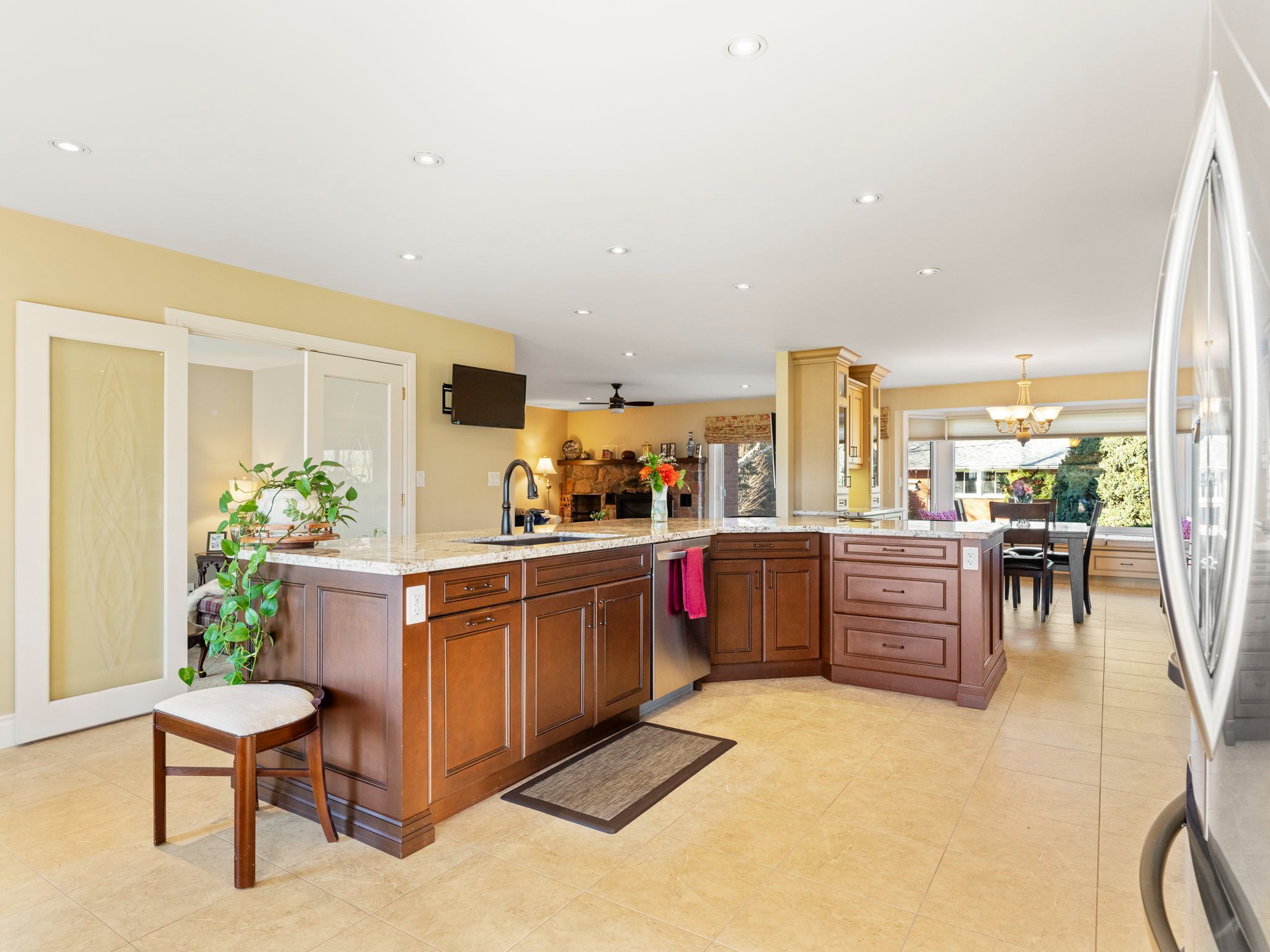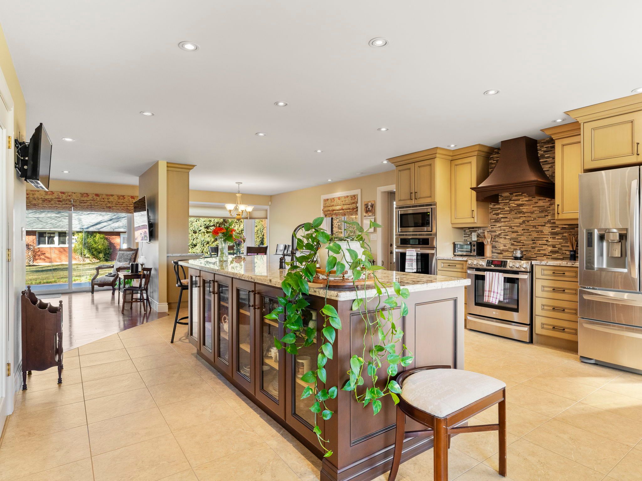 • Updated family kitchen with built-in ovens and a spacious work island.