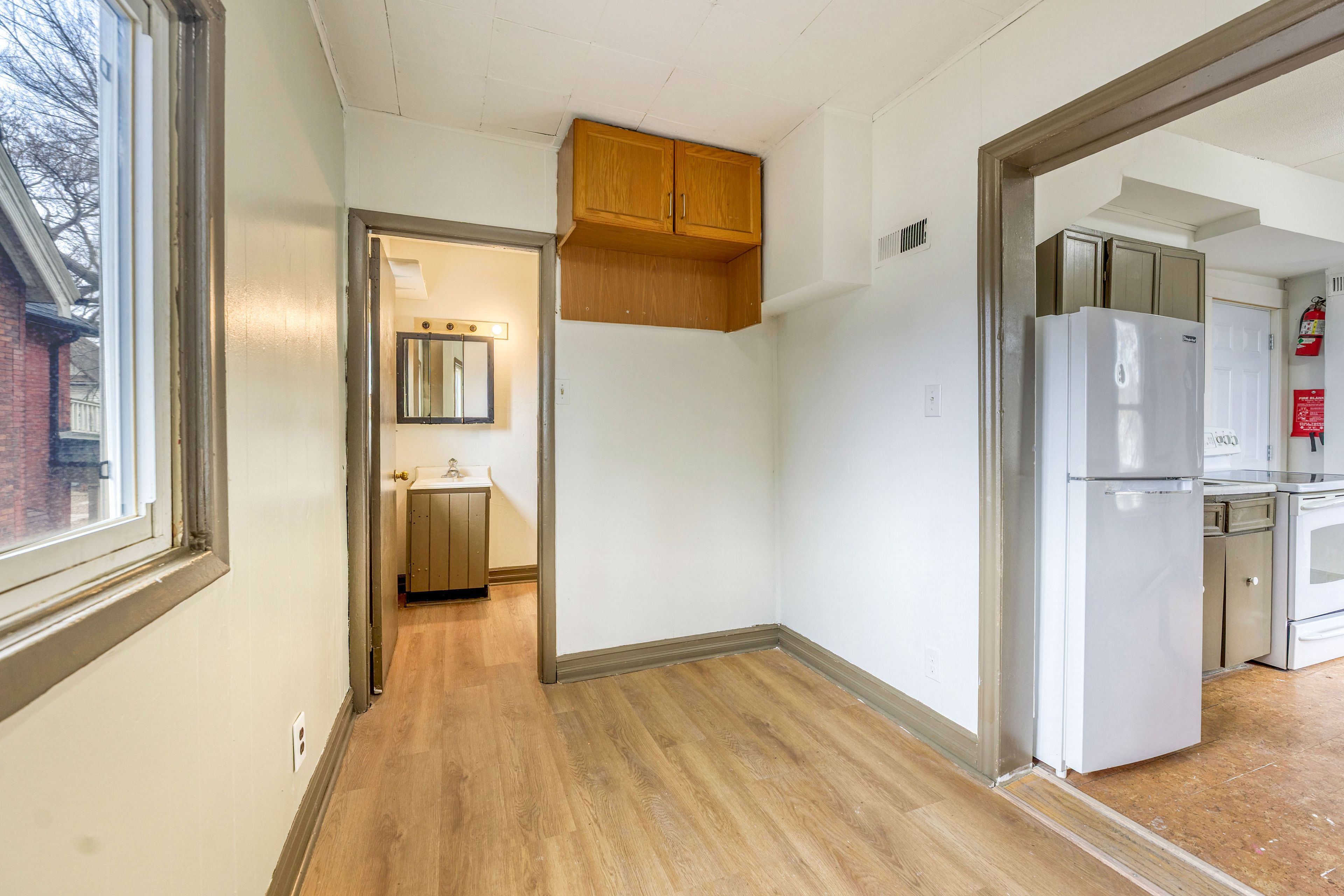 • Cozy kitchen equipped with fridge and stove for convenience.