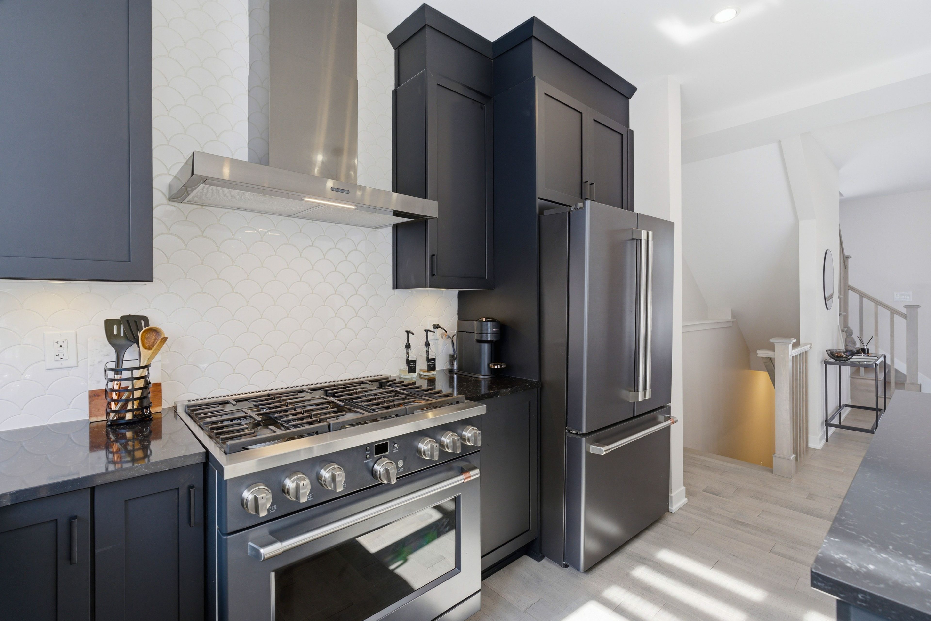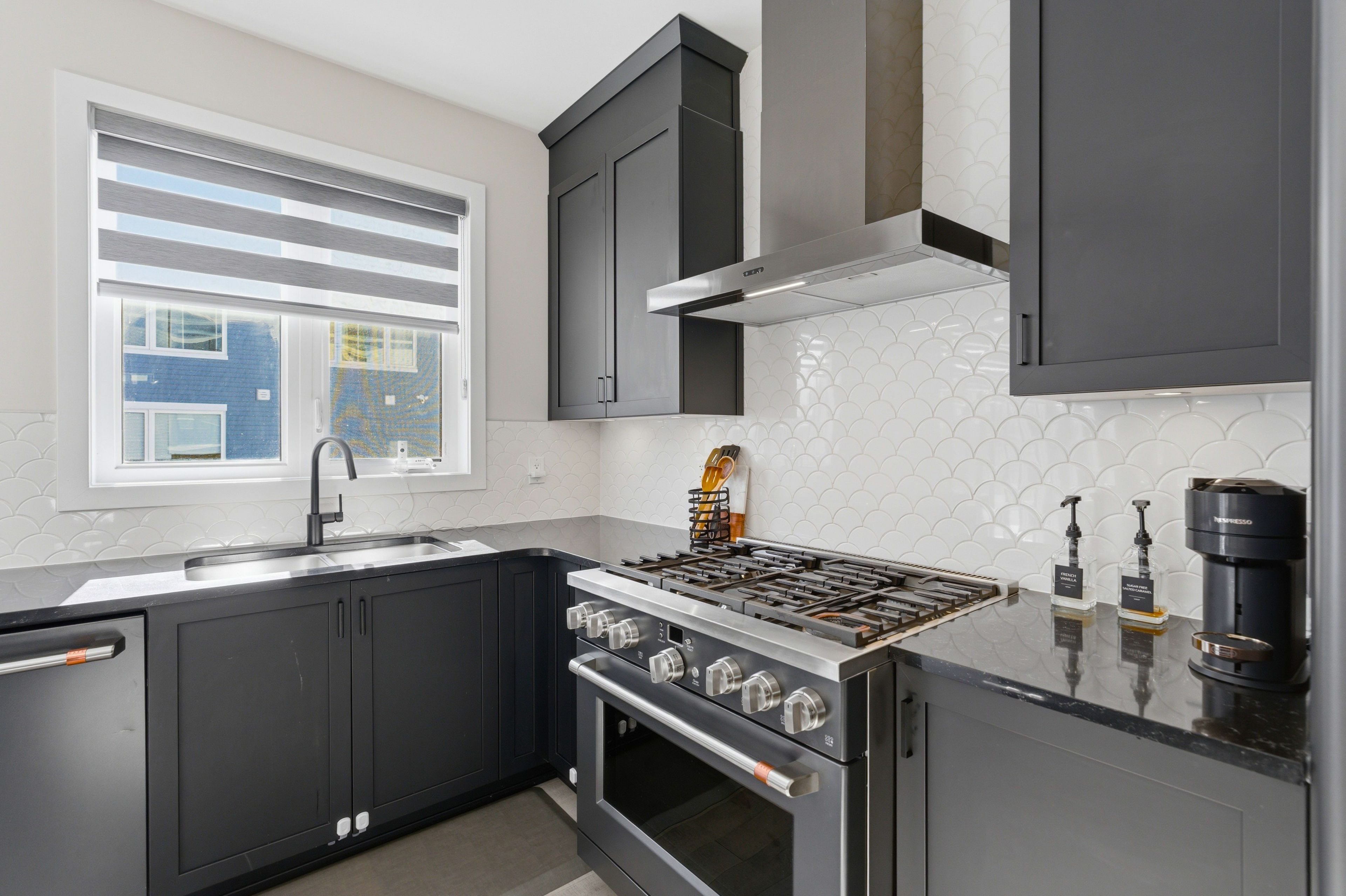 • Well-designed kitchen with dark cabinetry, granite countertops, and modern appliances.
