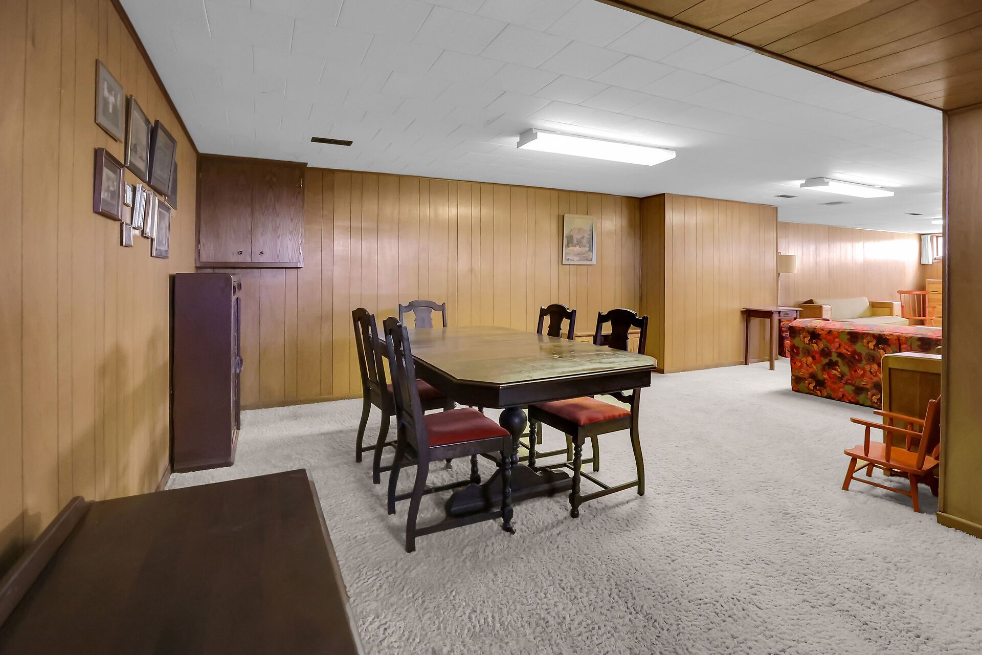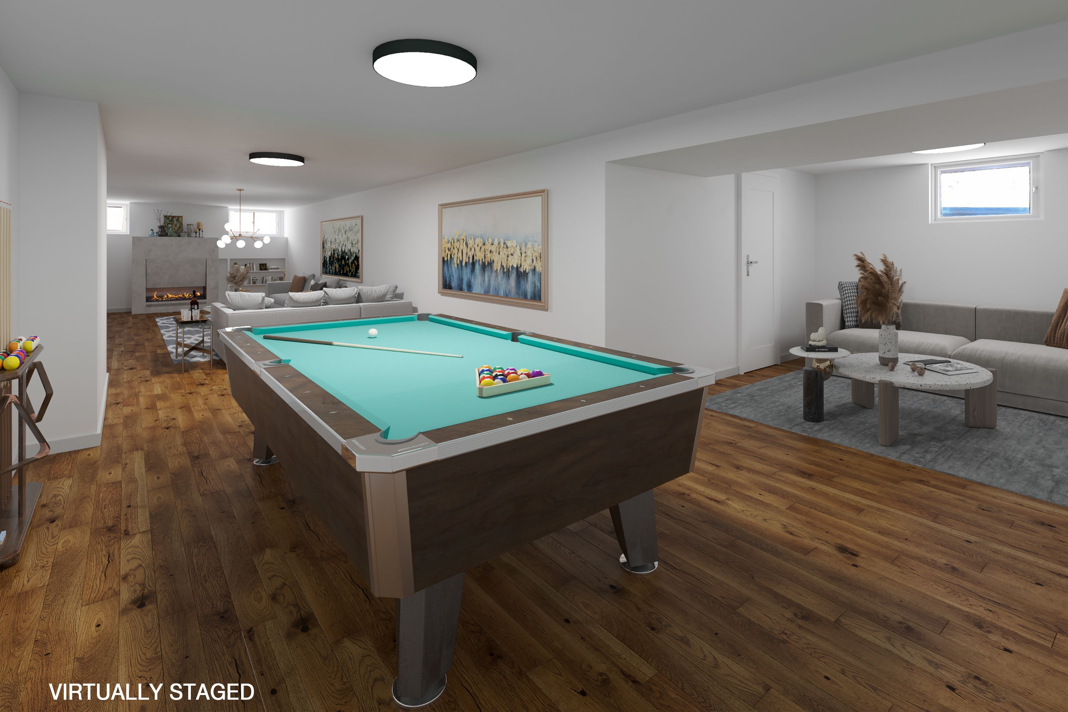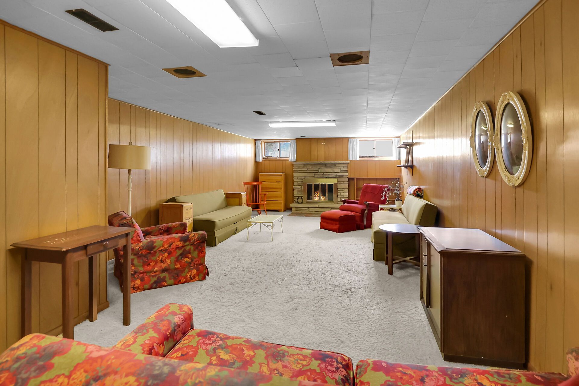 • Lower level features a recreation room with a cozy fireplace.