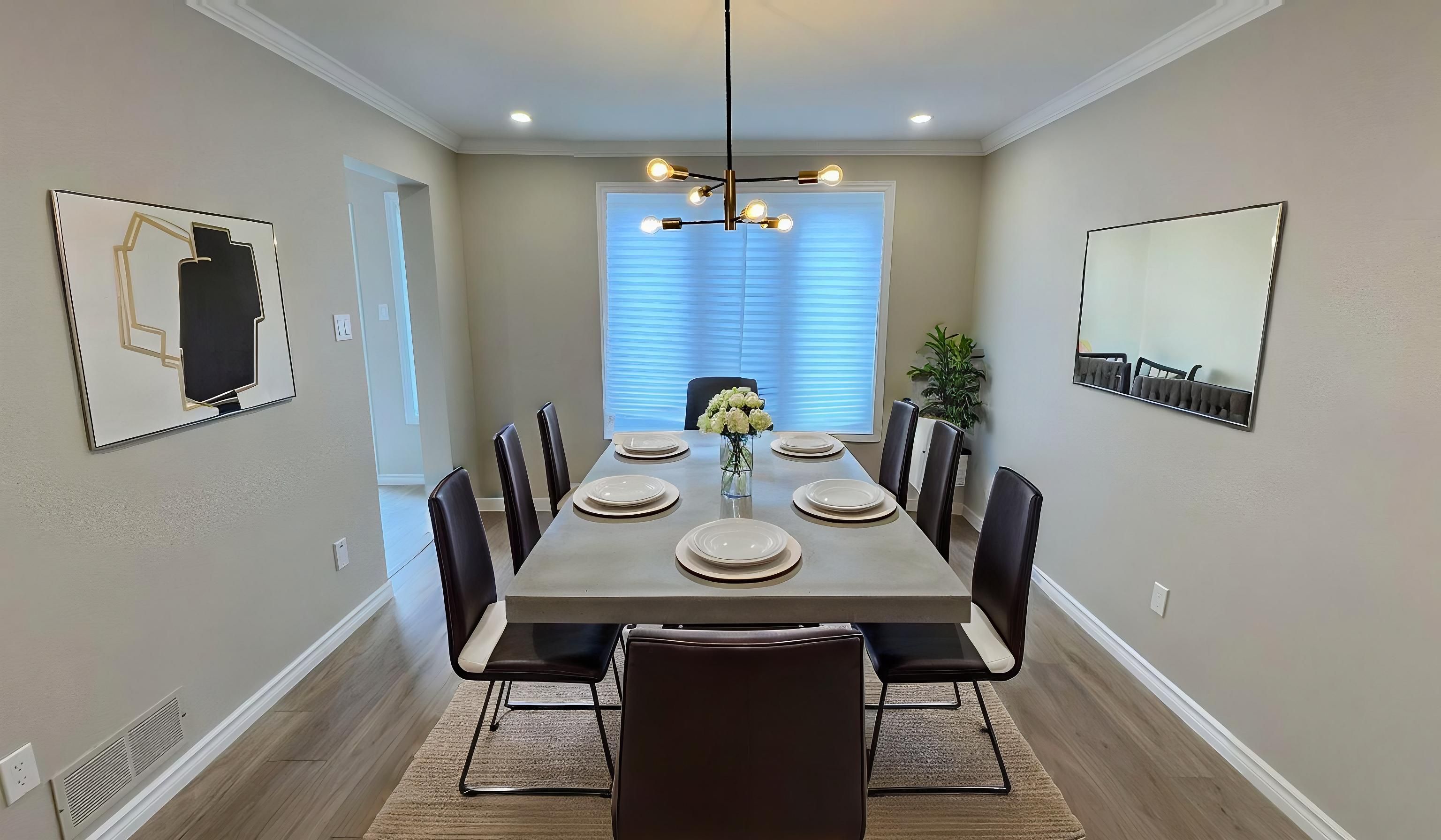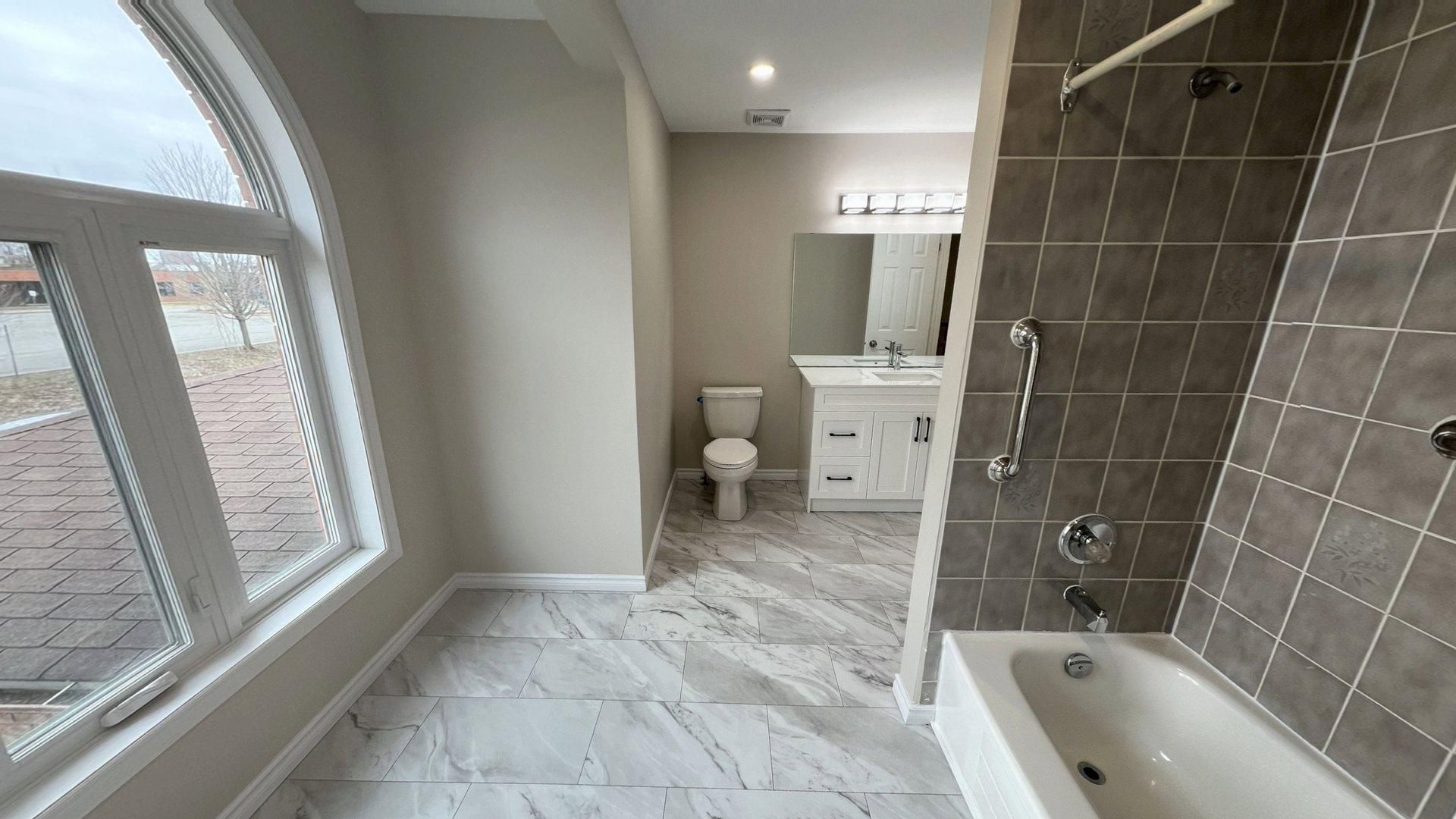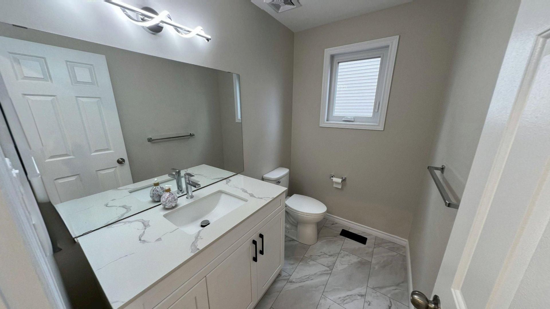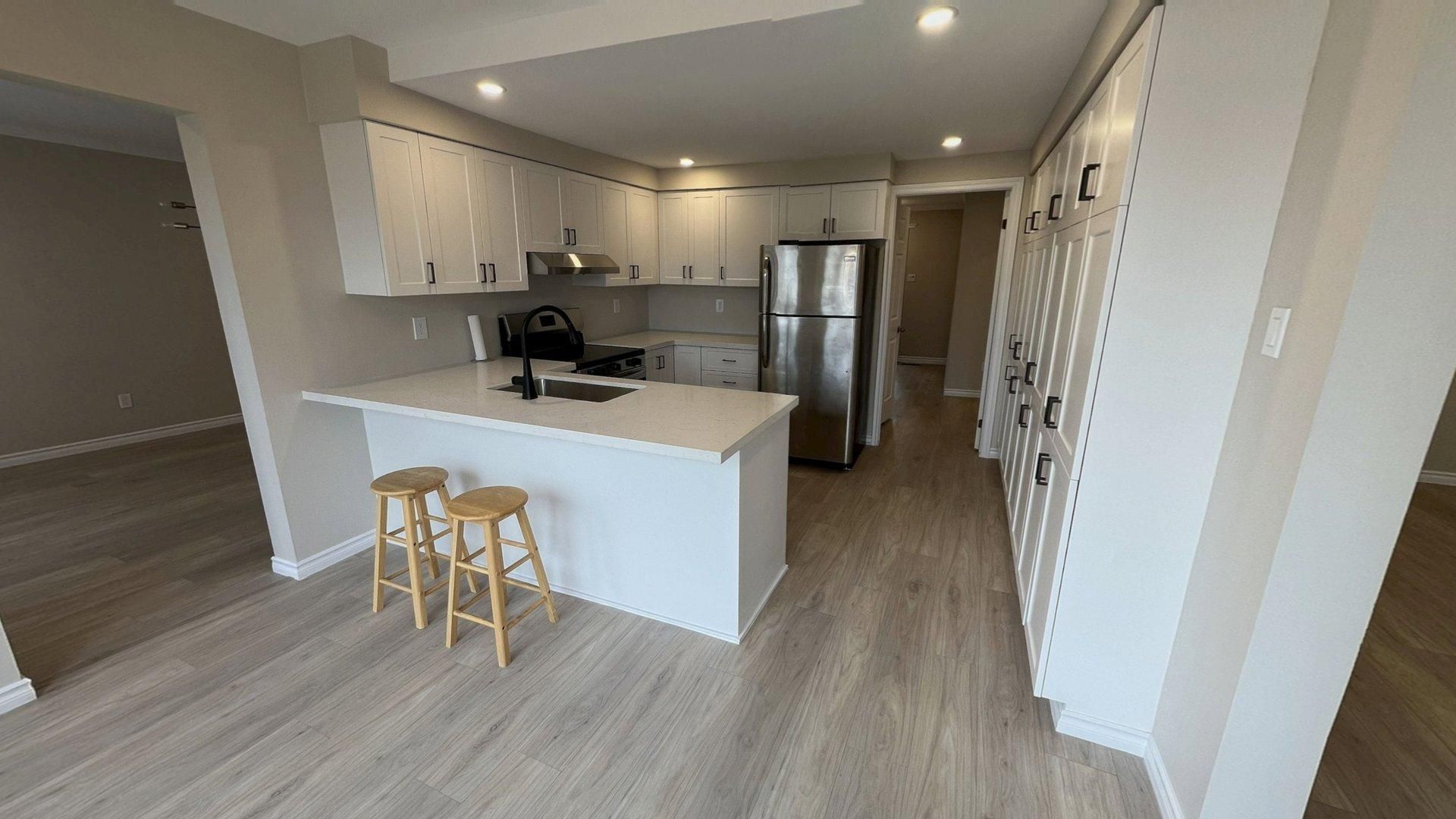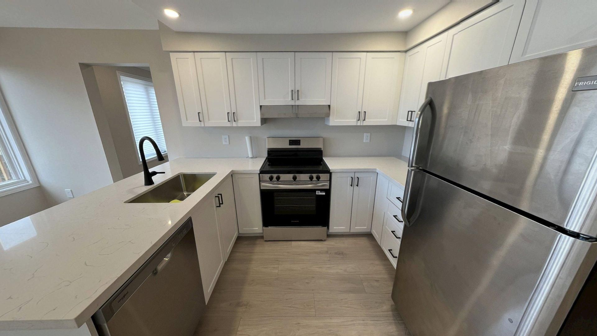 • Recent renovations including a modern kitchen with quartz countertops.