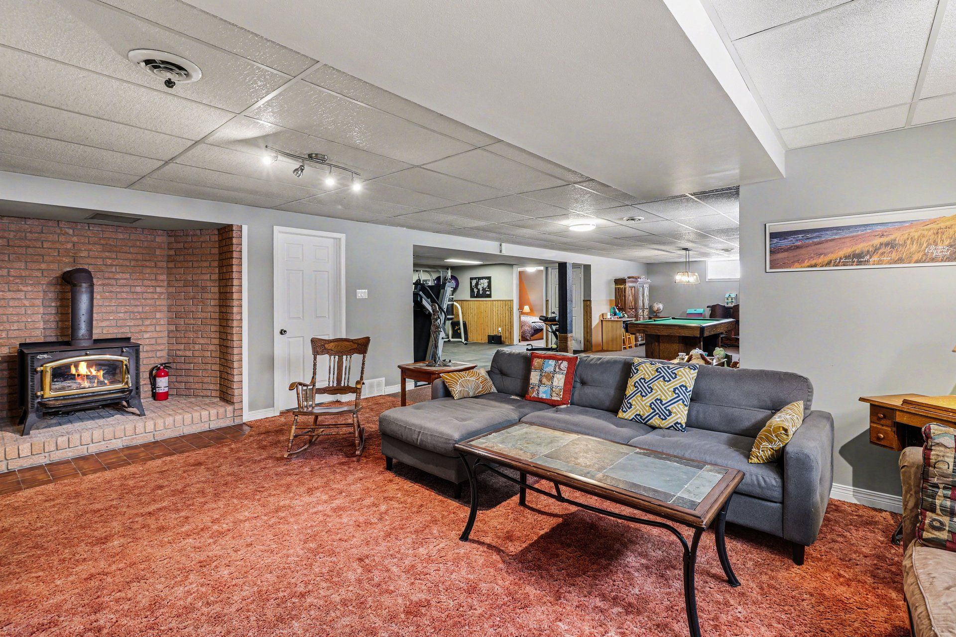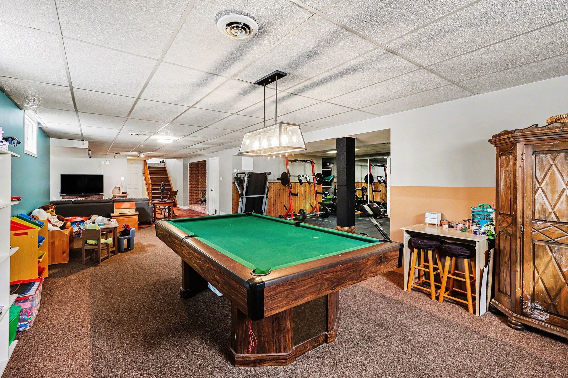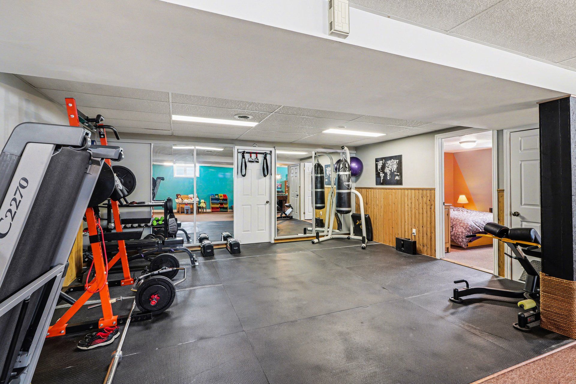 • Finished basement features a home gym, kitchenette, and soundproof bedroom.