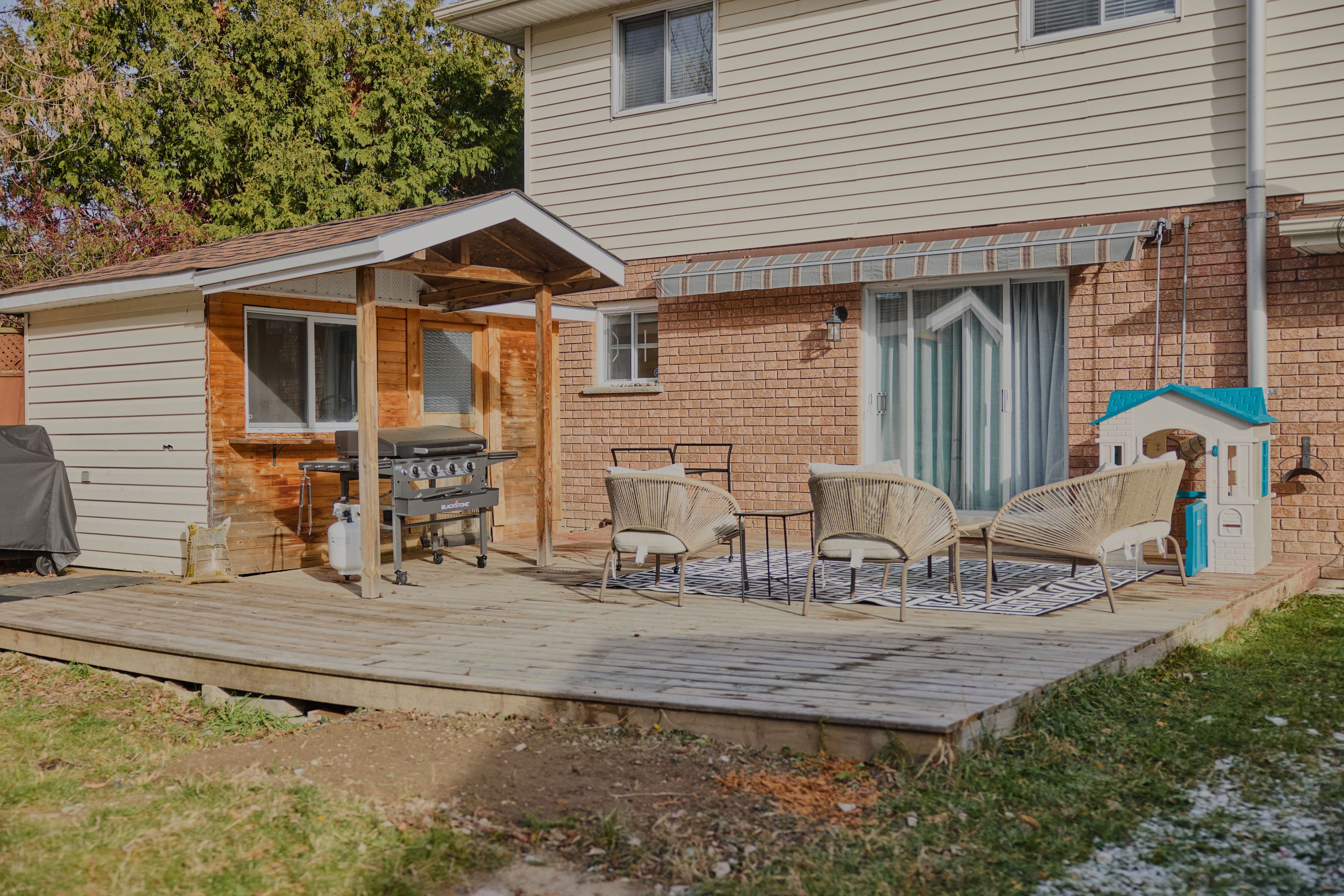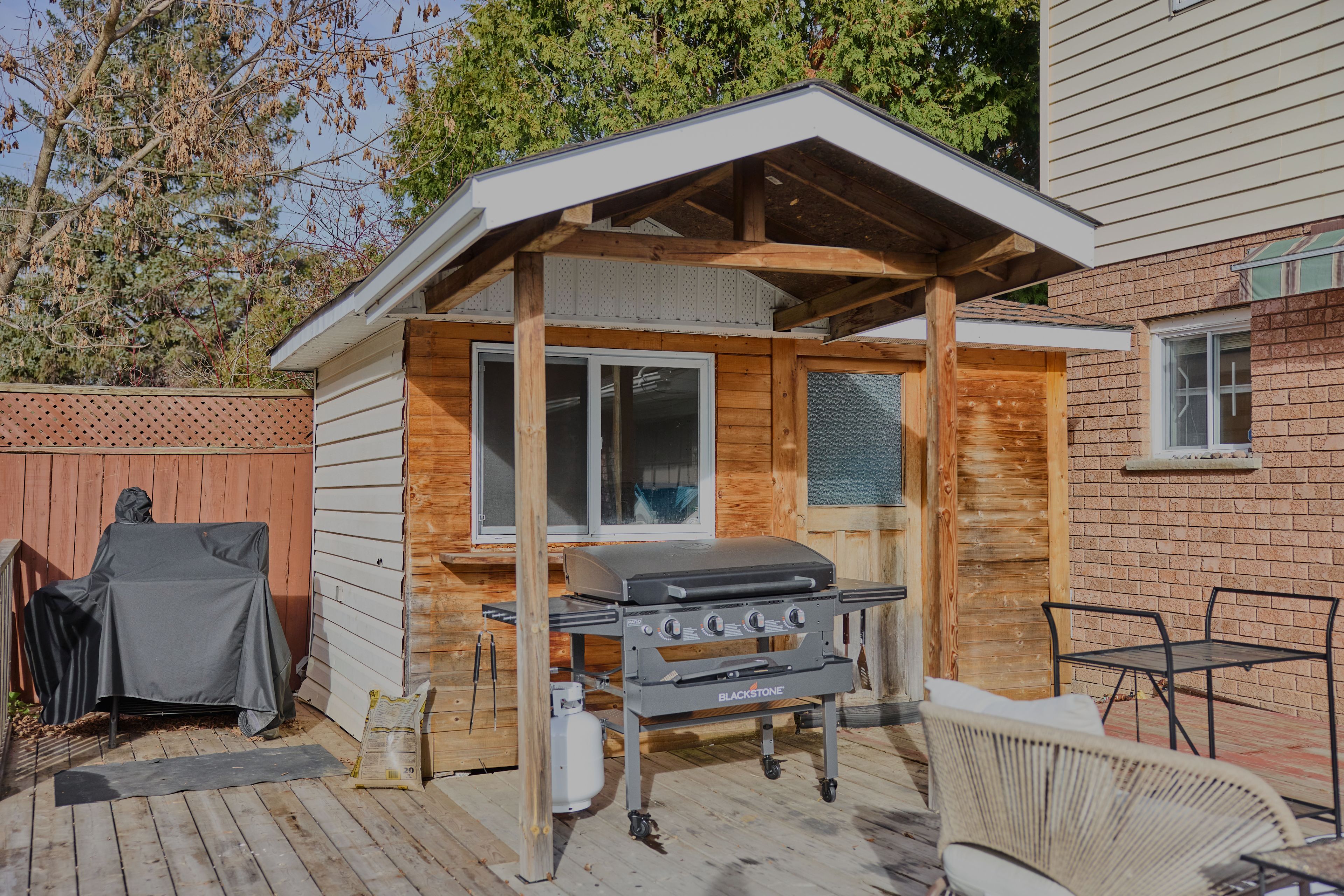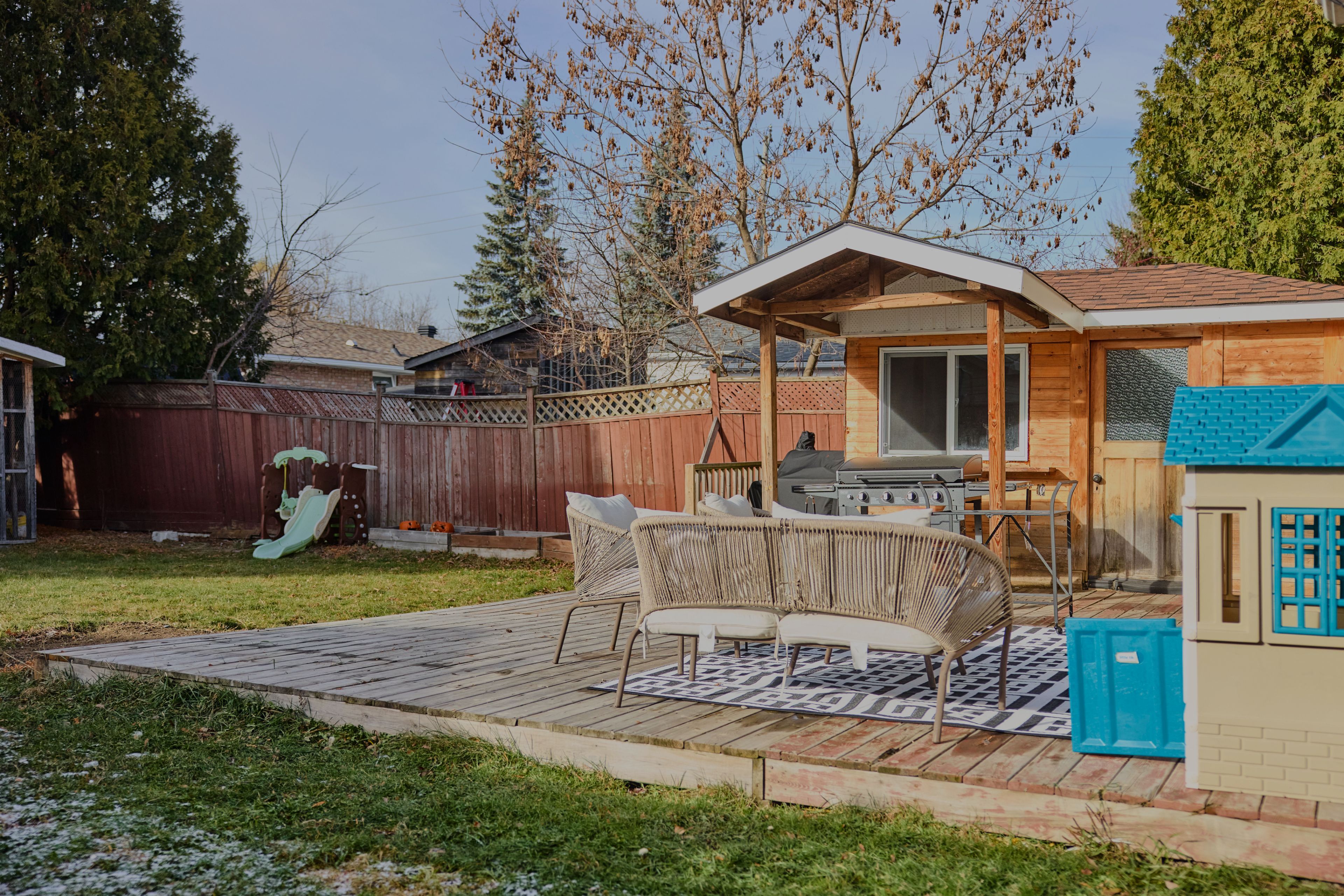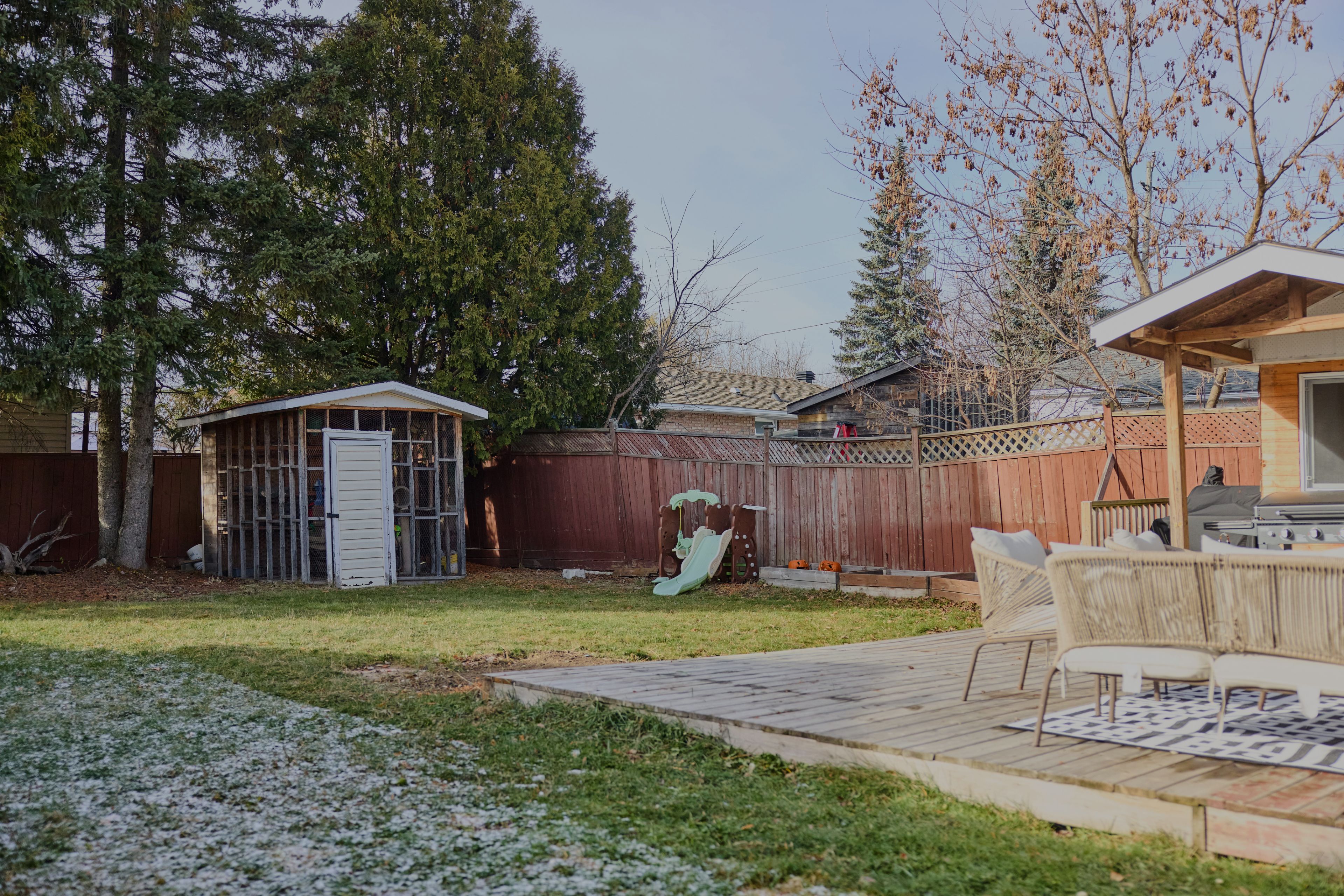 • Fully fenced backyard featuring a large deck and custom-built insulated shed.