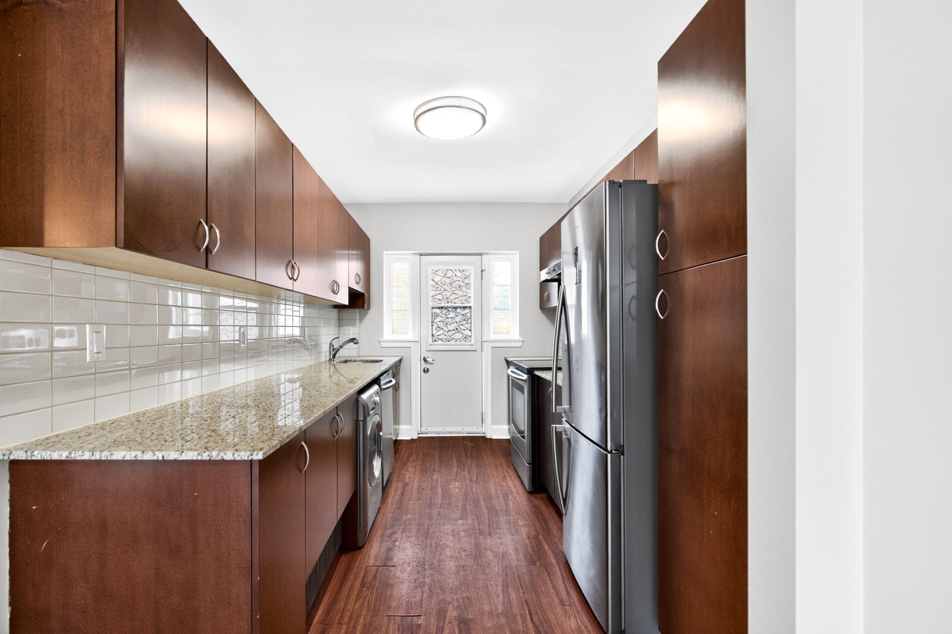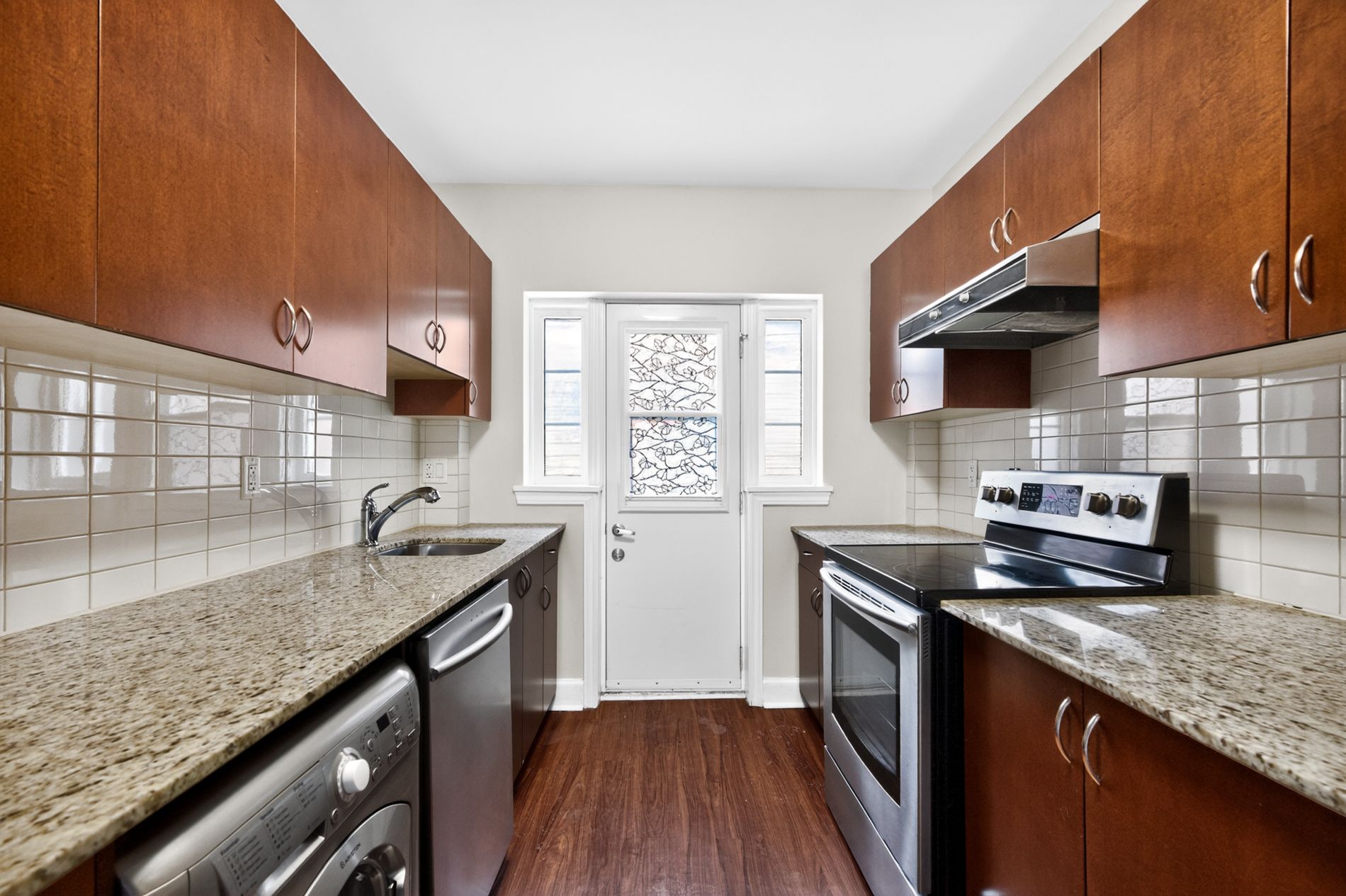 • Modern kitchen with stainless steel appliances and stone countertops.