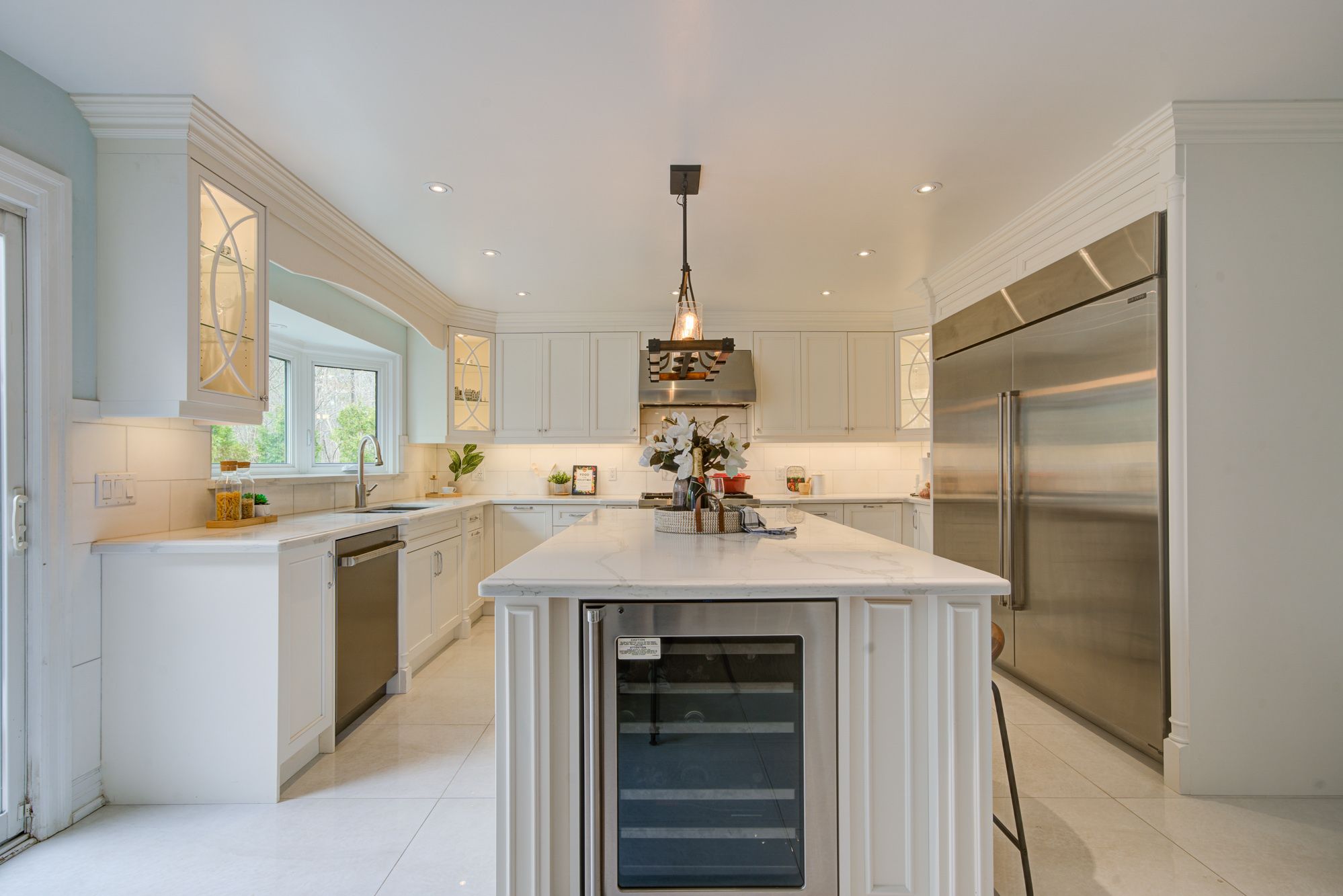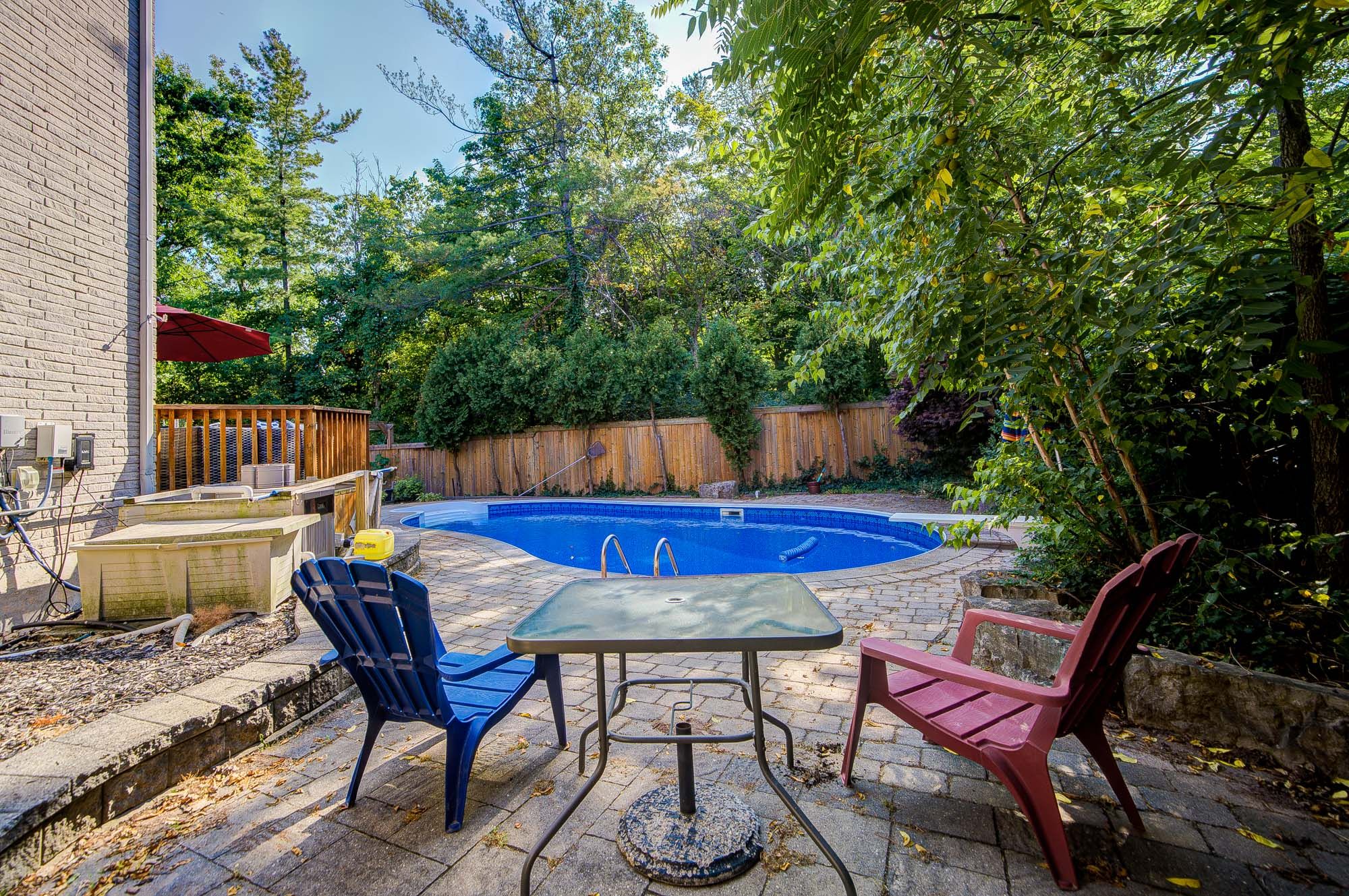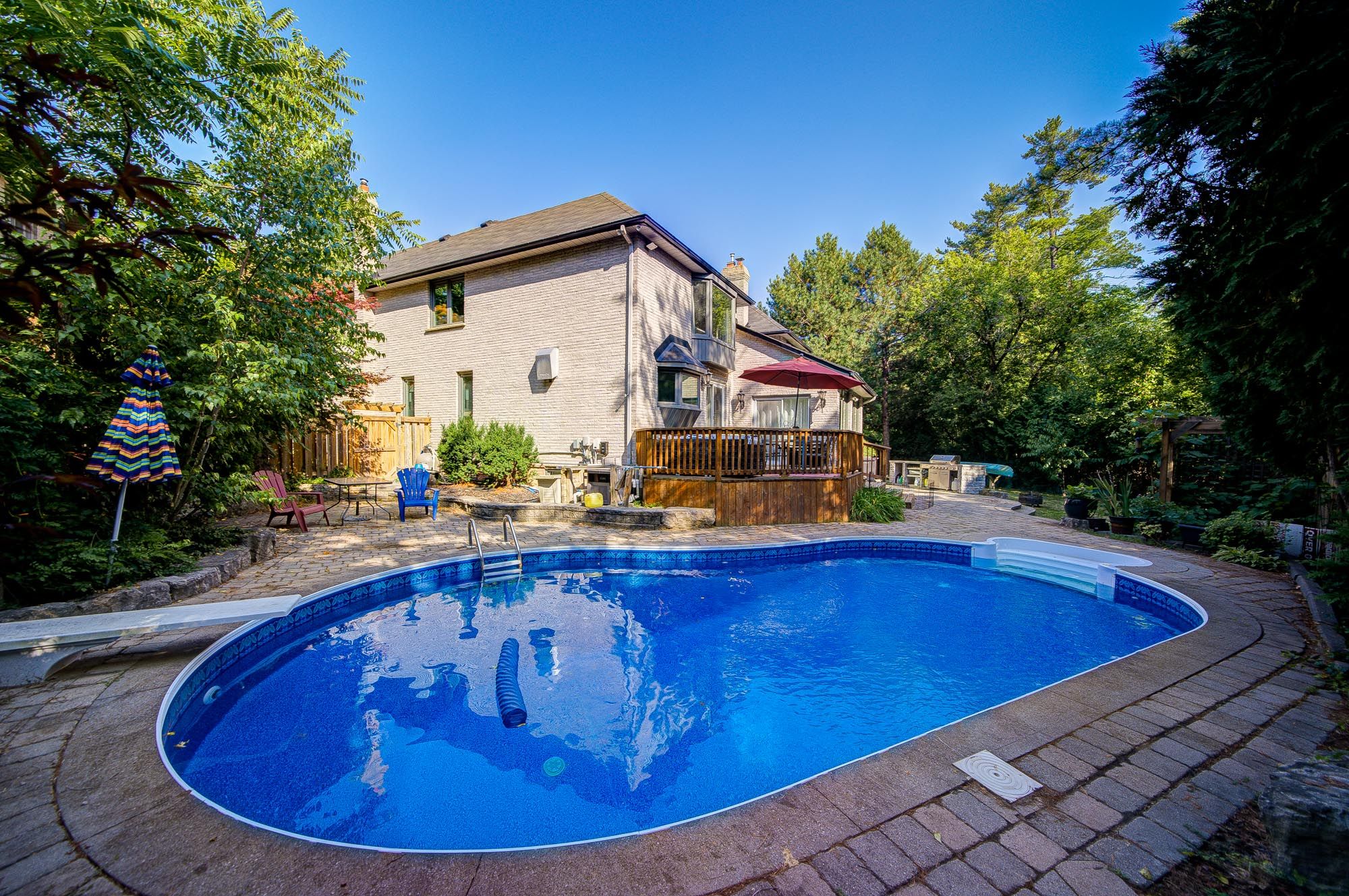 Enclaved in the woods, nestled on a premium ravine lot in an exclusive four-home cul-de-sac, this custom dalzotto-built estate offers approximately 4,000 sf above-grade living space, highlighted by a full-stone exterior, professionally interlocked driveway, landscaped backyard, all within walking distance to top-rated schools such as pilgrim wood ps &abbey park hs. Designed for both entertaining and everyday living, the main floor features a bright foyer leading to formal living and dining rooms, while the impressive family room showcases 17-foot sloped ceilings, five skylights, a dramatic floor-to-ceiling gas fireplace that flows into a sun-filled solarium. The chef's kitchen, renovated in 2016, with custom cabinetry, large center island, premium appliances, including sub-zero 36" freezer ,36"fridge set, a wolf 36" hood w/wall mount blower ,w gas cooktop, a double oven, an asko dishwasher, and a sharp under-counter microwave. The upper level offers four spacious bedrooms with floor-to-ceiling windows, including a primary suite with a walk-in closet w/ luxurious 5-piece ensuite, two bedrooms connected by a jack&jill 5-piece bathroom, a fourth bedroom with its own private 4-piece ensuite. The expansive lower level, with a separate entrance, adds exceptional versatility with a large recreation room, a games room, a fifth bedroom or den with a 4-piece bath, a cold room, ample storage. The private backyard retreat features over 135 feet of ravine frontage a saltwater heated pool with a new liner (21), a 1. 5 hp pump (23), an updated sand filter (23), along with additional upgrades such as a new deck ,bbq (16), backyard fencing and two wood sheds (2019), back & side triple-pane window replacements (21), a owned hot water tank (25). Attic insulation upgrade (21). An upgraded gas meter supports multiple features simultaneously, including two gas fireplaces, a gas stove, fire pit, bbq, two furnaces, ensuring this exceptional home delivers luxury , outstanding performance.