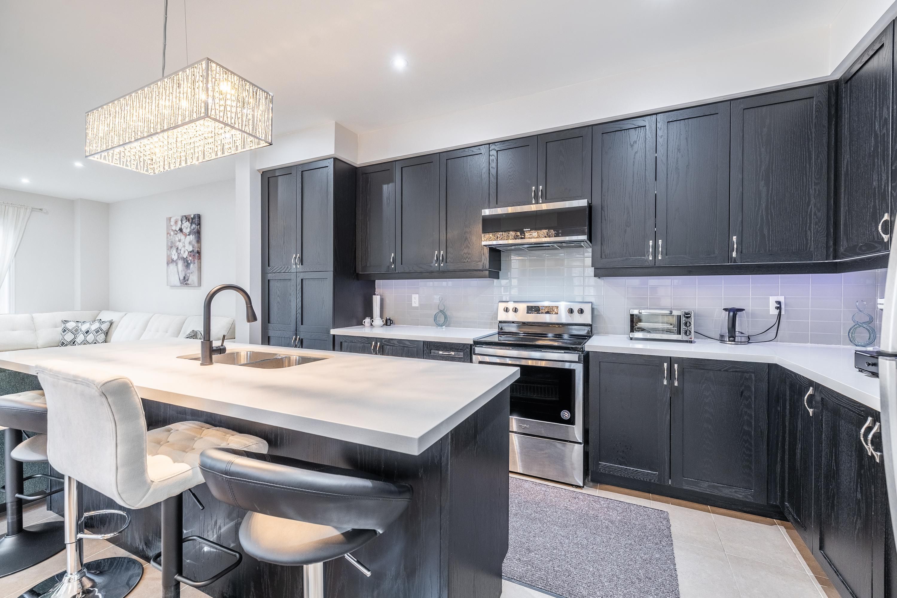 • Modern kitchen featuring a large quartz island for casual dining and meal prep.