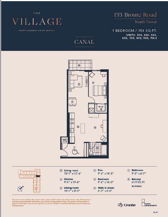 **furnished unit** spacious 1 bed plus den in a fabulous location - close to everything! .. Welcome to the village! A unique luxury rental with 5-star hotel inspired amenities, which is nestled in oakville's most vibrant and sought after neighbourhood, bronte harbour! The canal suite is a beautifully designed 954 sqft of luxury living! This 1 bed plus den offers a large bedroom with walk-in closet, and a balcony! It is bright, modern & sleek in design. It features a spacious open-concept kitchen with island, contemporary cabinets & gorgeous counters, plus stainless steel appliances, gorgeous wide-plank flooring throughout. Convenient full size -in-suite laundry, & private balcony. Enjoy the beauty of the lakefront, walking trails, parks, the marina and more at your doorstep! All without compromising the conveniences of city living. Walk to farm boy grocery store, pharmacy, restaurants, shopping, bank, and other great spots in bronte! Wonderful amenities - pool and sauna, resident lounge, dining & social rooms, roof top patio & lounge, fitness rooms, dog spa, car cleaning stall, car charging stations, 24/7 concierge & security. (parking available for an additional fee to rent @$130/month). *pets welcome*