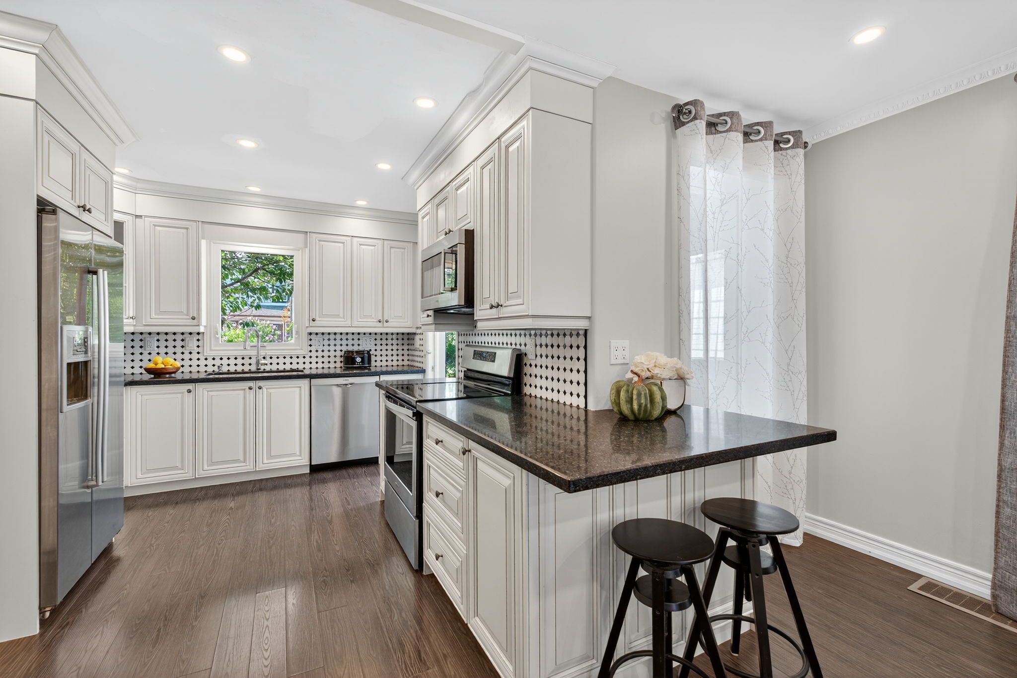 Beautifully renovated and meticulously maintained, this 2-storey stipley home blends hamilton's historic charm with modern upgrades. Just steps from trendy ottawa street, shopping, and gage park, this property offers the perfect mix of lifestyle and convenience. Inside, high ceilings and abundant natural light highlight the spacious layout. The custom kitchen-featuring granite countertops, ample storage, and an open flow to the dining and living rooms-creates an ideal space for entertaining. Upstairs, three generous bedrooms plus a large office provide plenty of room for family and work-from-home needs, while the custom bathroom boasts heated floors and soaring 12' vaulted ceilings. Outdoors, enjoy a spacious, low-maintenance backyard and a rooftop patio-perfect for summer evenings. Major updates include copper wiring, abs/copper plumbing, and along-lasting asphalt-coated steel roof. With a two-car concrete driveway and quick access to qew, lrt, and ottawa street's shops, restaurants, and markets, this home offers style, function, and location in one package.