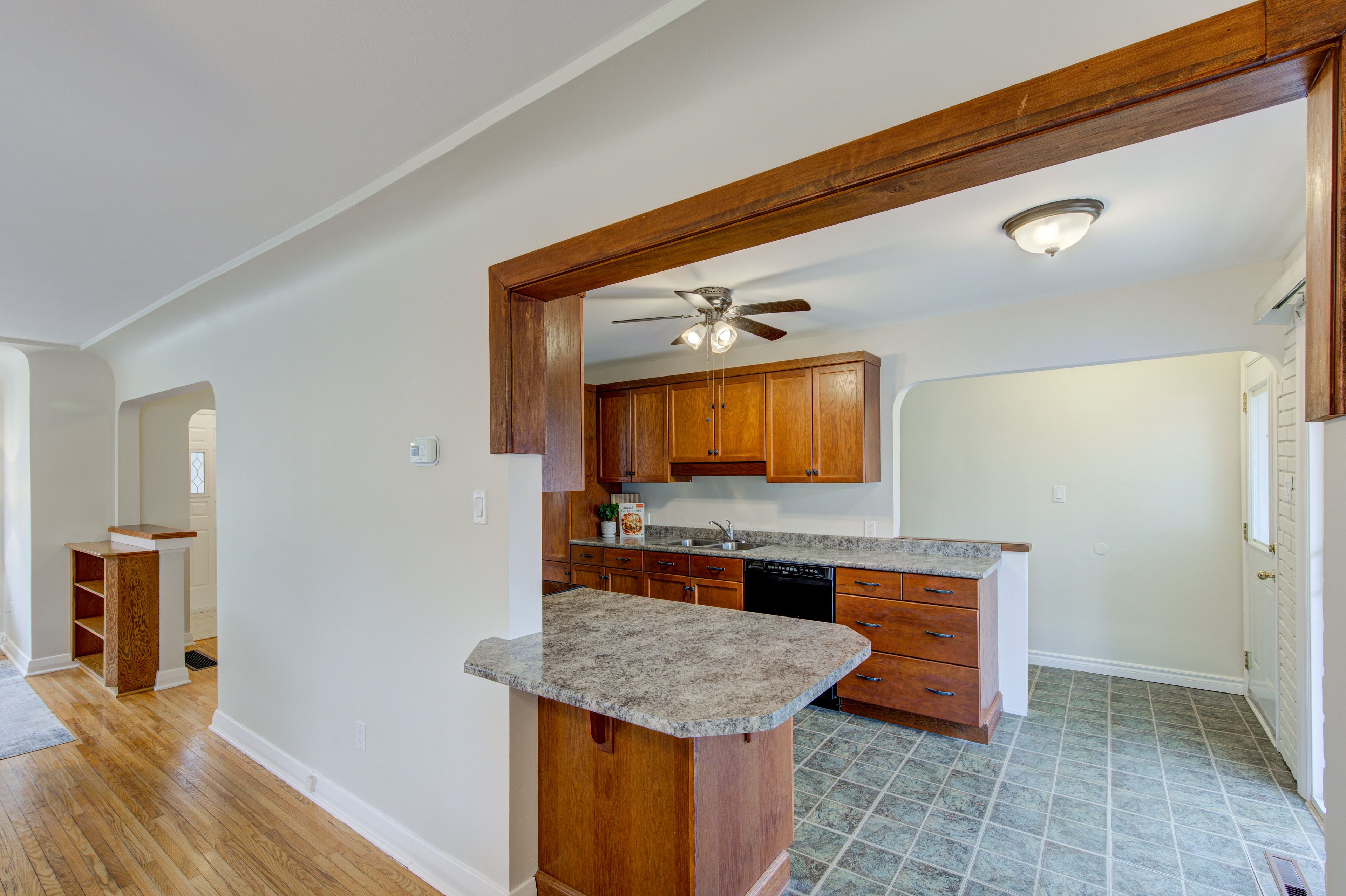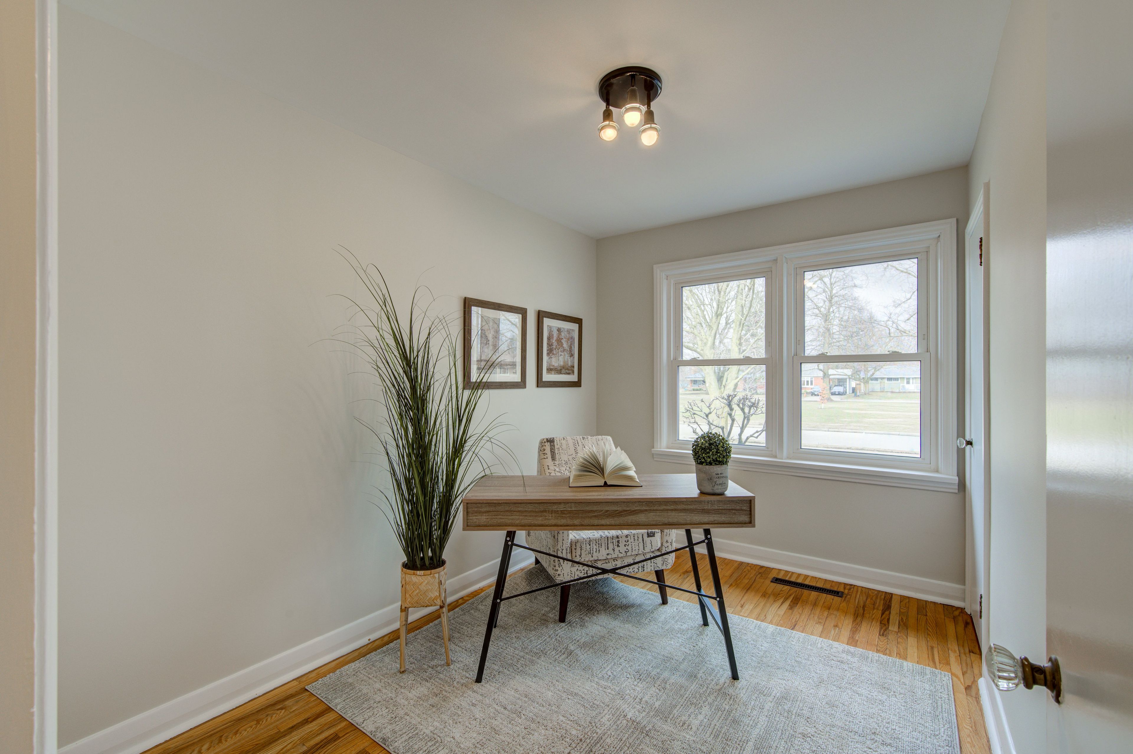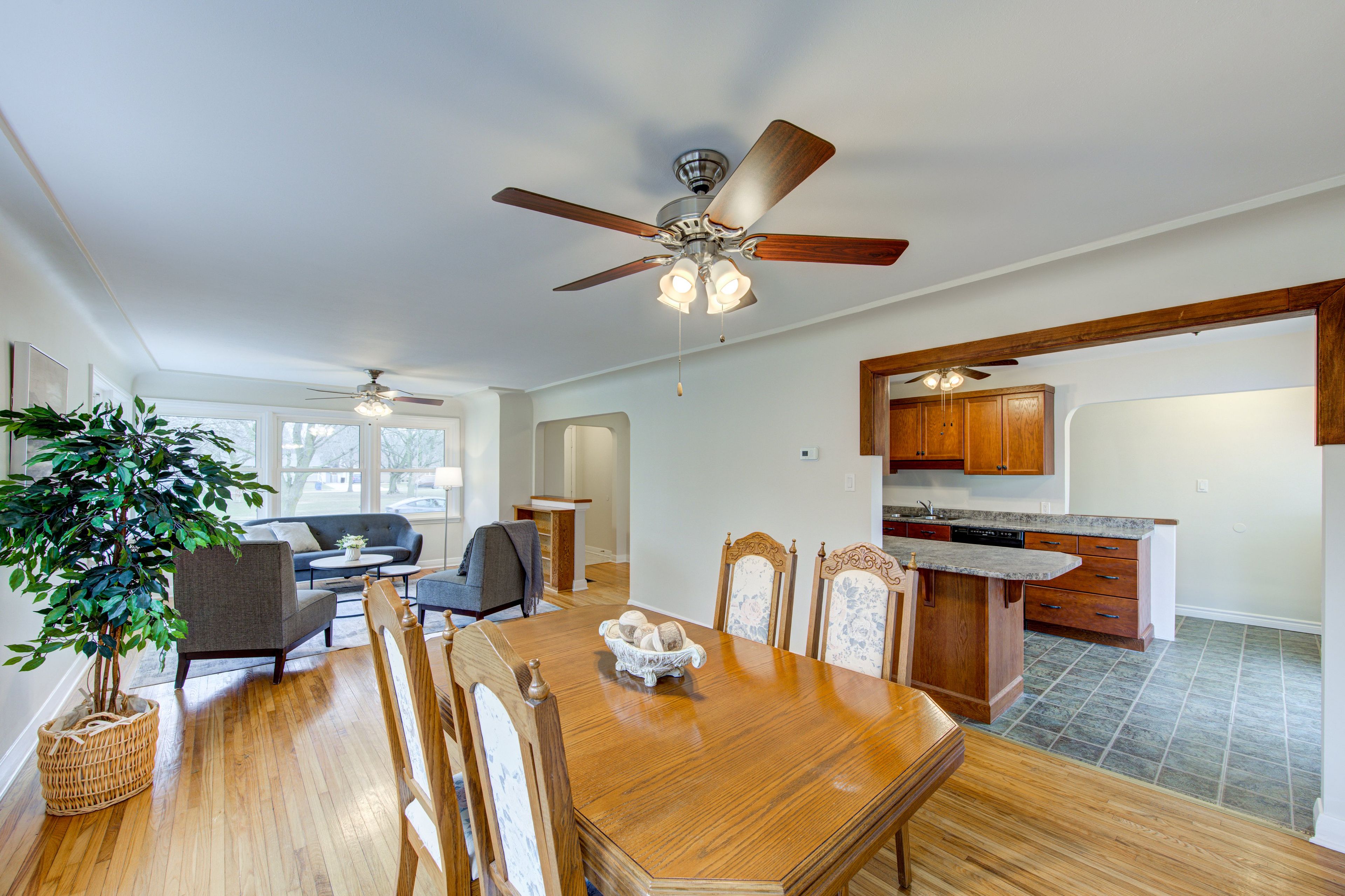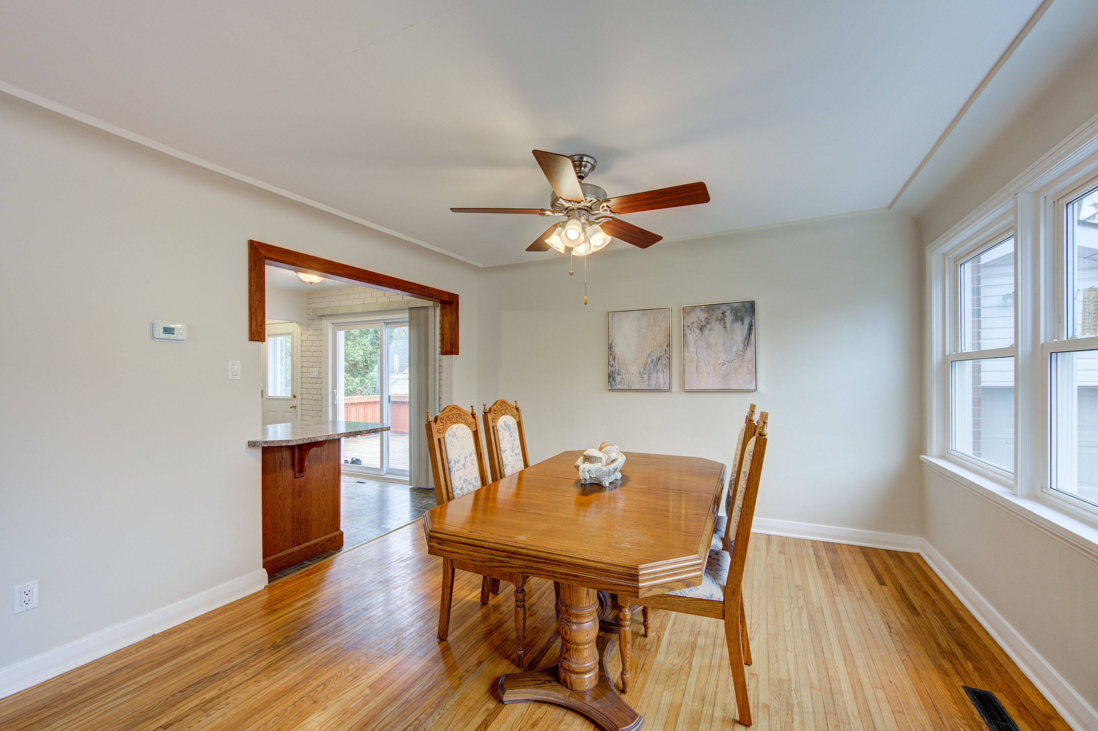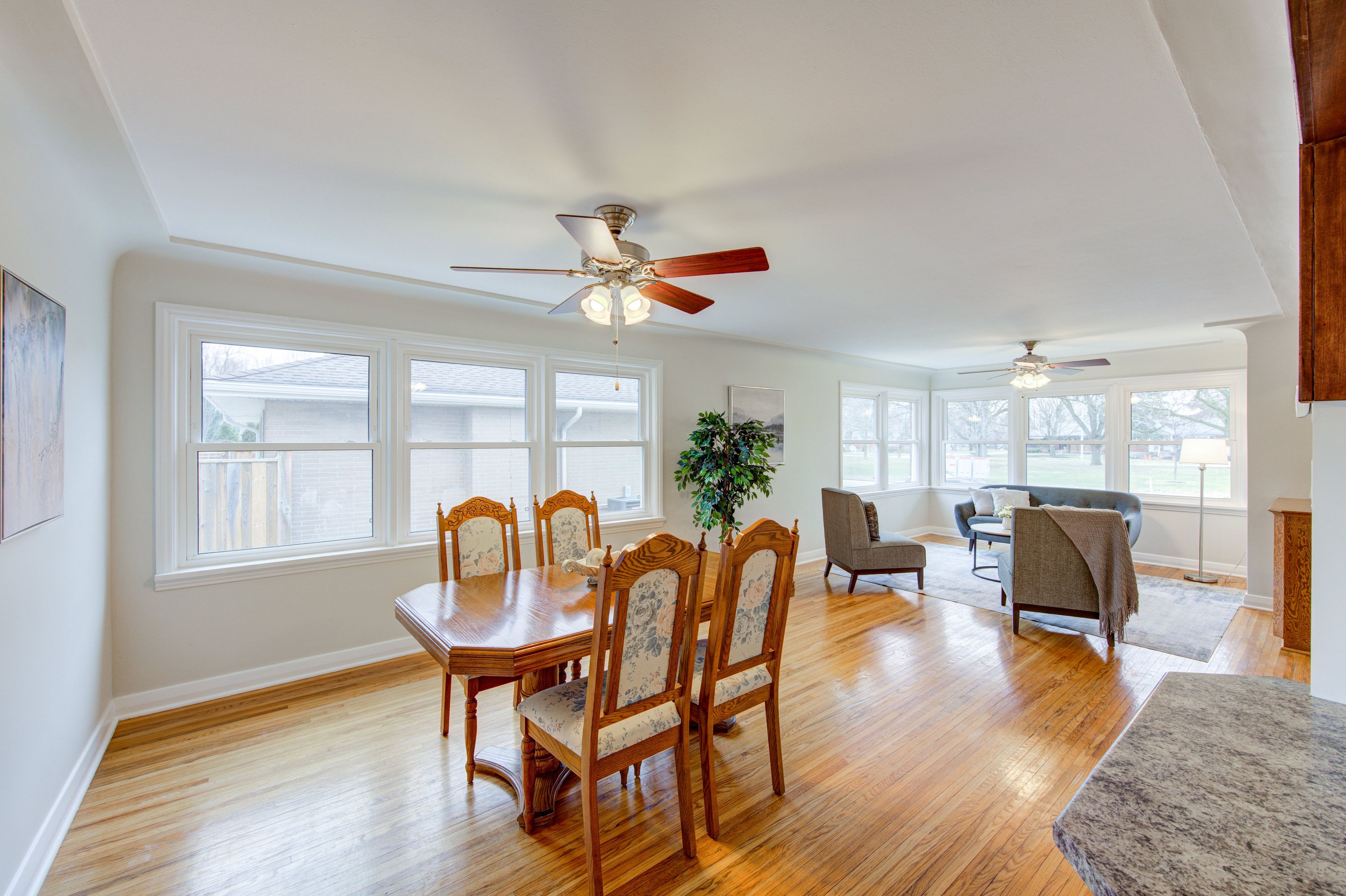 • Bright main floor with spacious living and dining areas, large windows, and hardwood floors.