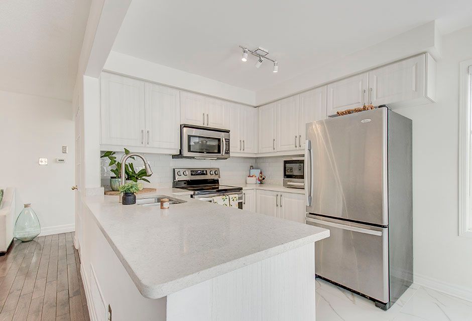 • Bright kitchen with quartz countertops and stainless steel appliances, perfect for cooking.
