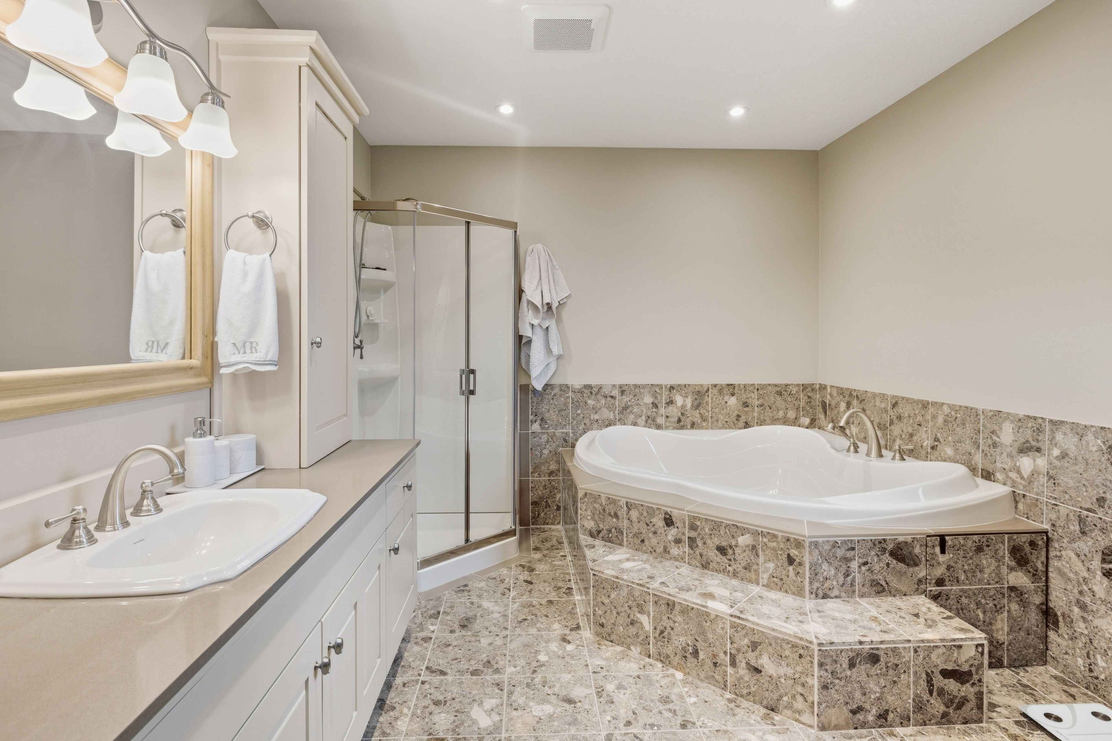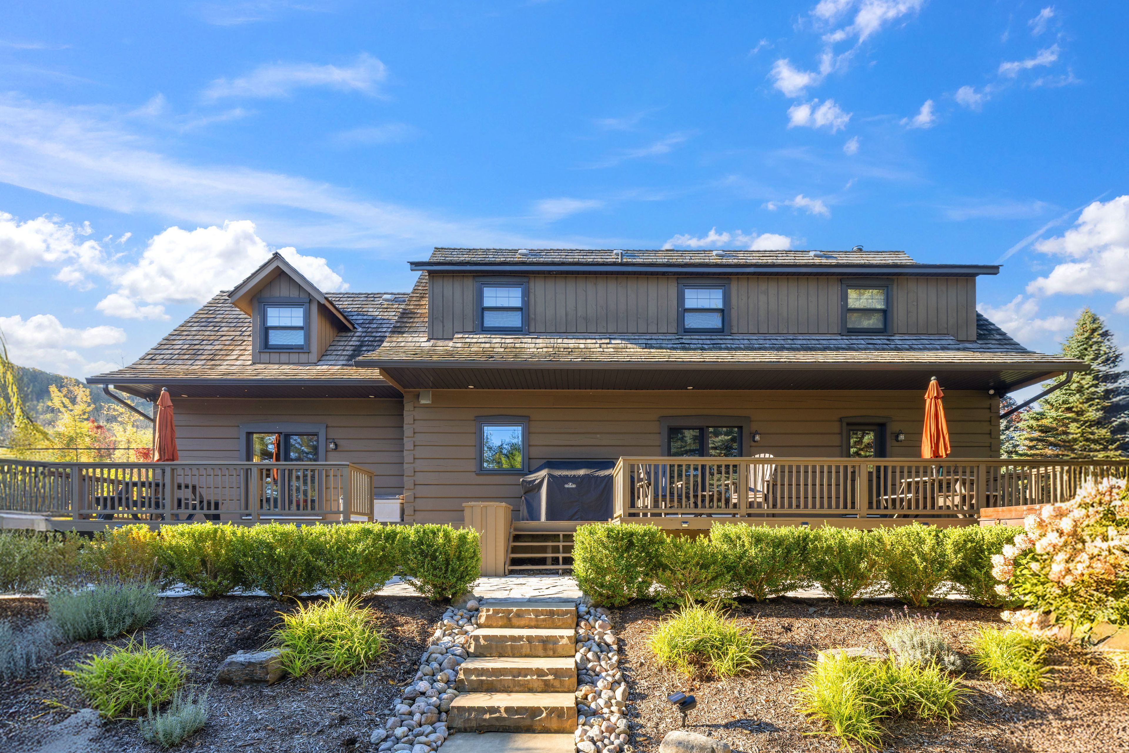 • Expansive back deck with hot tub for relaxing under the stars.