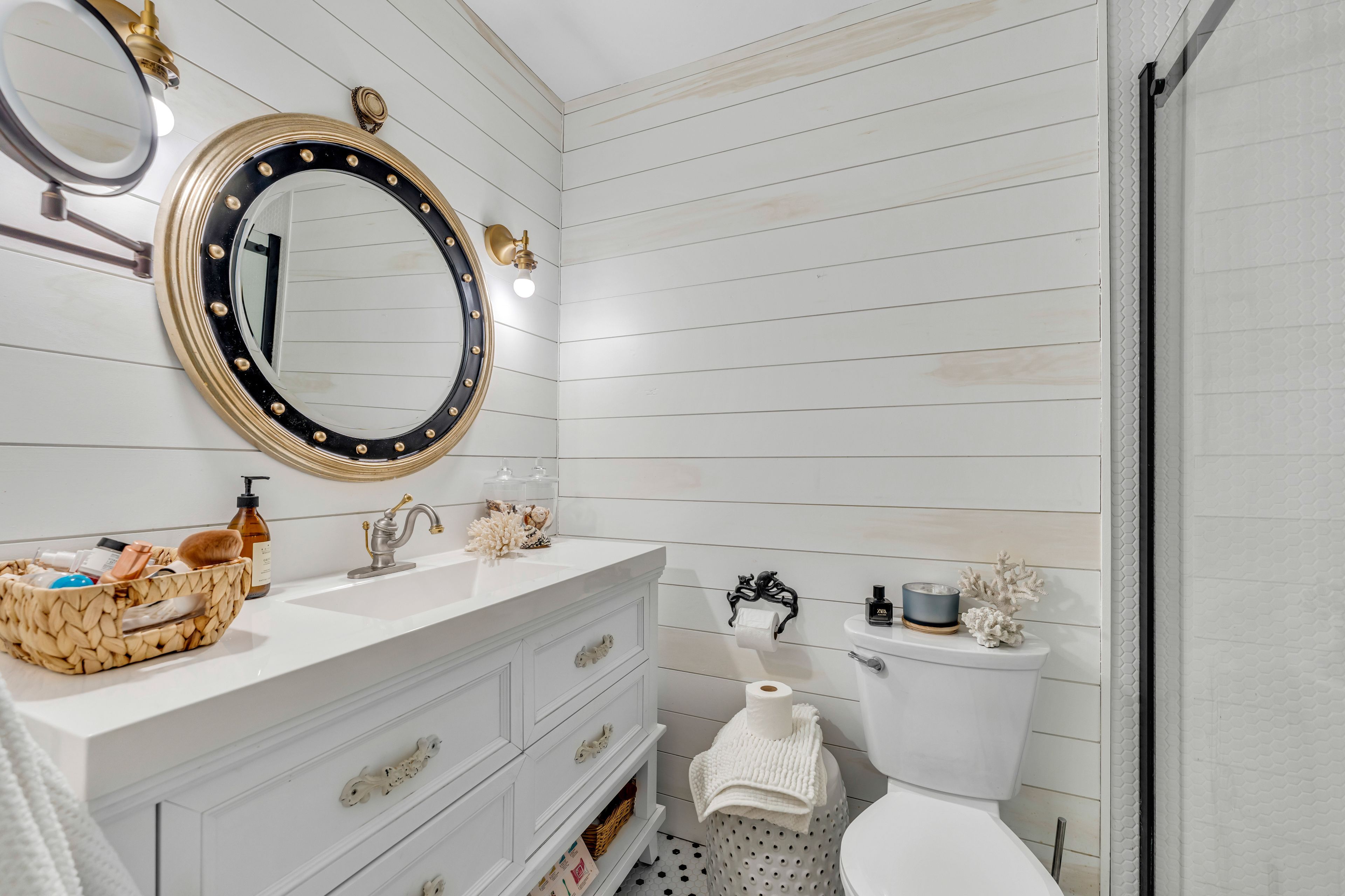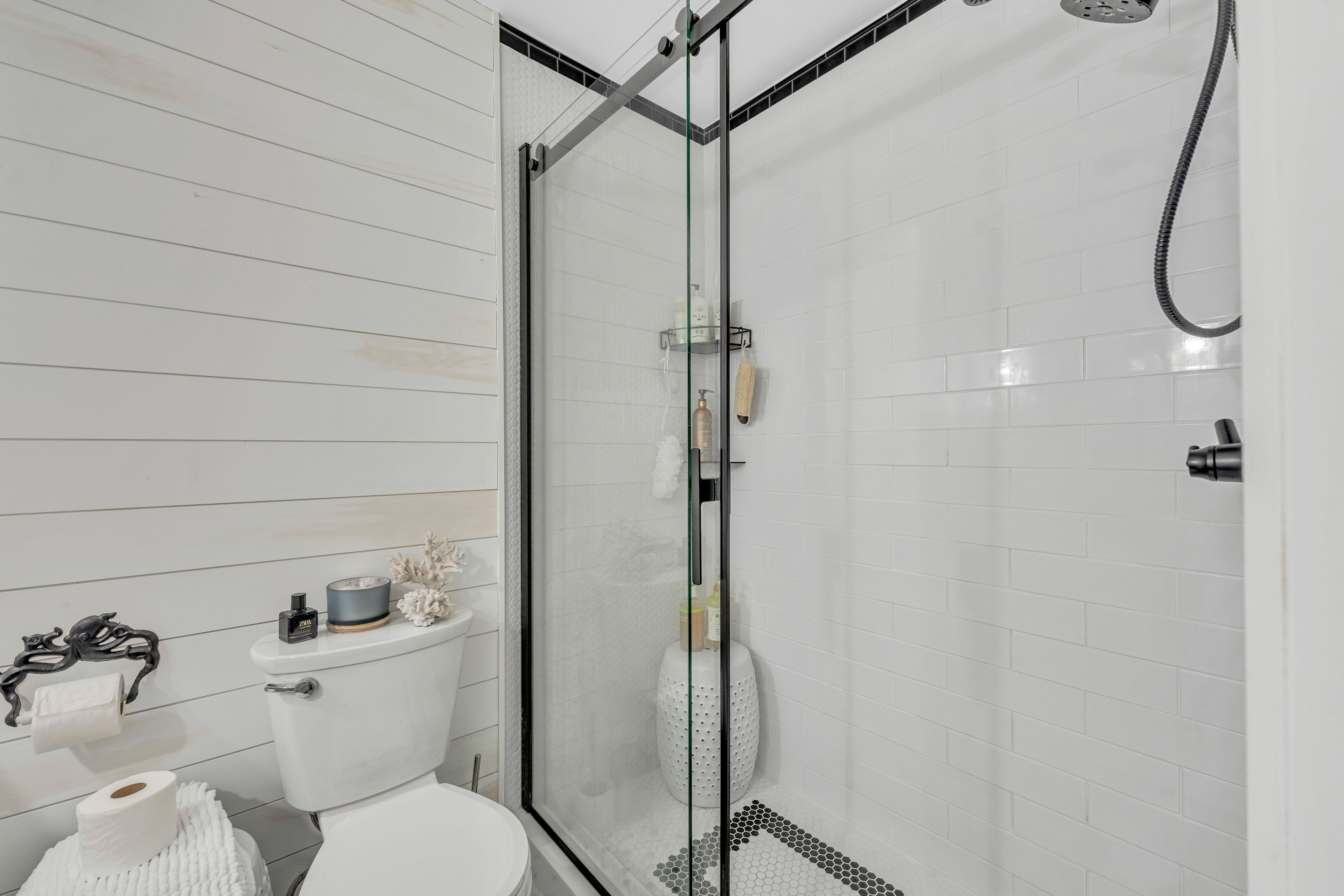 • Renovated bathroom includes tiled walk-in shower and glass door.