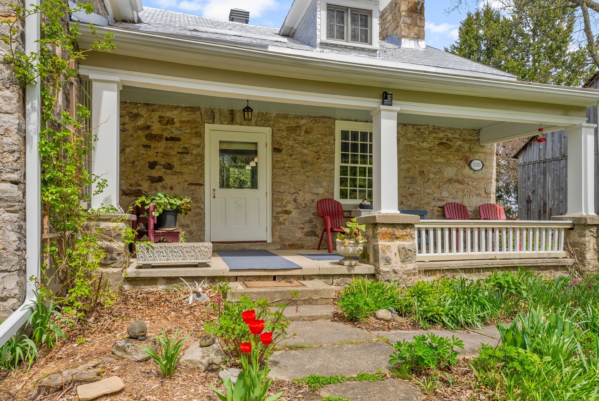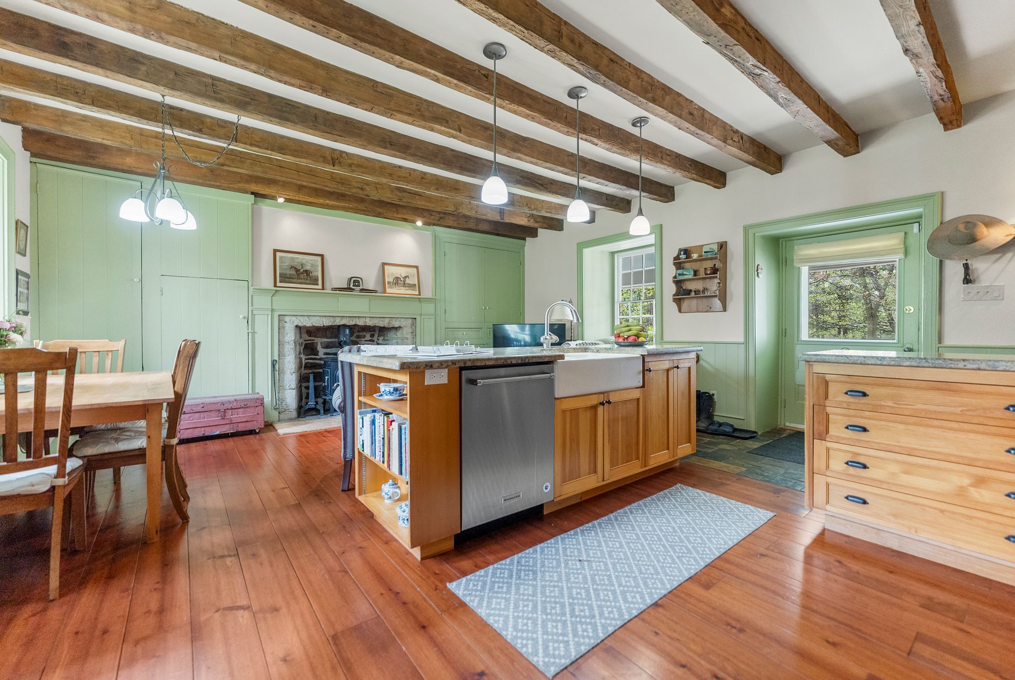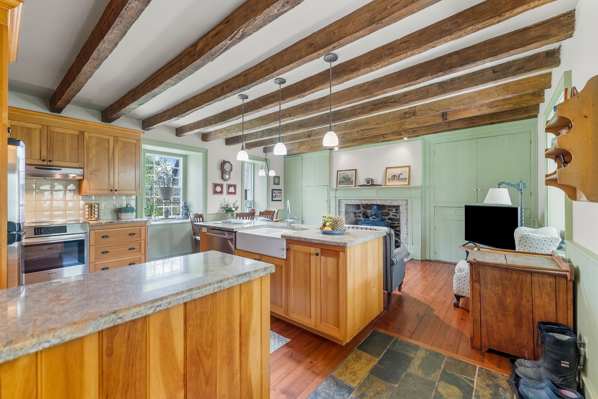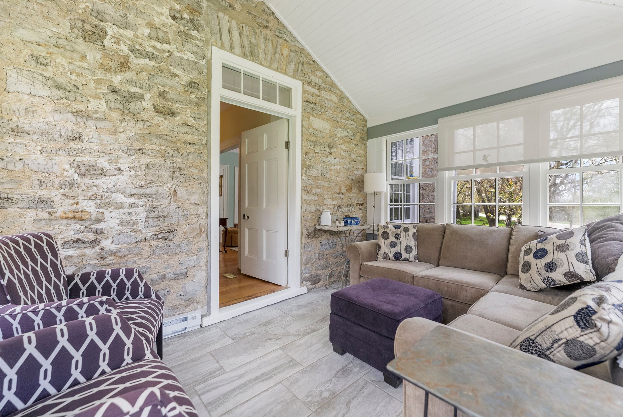 • Original stonework, antique accents, and vintage fixtures preserved throughout.