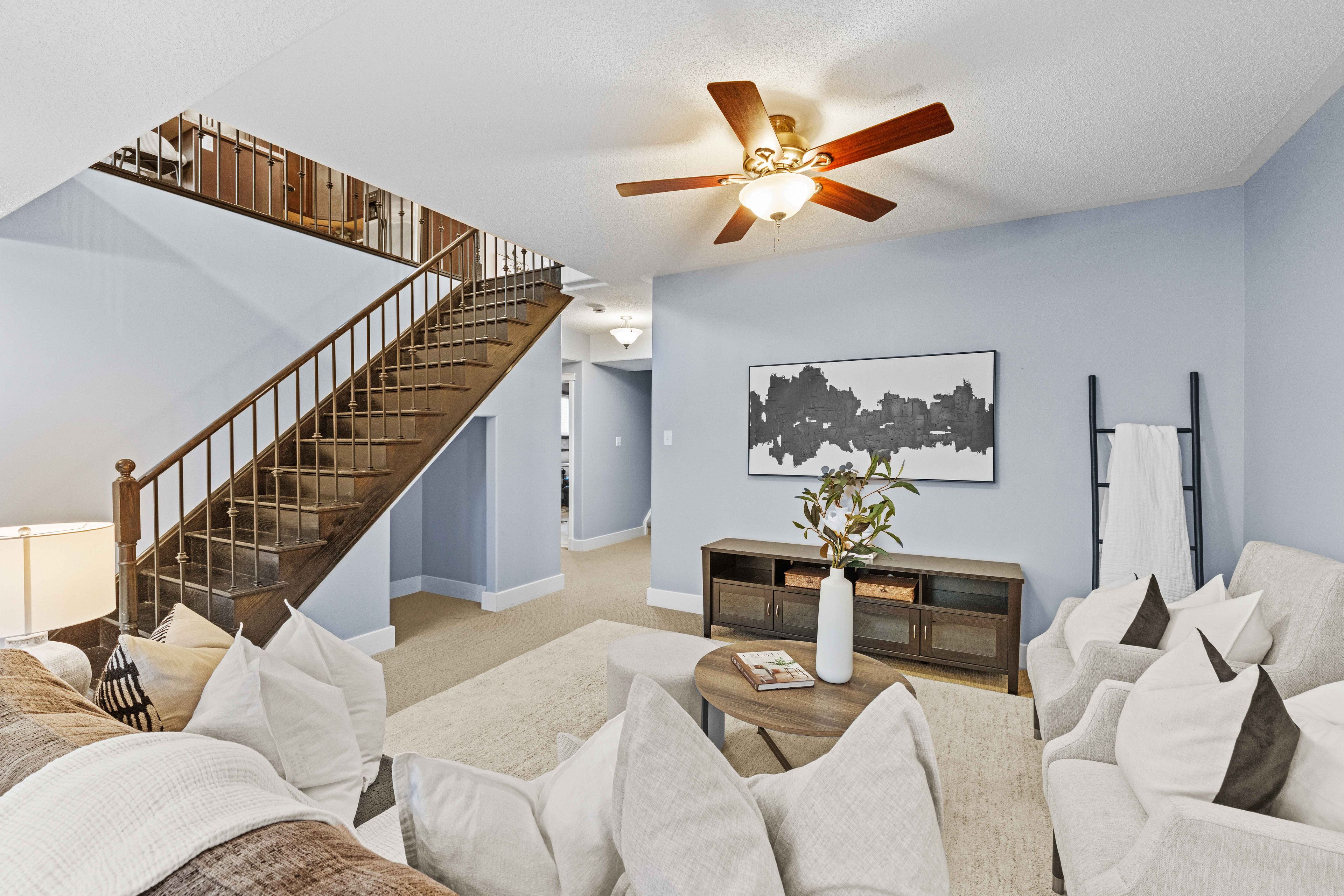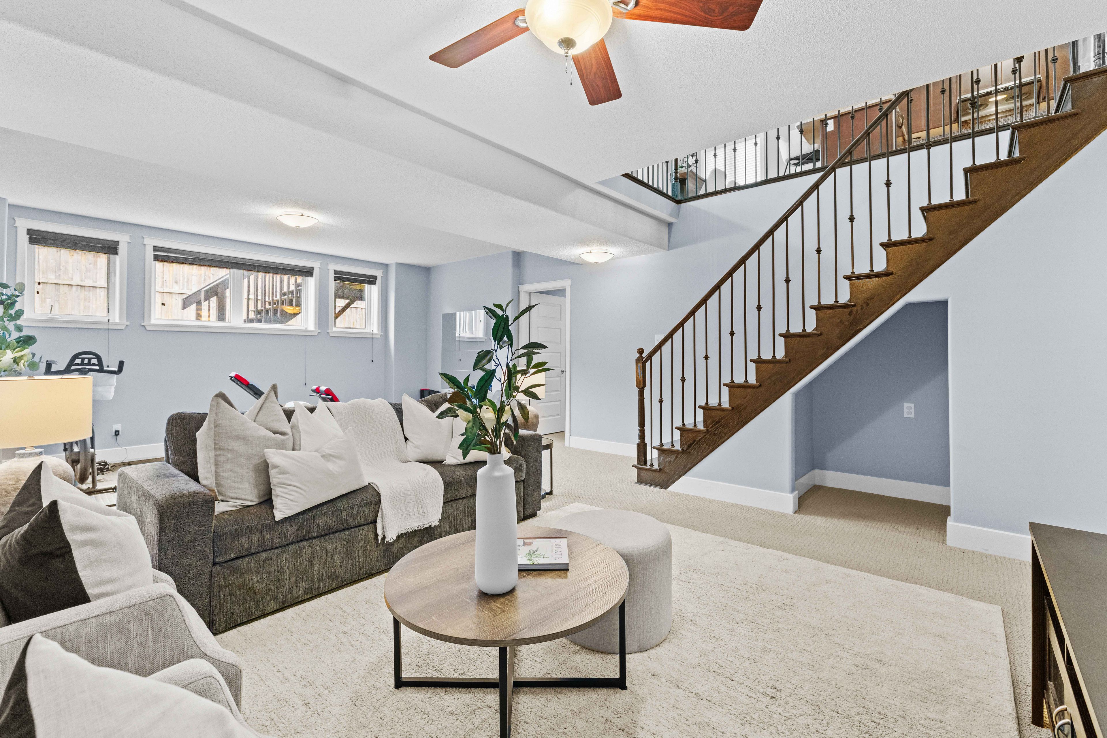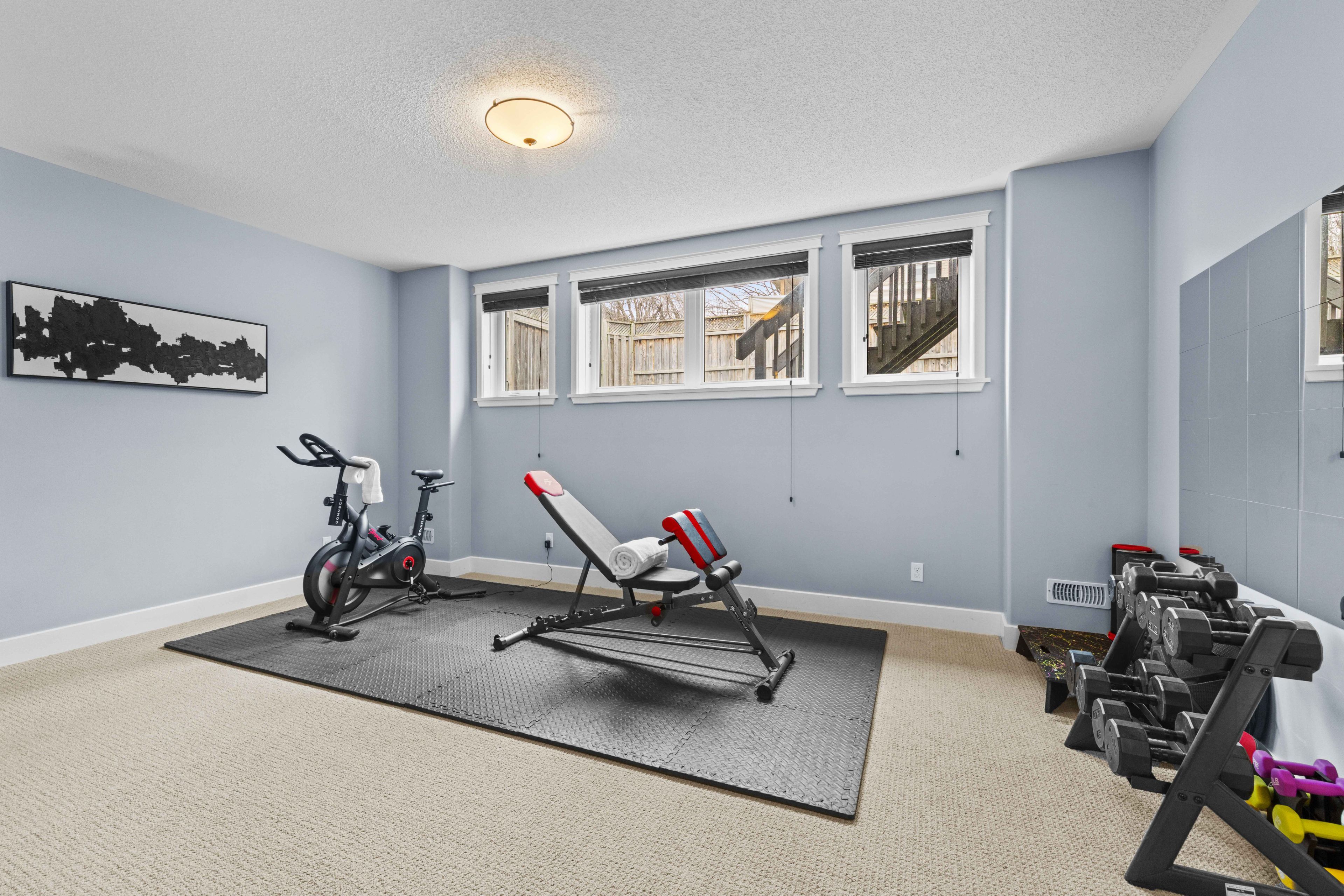 • Fully finished basement with tall ceilings and large windows for extra space.