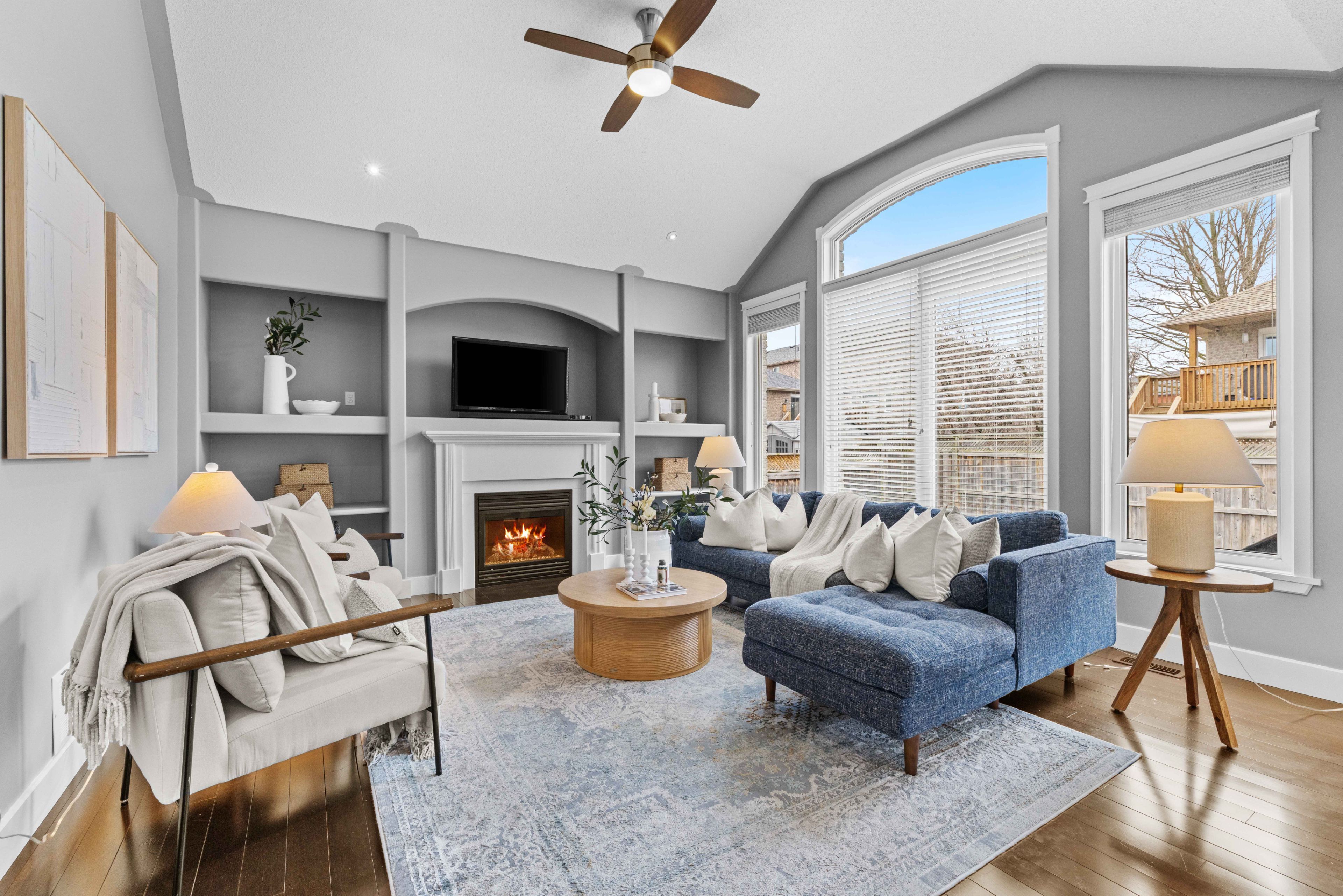 • Bright family room with cathedral ceiling and views of a private backyard.