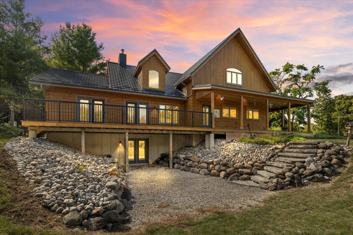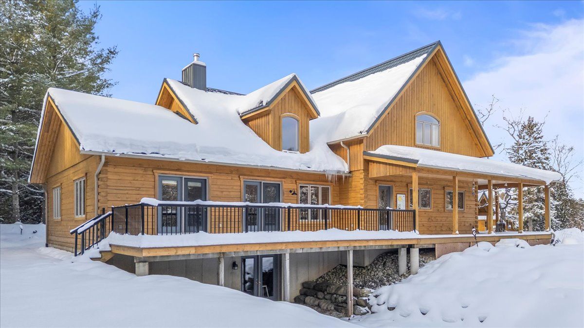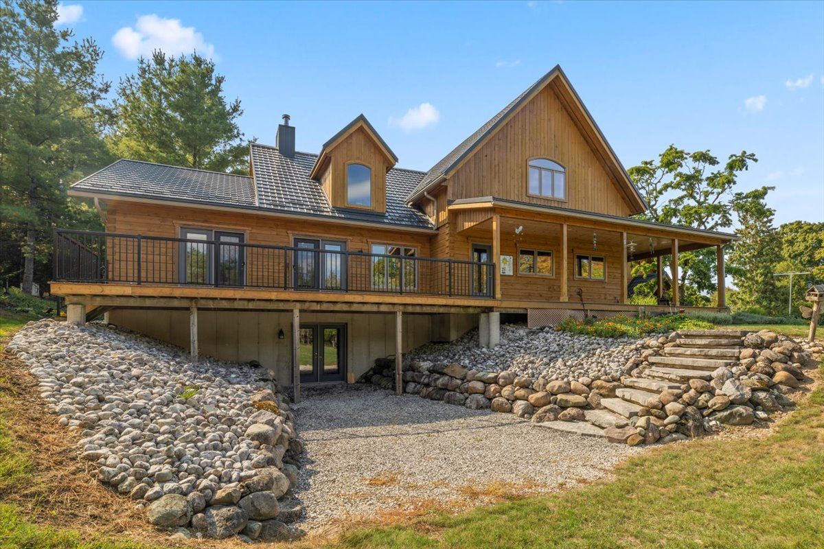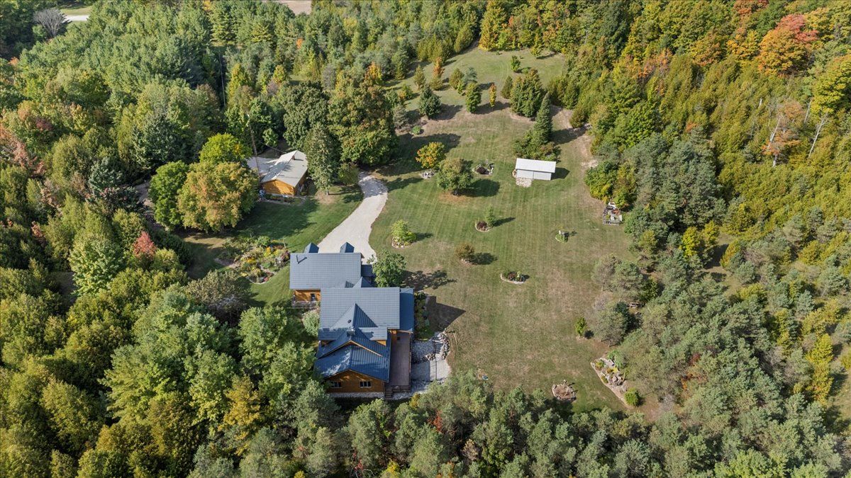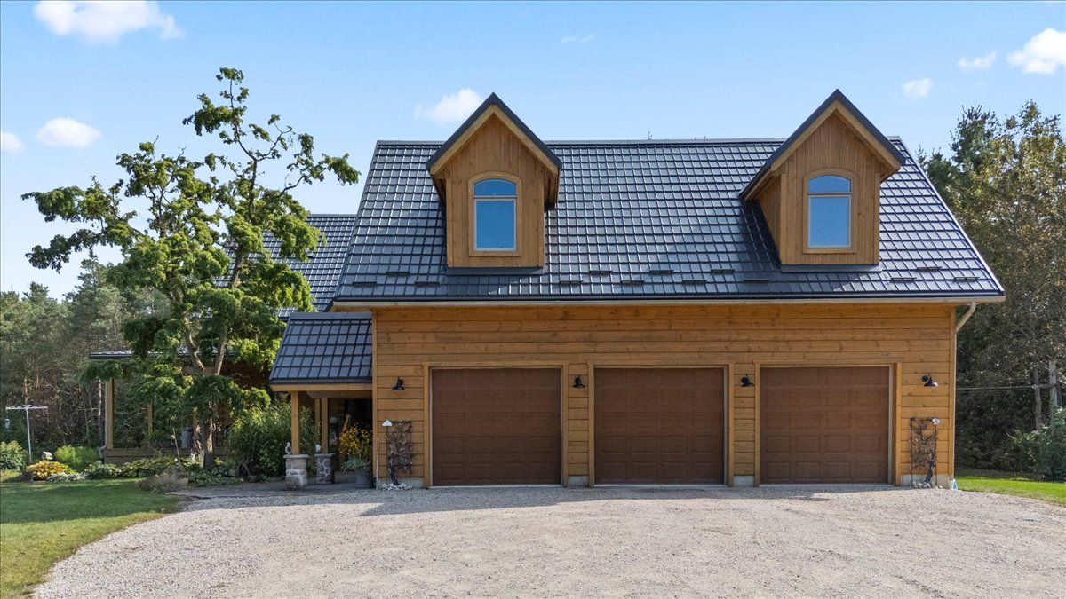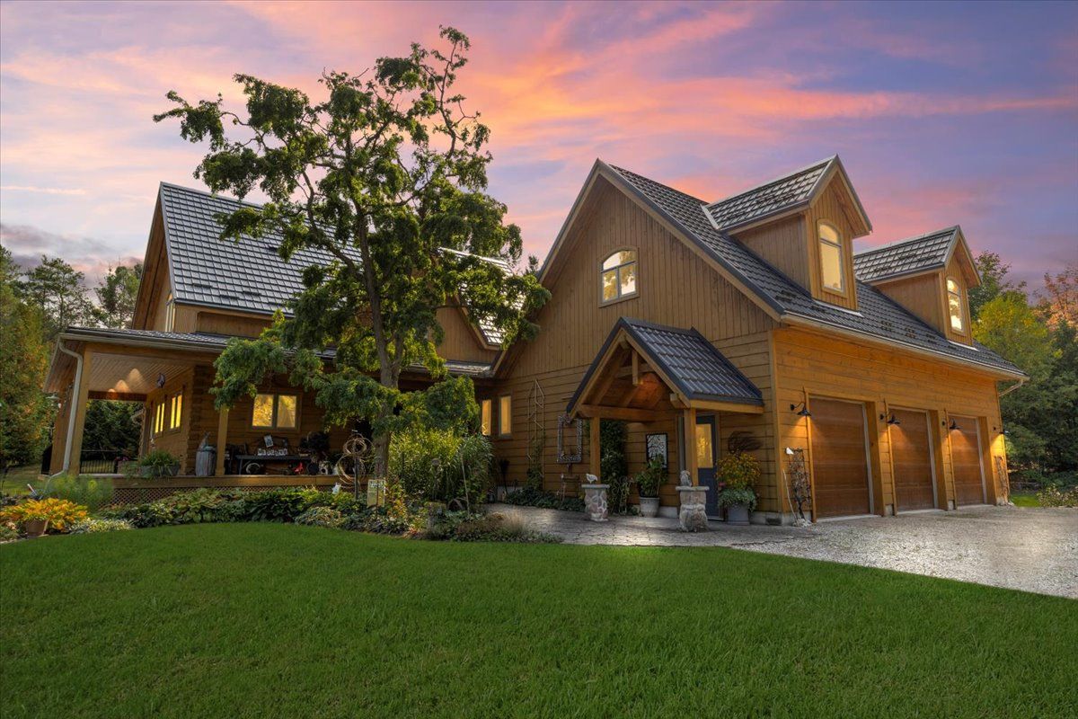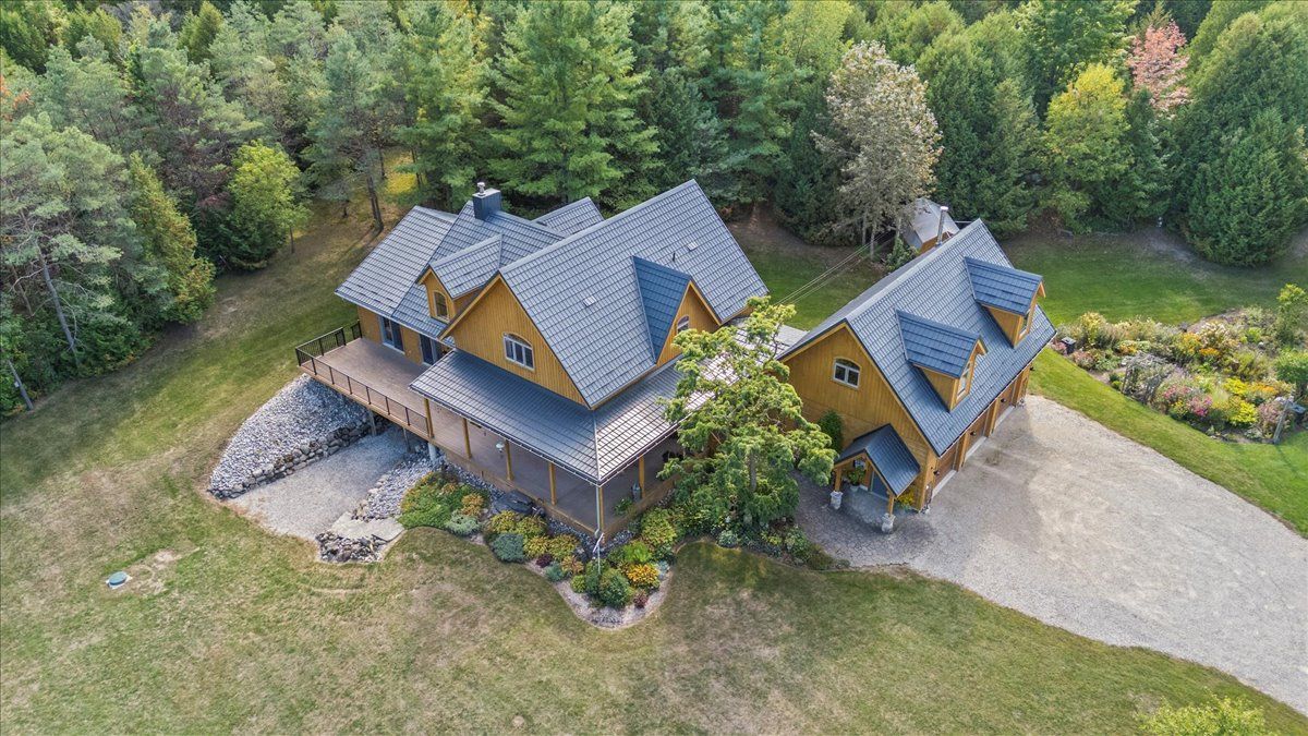 Luxury country retreat nestled on a peaceful, private & lovingly landscaped 9. 8-acre property. As you approach the magnificent log home, which commands attention, you'll be drawn to the front steps leading up to the welcoming composite porch, inviting you to explore the interior. As you step through the front door, you'll be greeted by a bright, spacious, and immaculate interior. The main floor showcases an impressive kitchen with an oversized island & a complete appliance package, dining area with access to expansive deck, a grand great room with soaring cathedral ceilings, & a stunning wood burning fireplace that makes a bold statement complete with a dumb waiter for added convenience. The tranquil primary bedroom features a five-piece ensuite and a walk-in closet that meets your every need. Another full bathroom, a large laundry room, & a practical mudroom completes the main level. As you ascend the log stairs to the second level, you'll appreciate the open office space overlooking the main floor and discover two generous bedrooms sharing another well-appointed bathroom. The walkout basement presents endless possibilities - ample space for a workshop, storage, separate panel for generator, or your own custom finishing touches. There's also a substantial cold room with walk up access to the triple car garage, plus a fully finished loft above the garage with custom finishing touches that any guest would absolutely love and may never want to leave. After you've explored the spectacular interior, step outside to find an older home used for storage, along with a large storage shed & a garden shed, surrounded by many perennial flower beds. This property offers not just a home, but a serene lifestyle in a beautiful setting on a quiet country road within minutes to allan park conservation area where you can enjoy fishing, cycling, snowshoeing, skiing & hiking trails, and tobogganing. Are you ready to confidently claim this extraordinary home and property as your own?