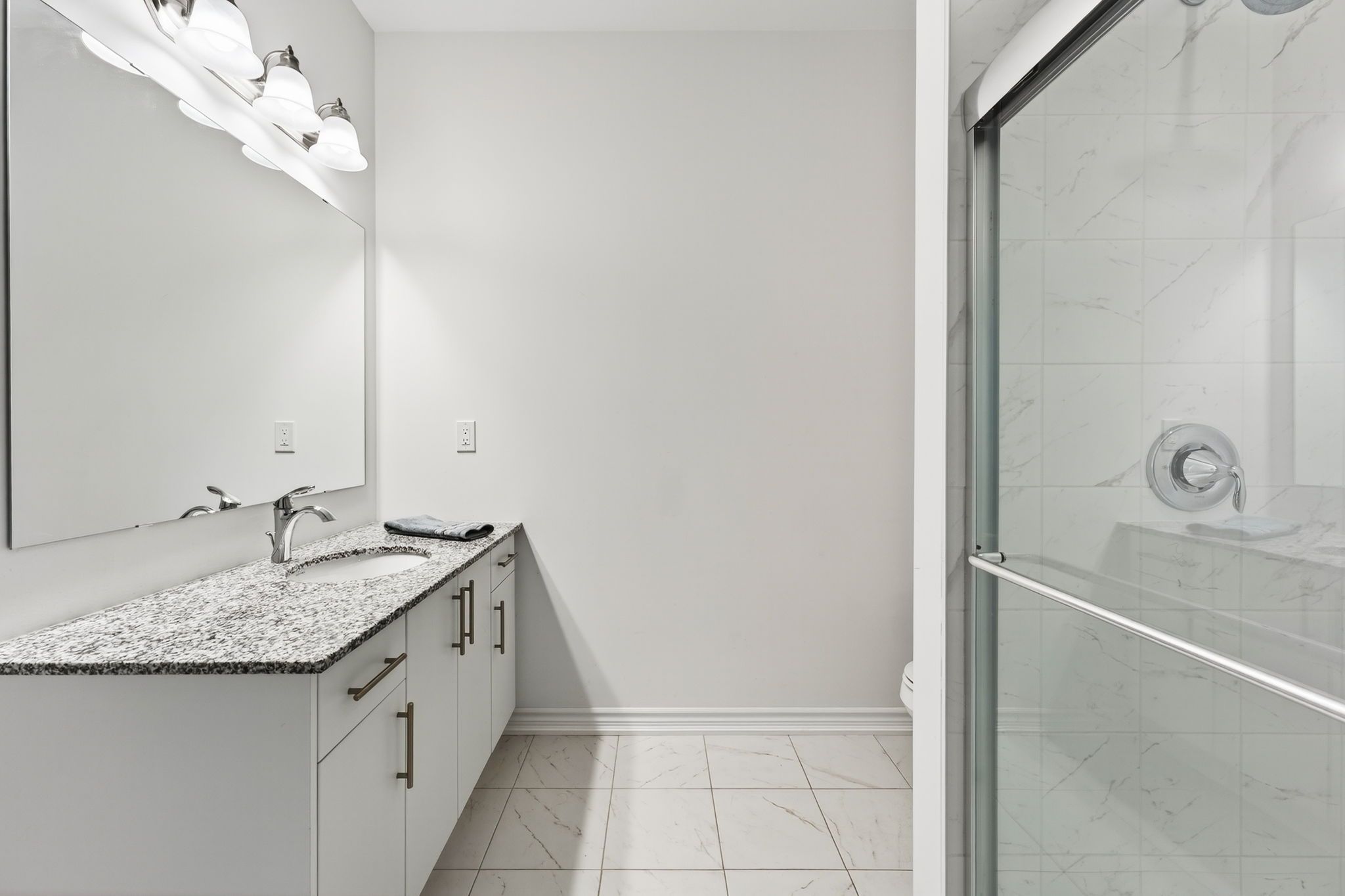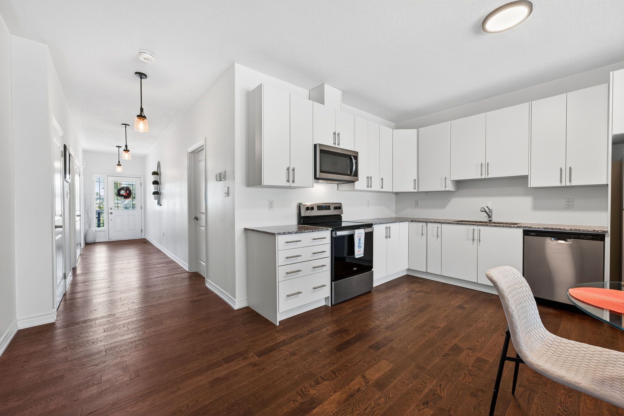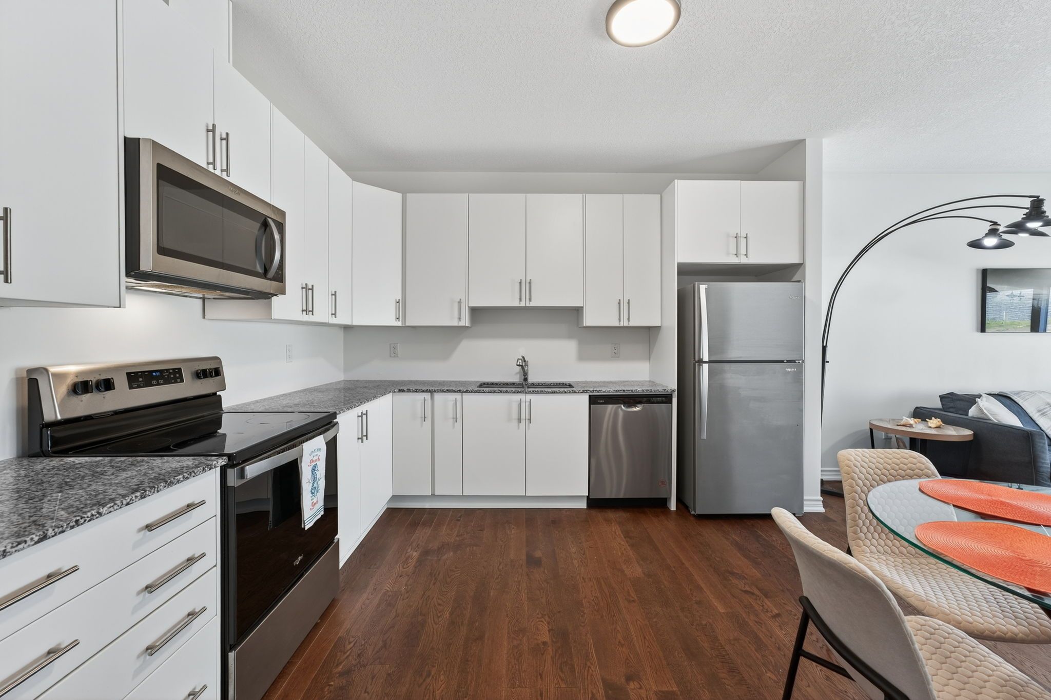 • Modern kitchen with granite countertops and stainless steel appliances.