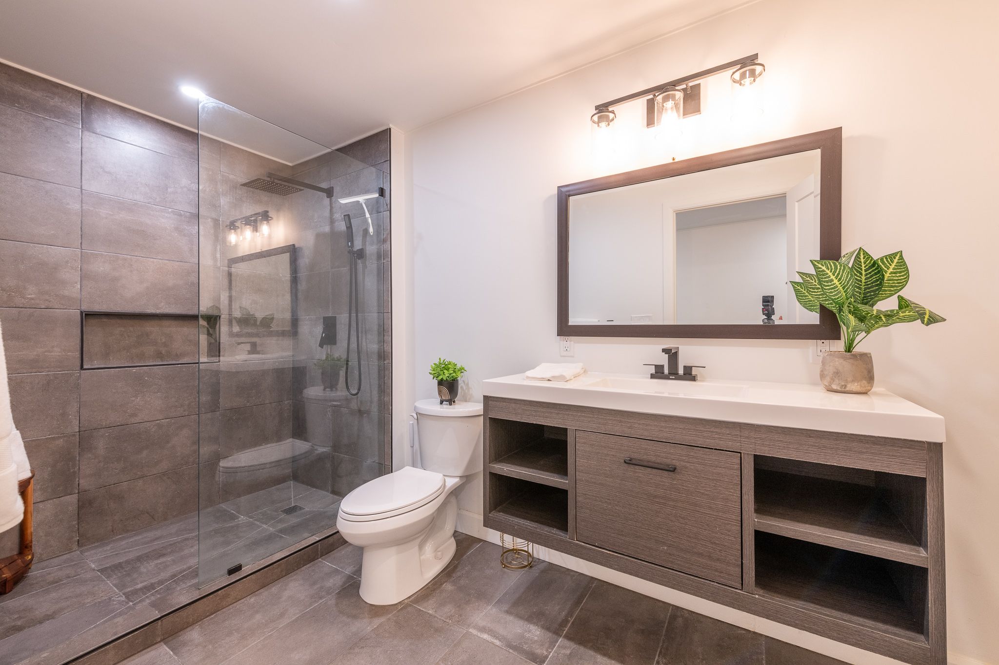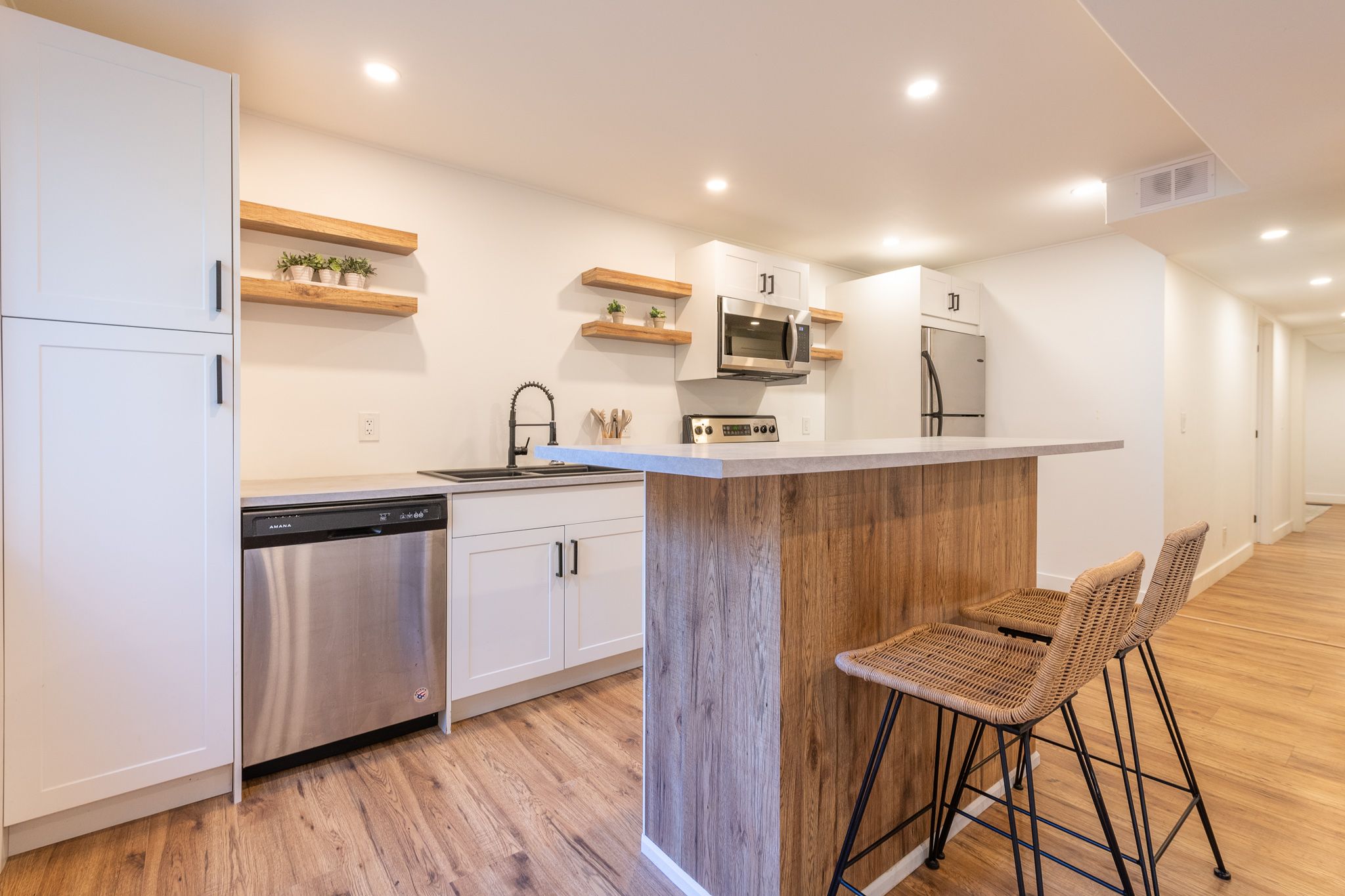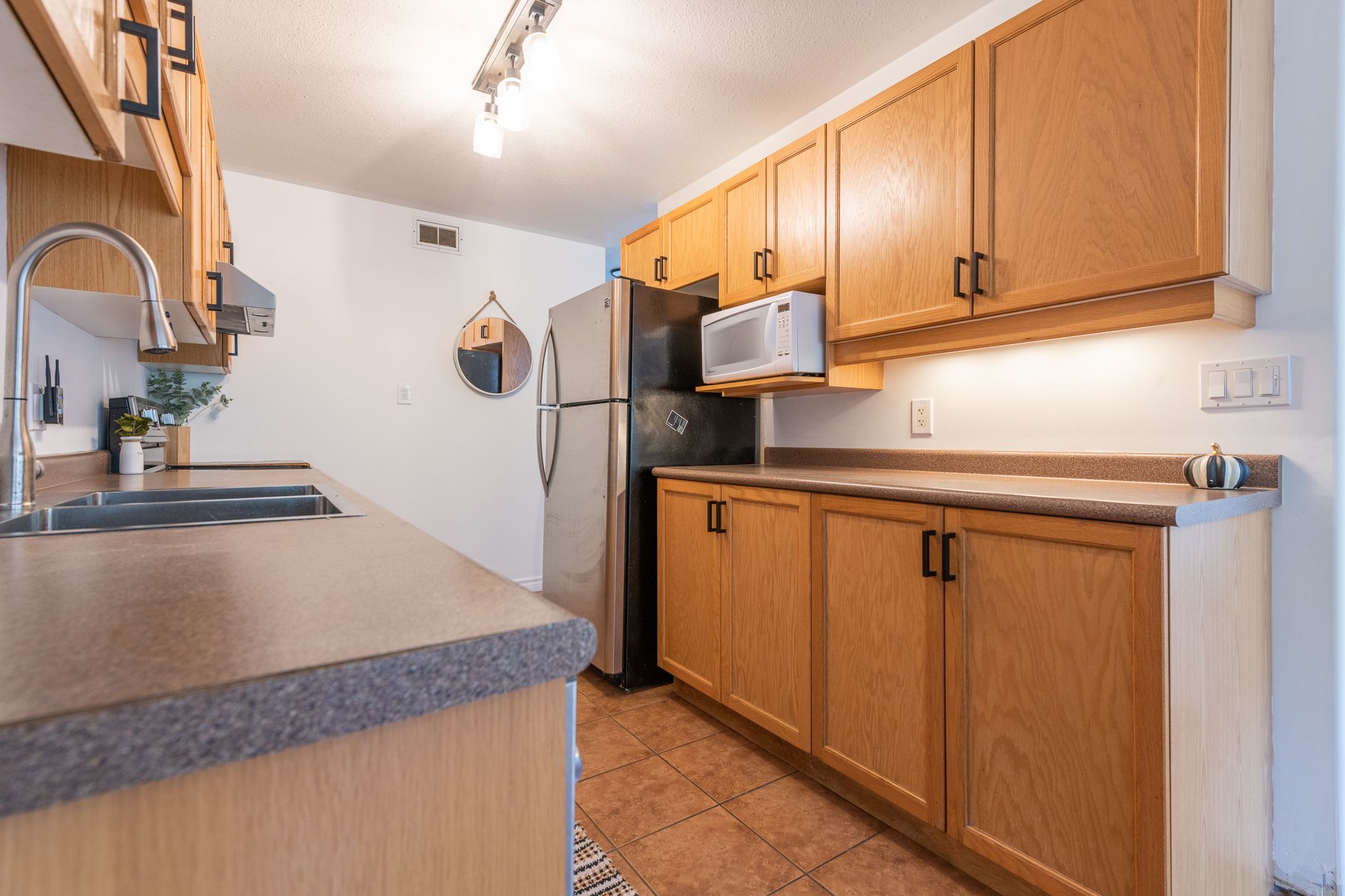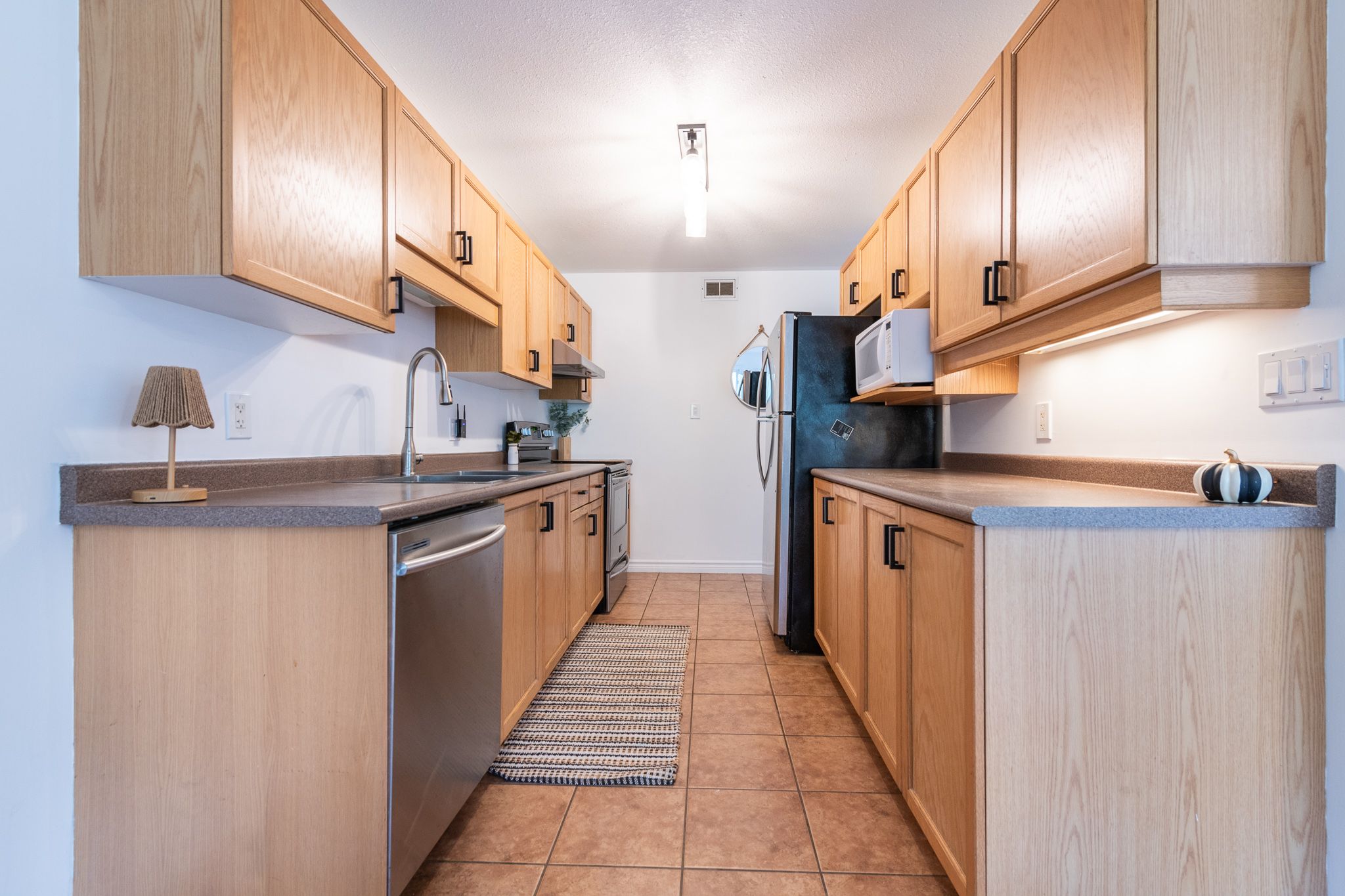 • Modern kitchen with plenty of cabinets and stainless steel appliances.