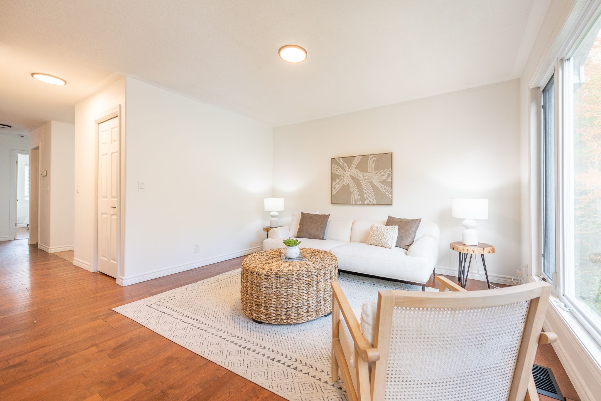 • Bright main level with open living and dining areas featuring hardwood floors.