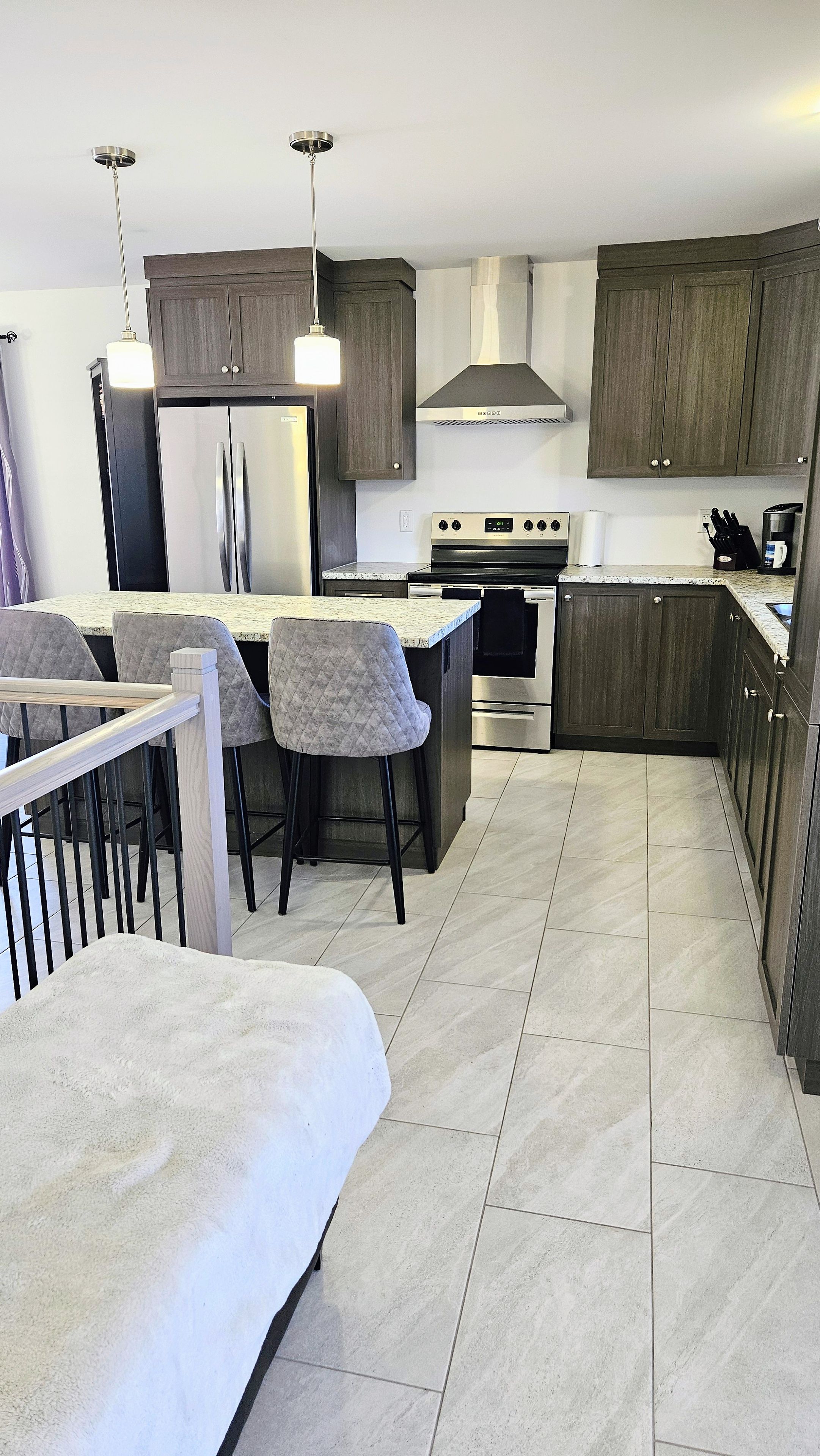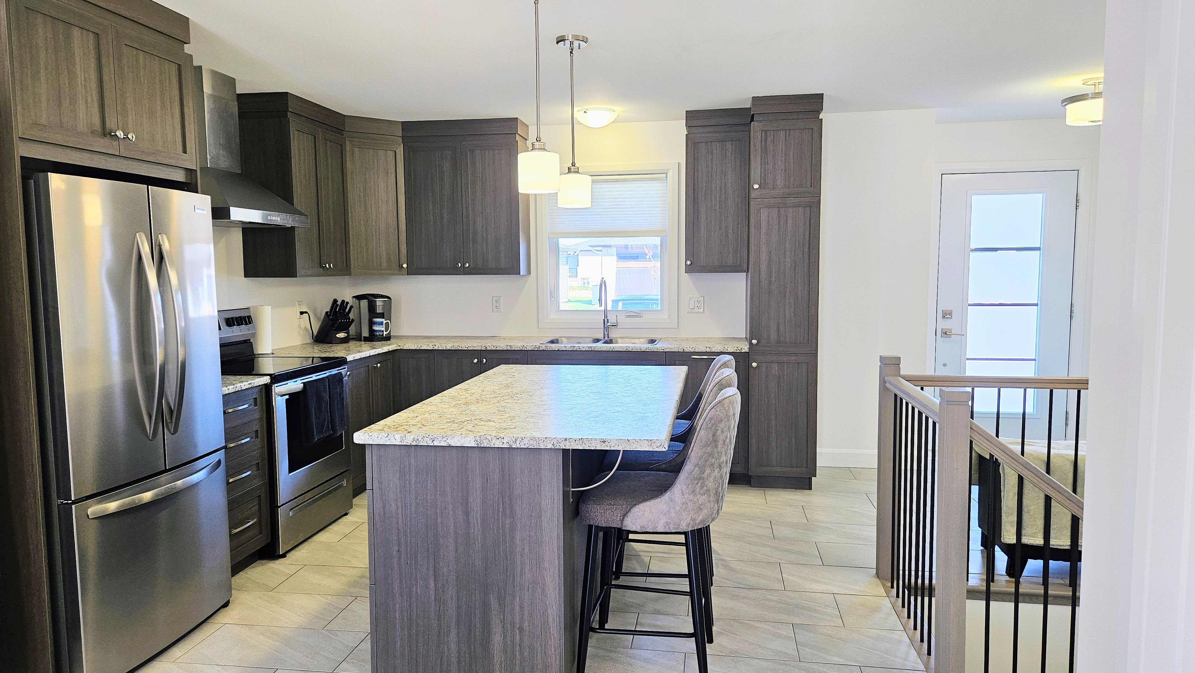• Open kitchen with center island and stainless steel appliances for convenience.