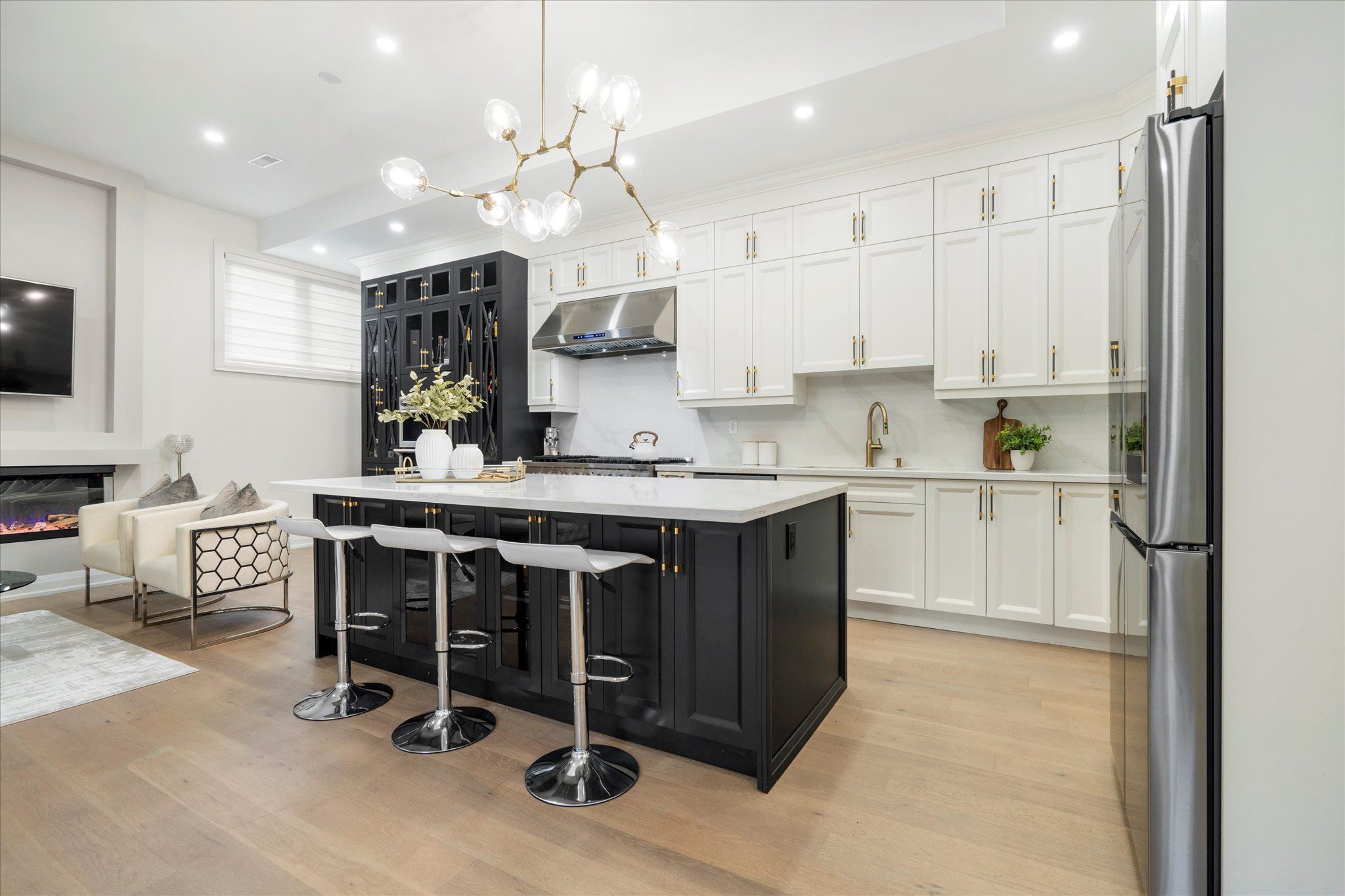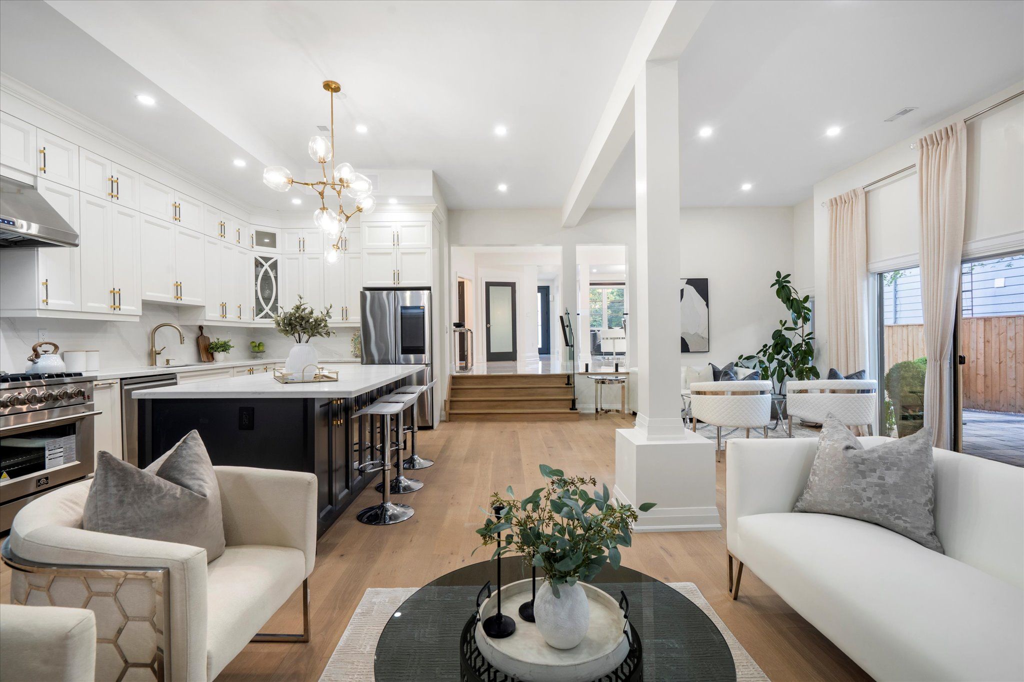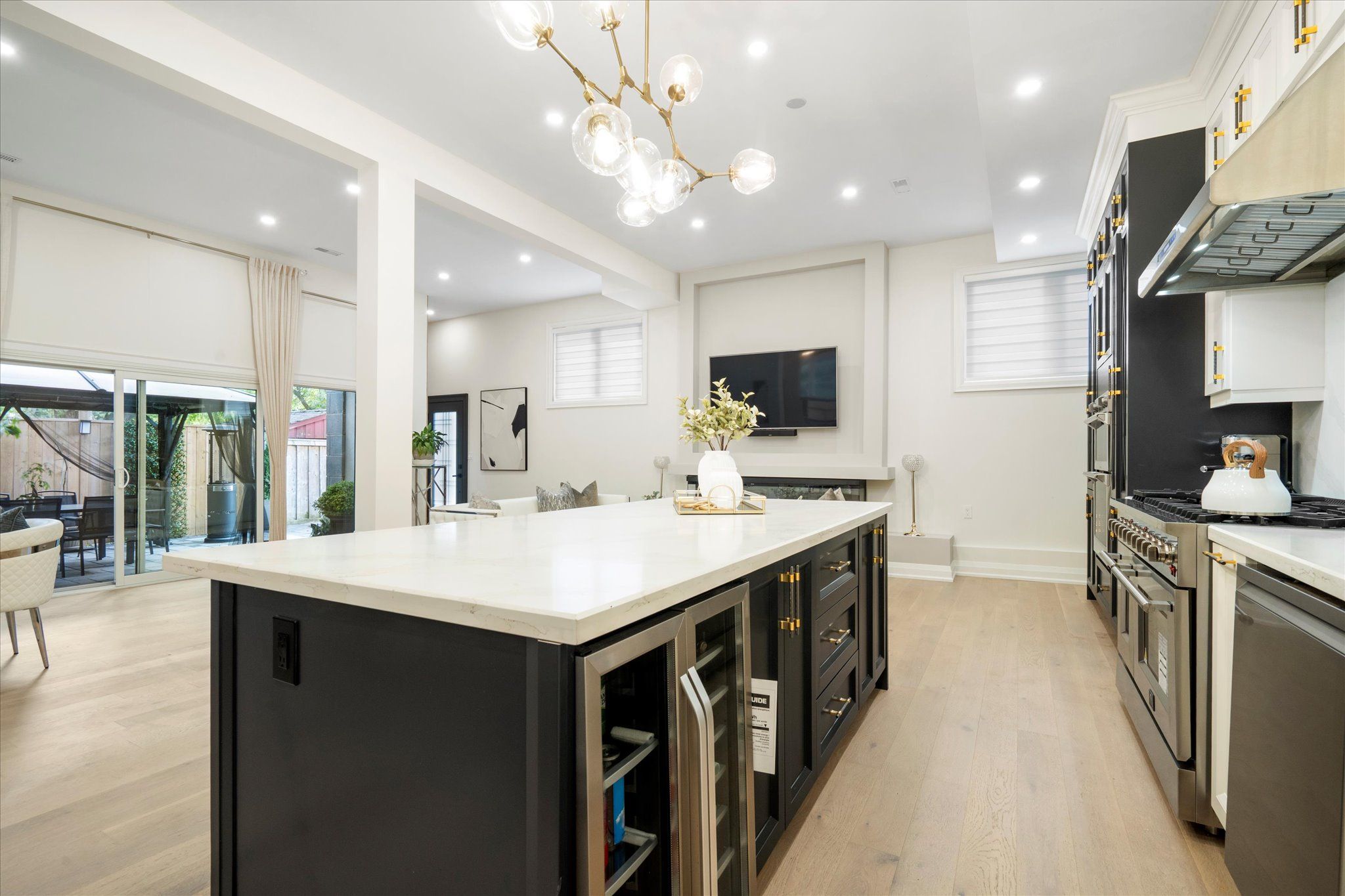 • Chef's kitchen with premium appliances, quartz counters, and a large center island.