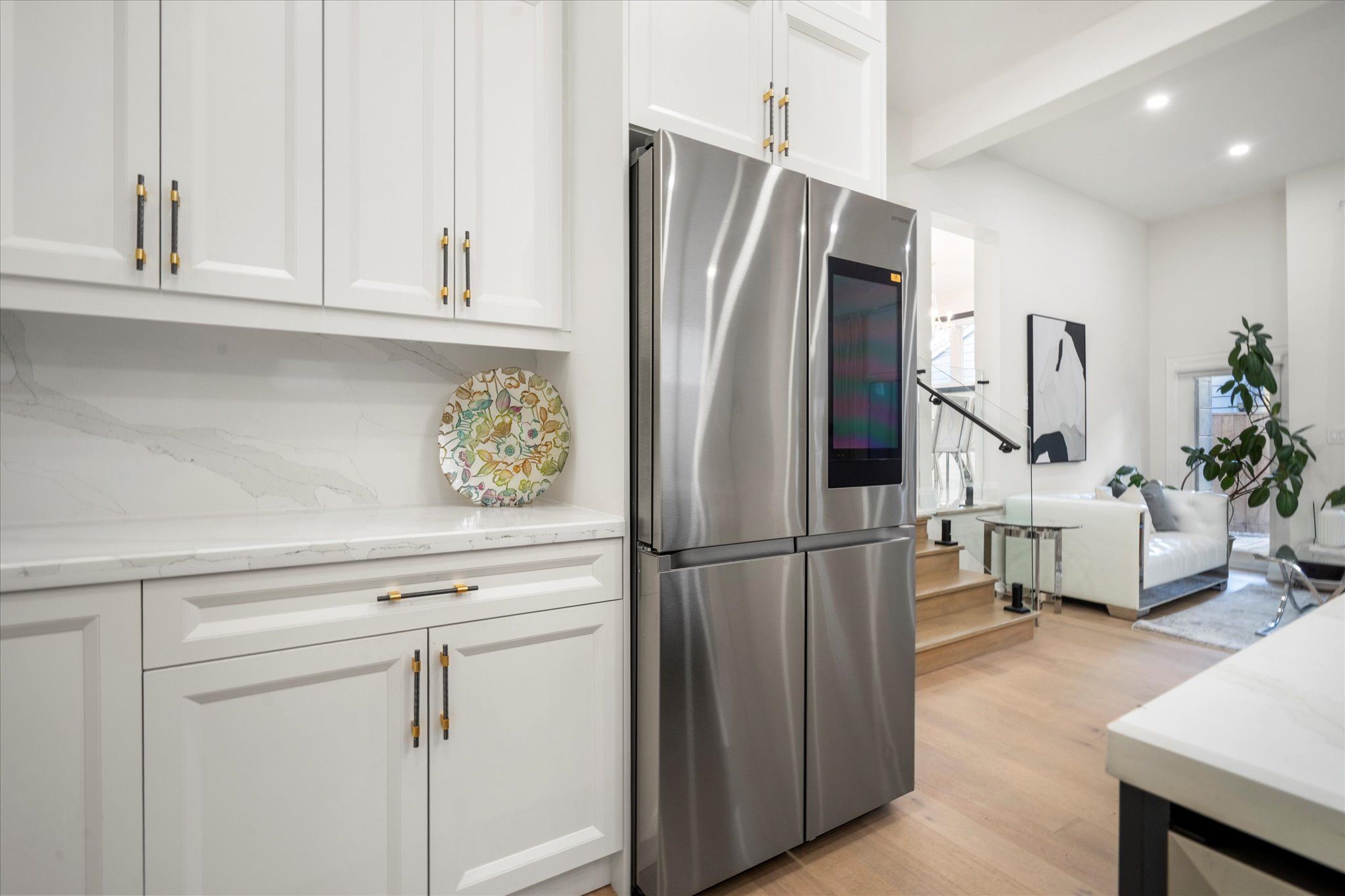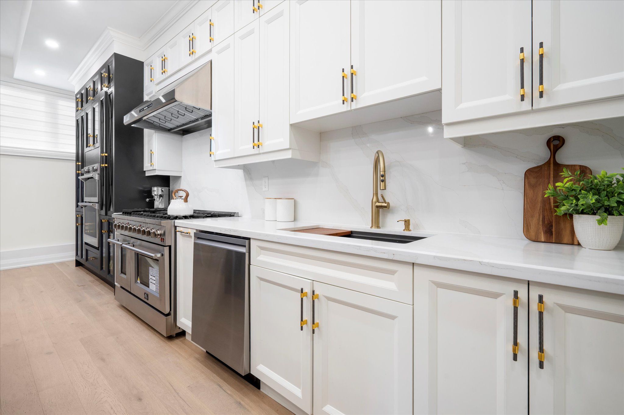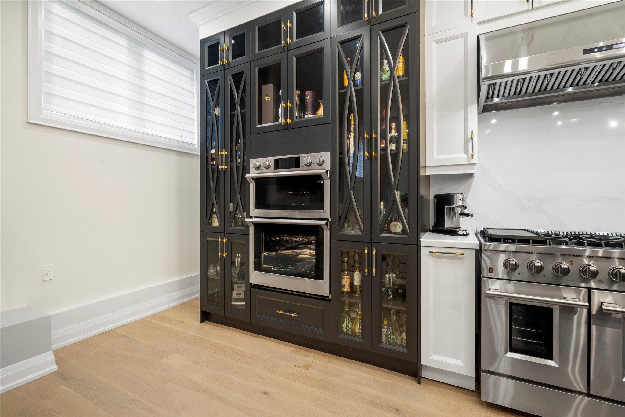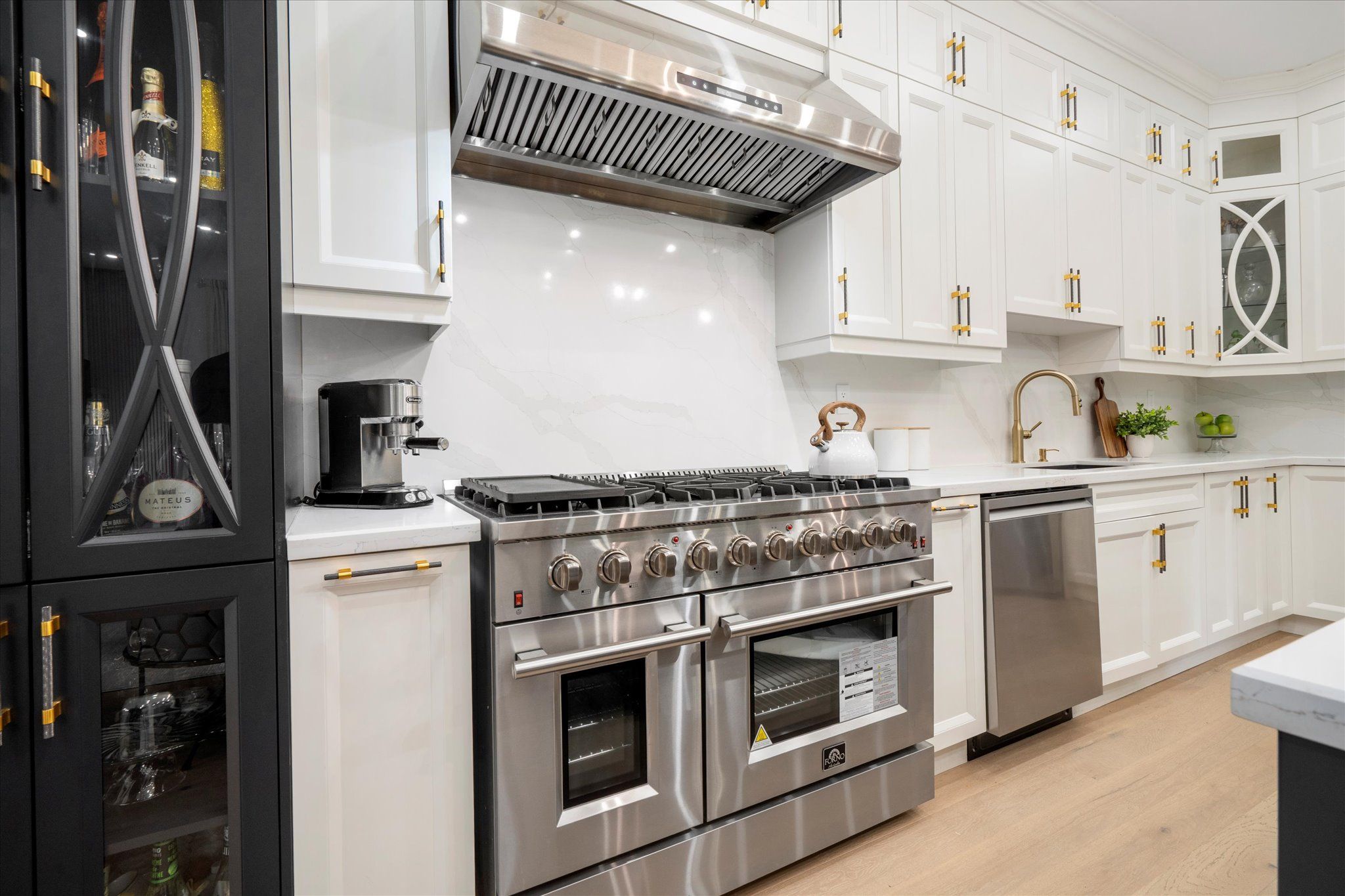 • Chef's kitchen with premium appliances, quartz counters, and a large center island.