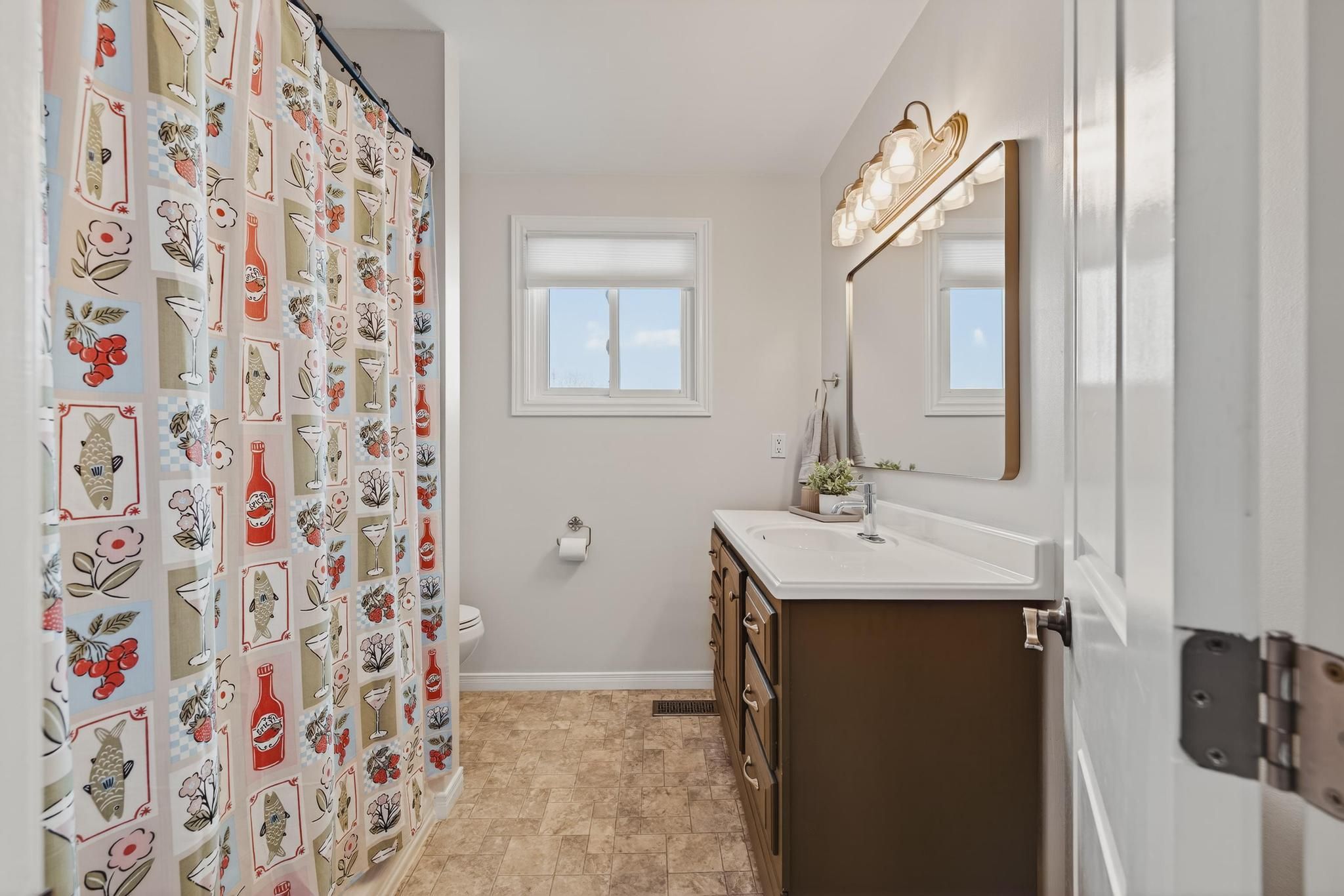 • Lower level features a cozy family room with a wood-burning fireplace.