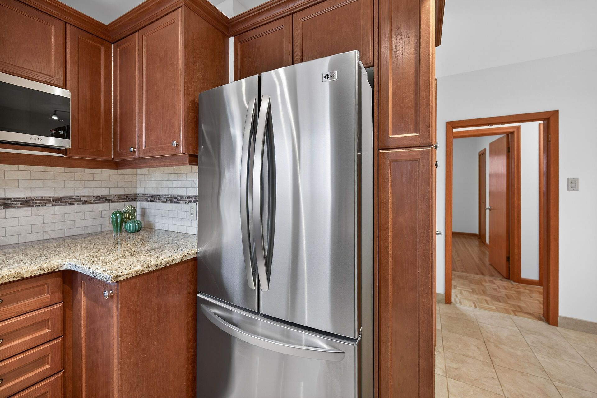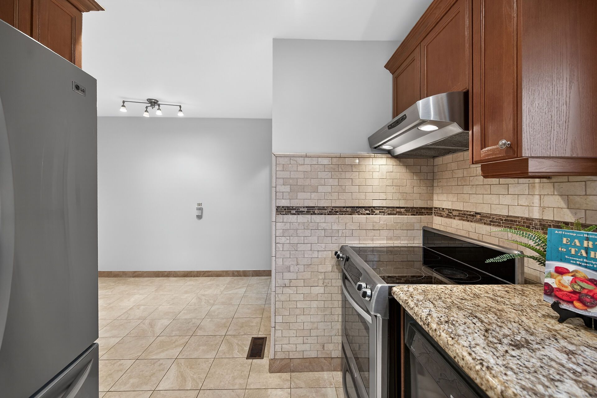 • Bright kitchen with granite counters and stainless steel appliances.