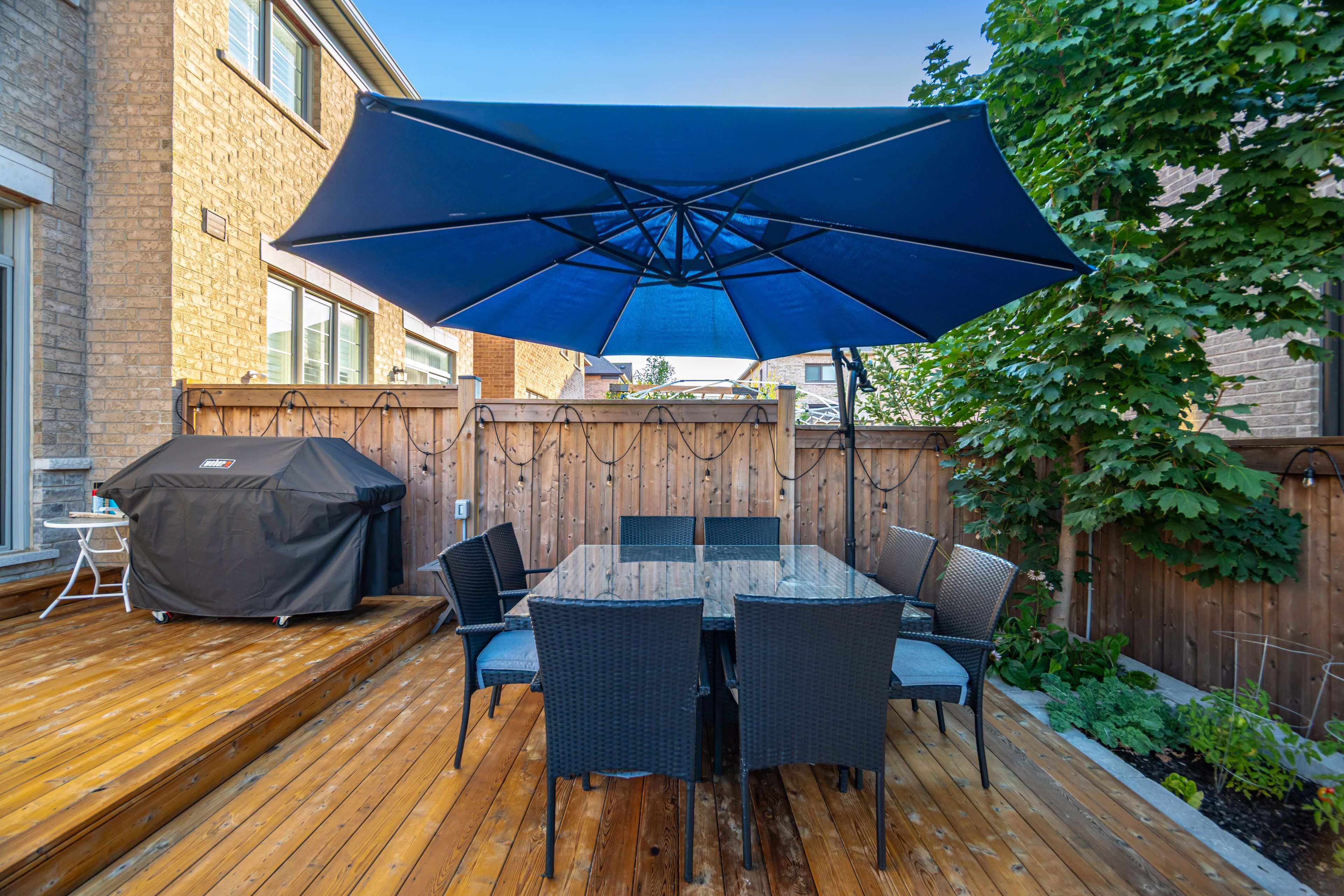 • Private backyard featuring extensive landscaping and a spacious cedar deck.