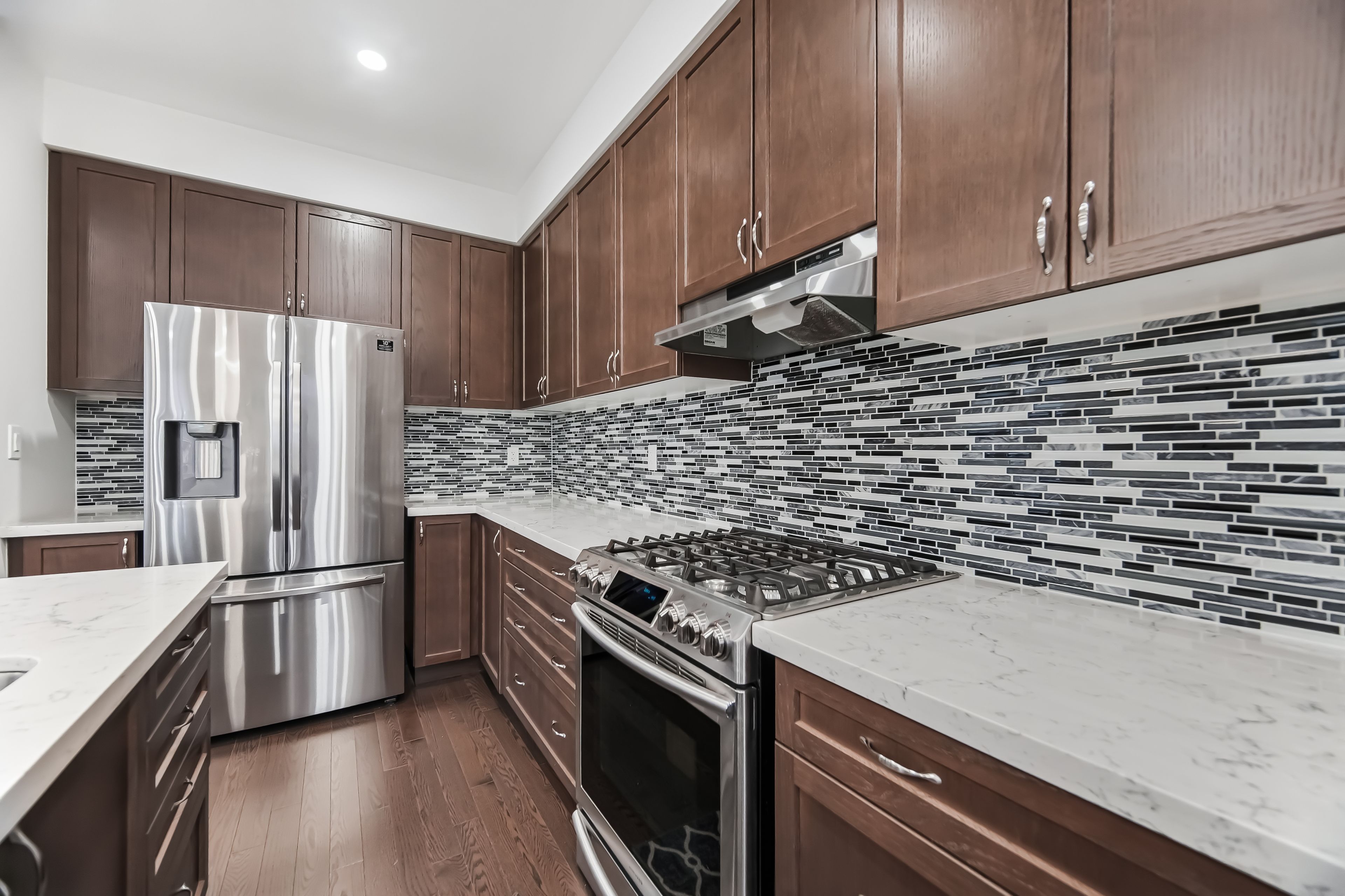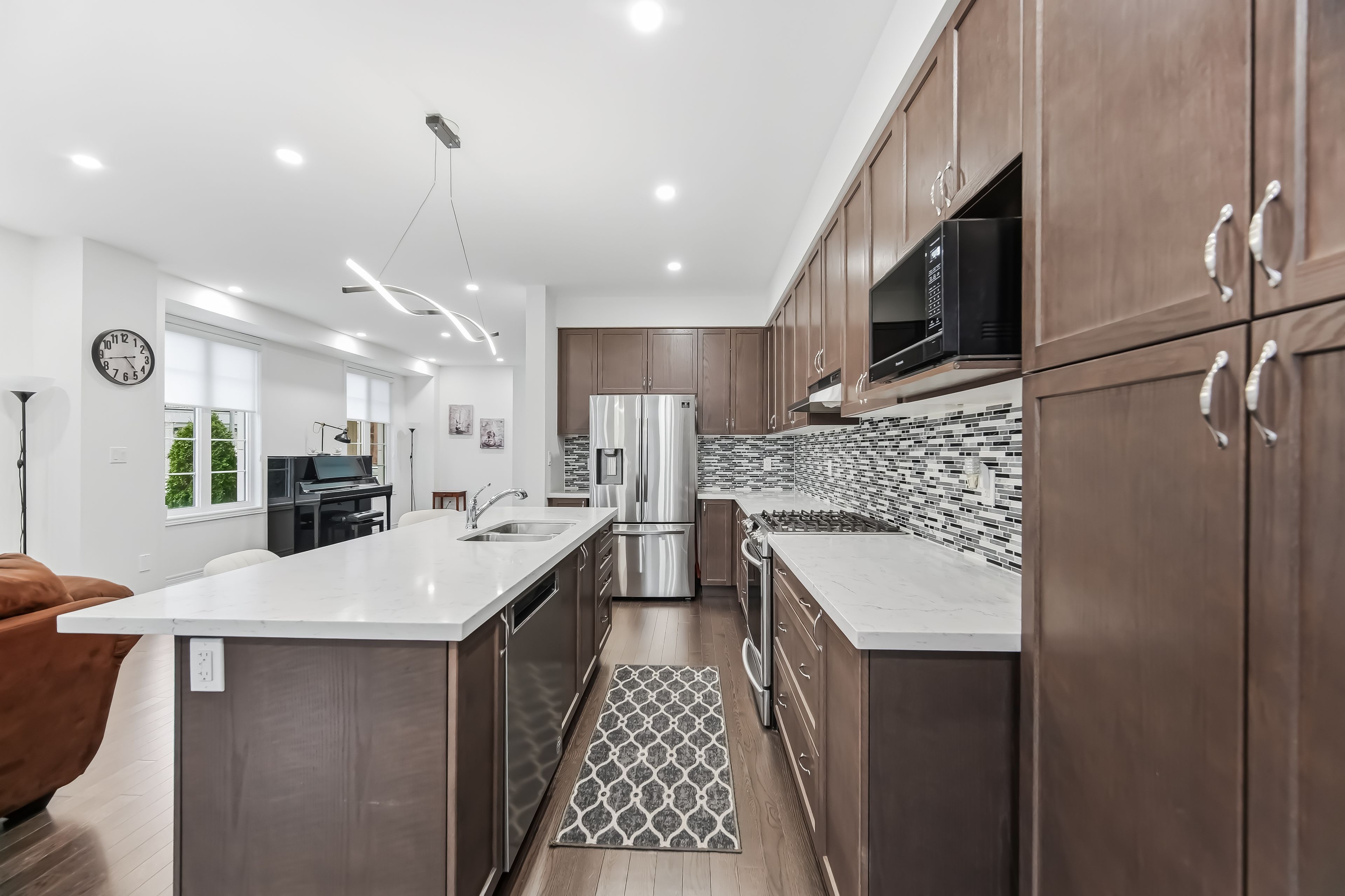 • Modern kitchen equipped with quartz countertops and Samsung smart appliances.