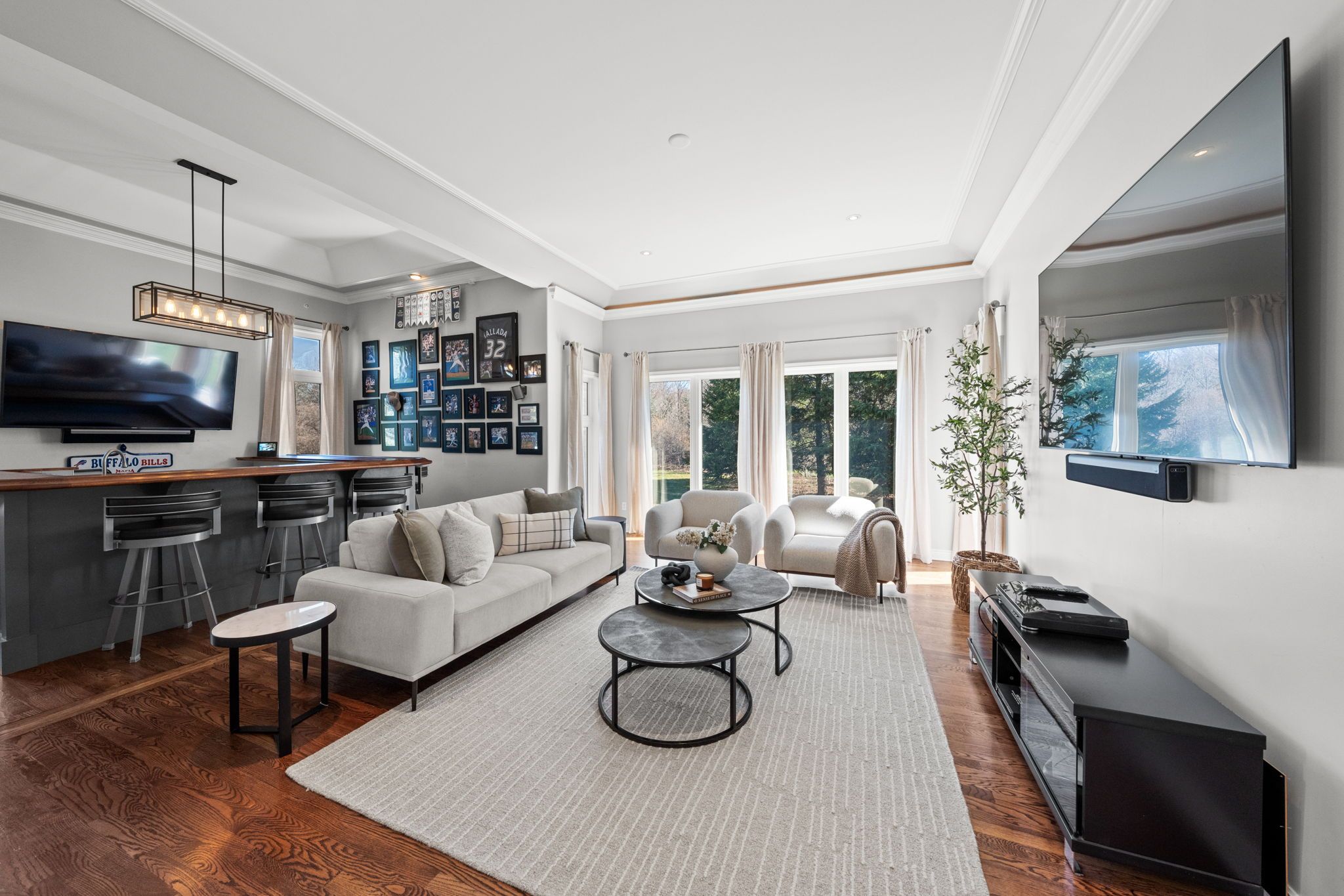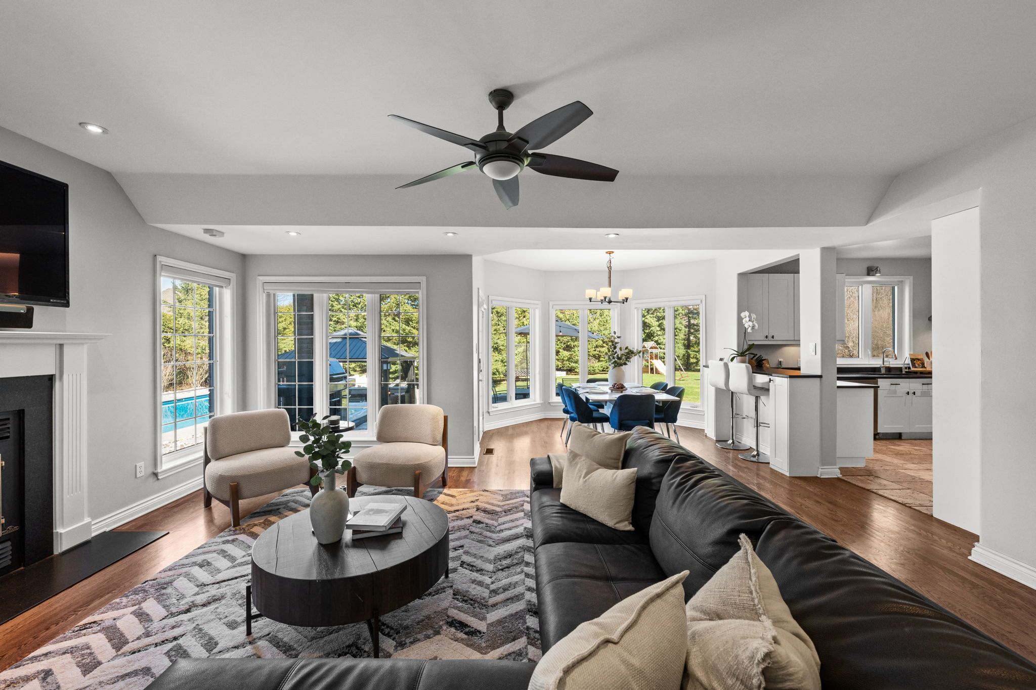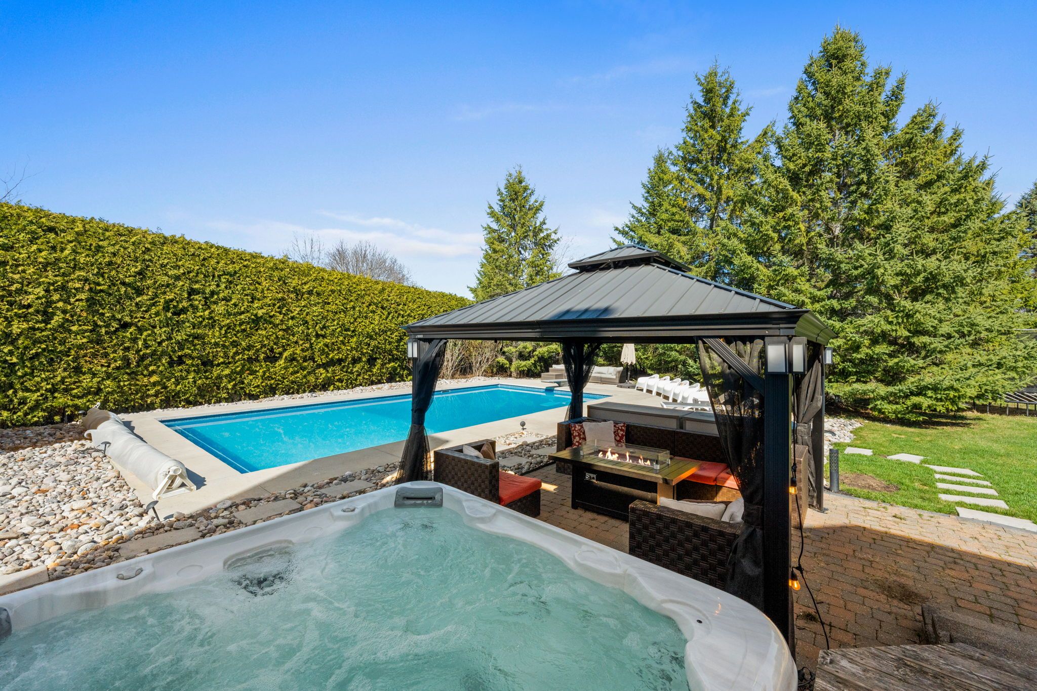 Welcome to an unparalleled retreat in the heart of manotick estates. Set on an expansive 1. 112-acre pie-shaped corner lot, this property is a rare gem in one of the city's most sought-after communities. Offering extreme privacy secured by tall hedges, stands of mature evergreens, & fully fenced, this expansive estate feels like a personal sanctuary. The sheer scale of this lot provides a vast canvas for the imagination, offering endless possibilities for future expansion, such as a coach house, detached outbuildings, & extra hosting space. The architectural presence of the home is immediate, featuring high roof lines & large windows that flood the interior with natural light. Inside, the grand foyer w/ an oak staircase leads to refined living spaces. The living room boasts 9ft vaulted ceilings w/ heavy crown moldings, a wood-burning fireplace, while the dining room features a bay window overlooking the 20' x 40' saltwater inground pool, gas fireplace & hot tub area. The gourmet kitchen has been completely reimagined with crisp white cabinetry, black honed granite counters, pewter travertine flooring & a raised breakfast bar. For the entertainer & sport enthusiast, a custom bar area w/ a sink & beverage fridge leads to the family room, complemented by 11ft tray ceilings w/ recessed lighting & french pocket door. The upper level serves as a sanctuary, headlined by the primary bedroom retreat featuring a bayed sitting area & exclusive access to a covered romeo & juliet balcony overlooking the yard. The primary ensuite is fully renovated w/ a soaker tub, dual vanities, & separate walk-in closets. The finished basement extends the home w/ a 4th bedroom & a fully renovated bathroom + laundry room w/ heated floors. Whole-home generac generator, two new sump pumps + battery backup system, professionally landscaped (2023), new water treatment systems + uv filter (approx 4 years old), roof (approx 8 years old, + 25-year warranty), gas furnace (approx. 2019), many more updates