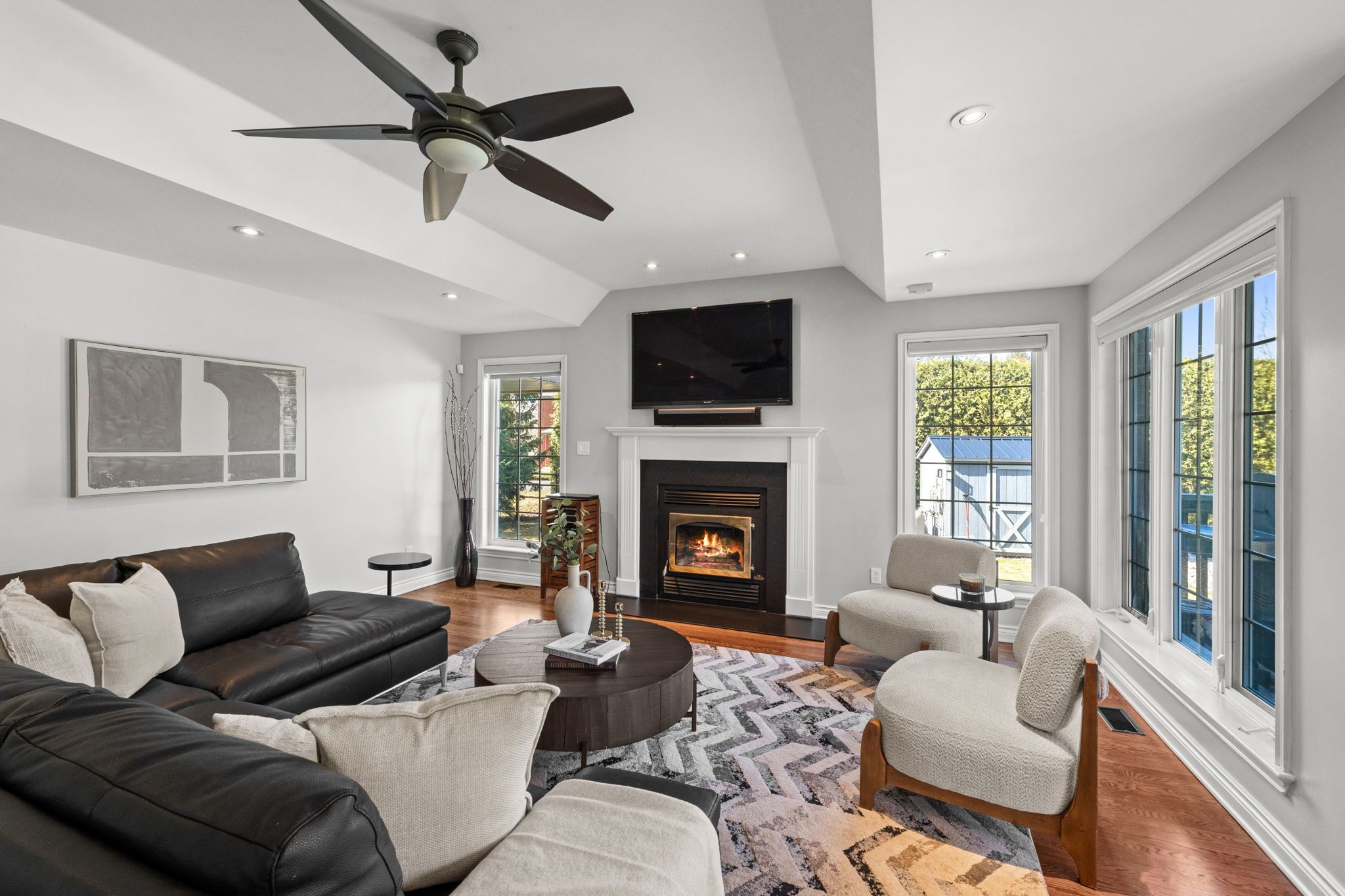 • Living room with vaulted ceilings and wood-burning fireplace for cozy gatherings.