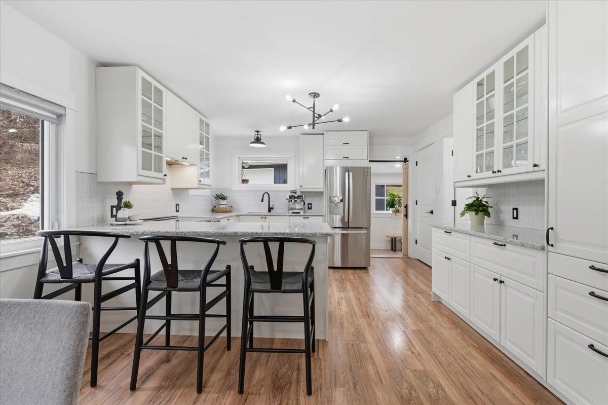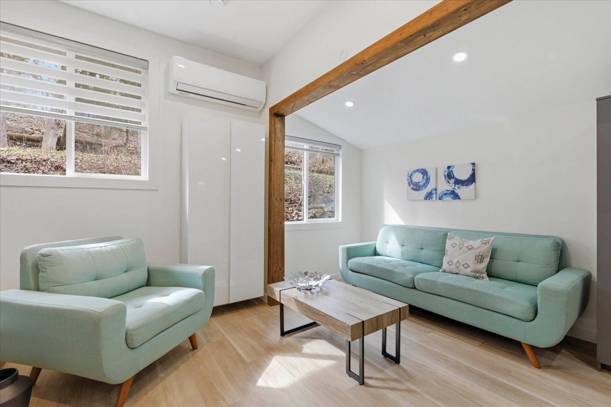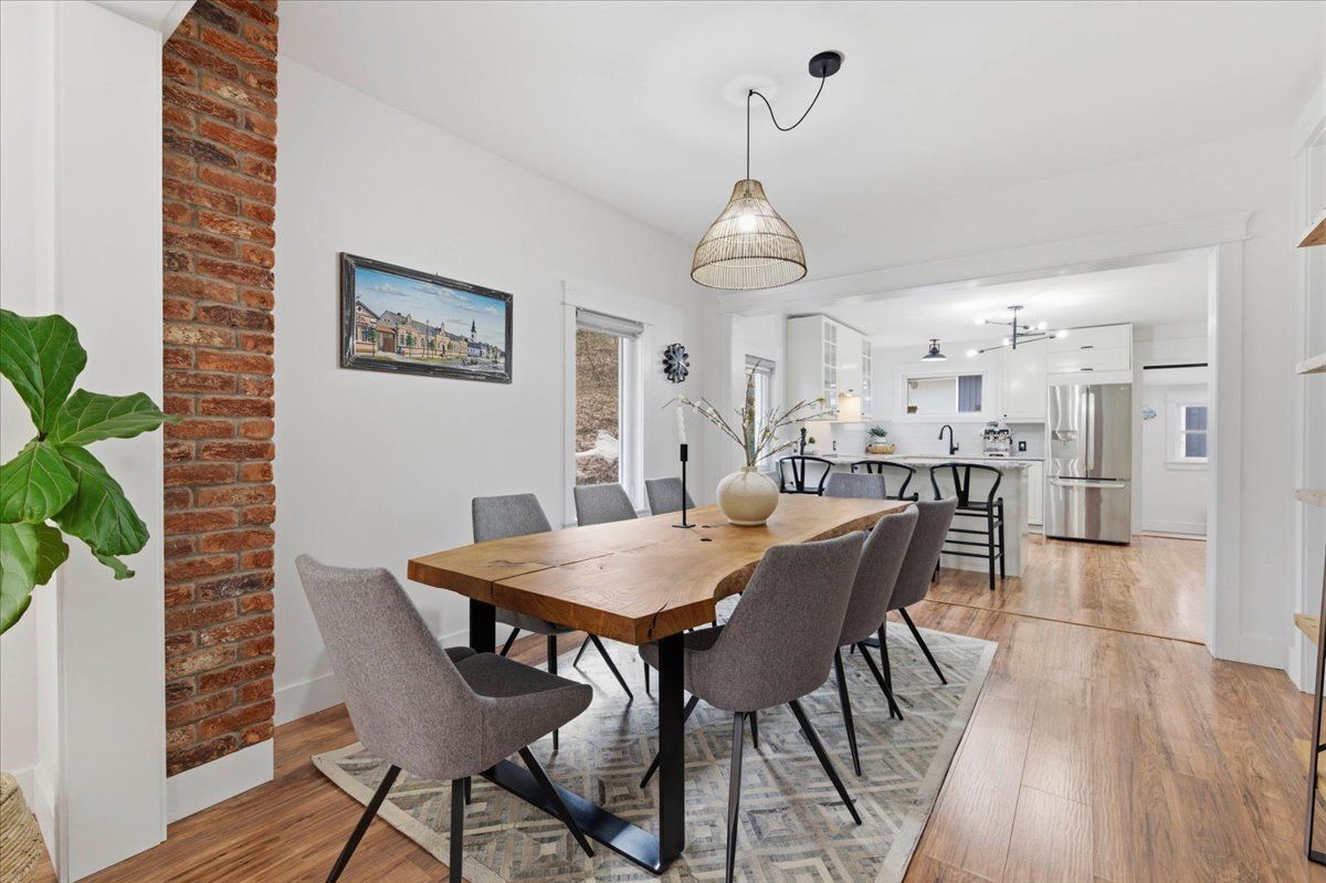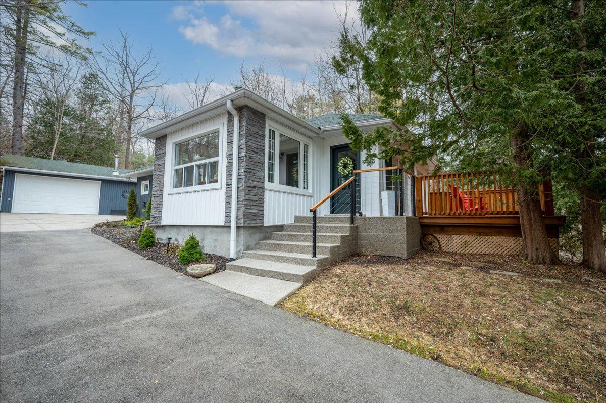 Sitting on one acre of land, nestled along the wooded banks of the grand river, this recently updated home is ready to be yours, in the quaint neighborhood of sheps subdivision, north dumfries. At a quick glance, you get the feeling that you've left the city hours behind, but it's actually a scenic 8 minute drive to downtown galt. The home and detached garage take advantage of the deep lot as they sit back from the road, the mature trees create a natural buffer making the property more private. The bungalow is approximately 1466 square feet of pure charm. A three-panel floor to ceiling window and sliding door separate the foyer from the front facing deck which overlooks the pond and creates the spot for you to enjoy your morning coffee. The living room is the perfect example of how immersed the home is into its natural surroundings, windows on all three sides and a skylight; you won't suffer from the lack of natural light here. The formal dining room separates the living room from the eat in kitchen, rightfully occupying a major part of the main floor space. Wrap around quartz countertops form a peninsula that can seat three. Storage and display cabinetry fully utilize the wall space adding function and elegance with stainless steel appliances. The home hosts two bedrooms and two bathrooms, one is a 3 piece and one is a luxury 5 piece, complete with free standing soaker tub and the shiplap wall finishing of the mudroom laundry continues to bring the cottage feel. The second structure on the property is dual purposed. It's a detached garage or shop space, and right beside it with a separate entrance and its own heating and cooling system, an additional bachelor dwelling unit complete with kitchen, bathroom, and laundry. Furnace (2023), septic system rebuild (2023) you will be hard pressed to find a property so close to the city that offers the privacy and versatility like this one!