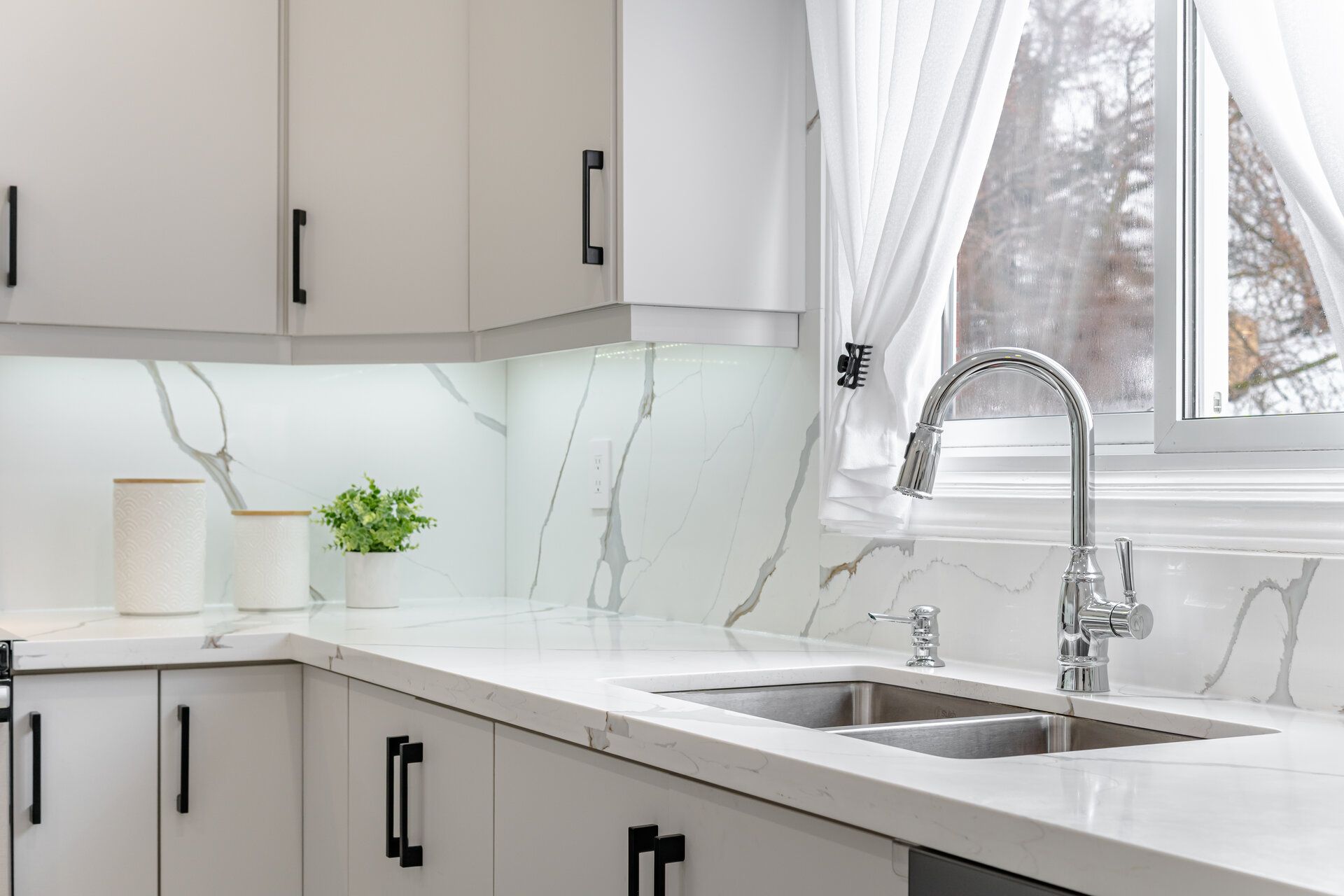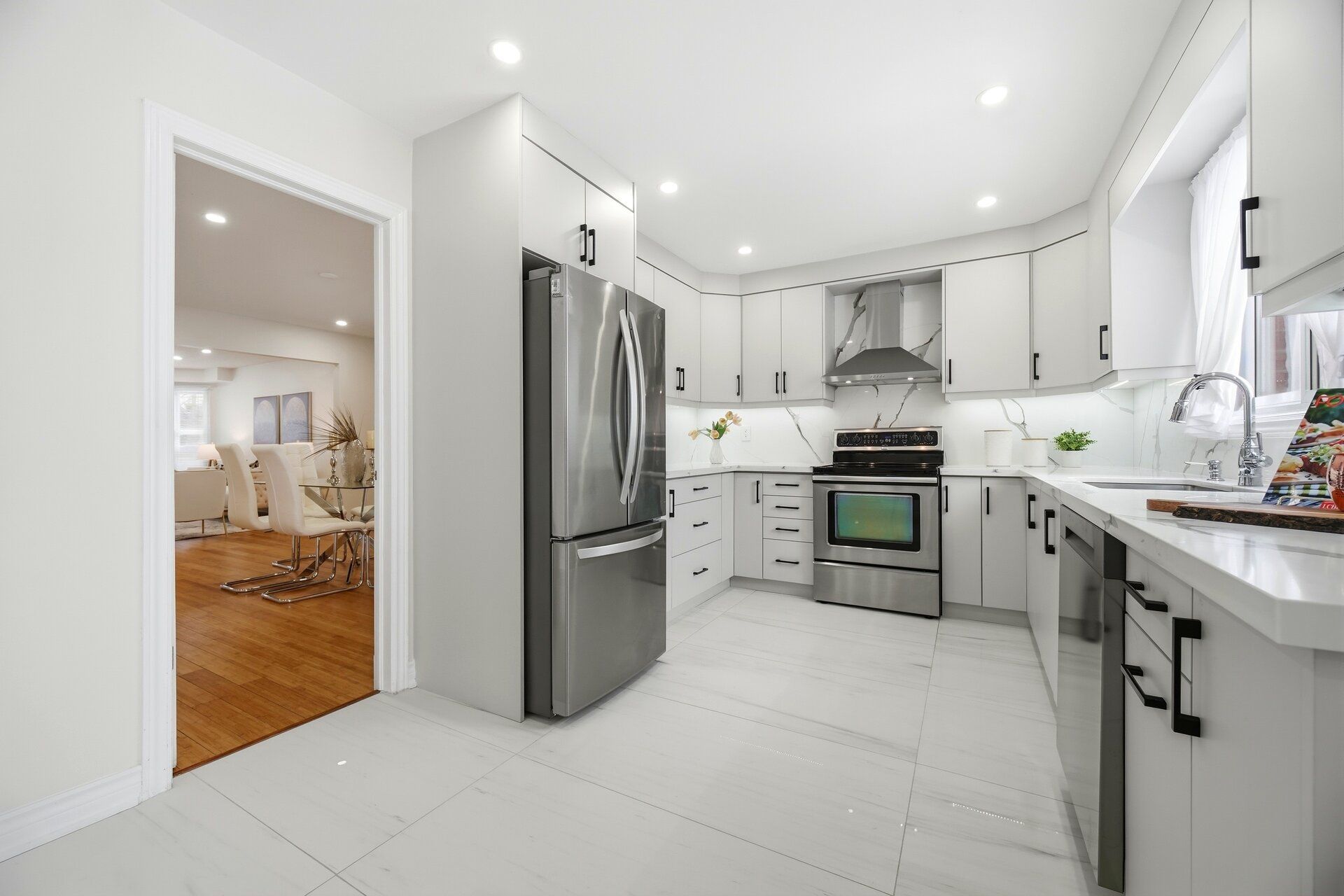 • Renovated kitchen with quartz counters and stainless steel appliances.