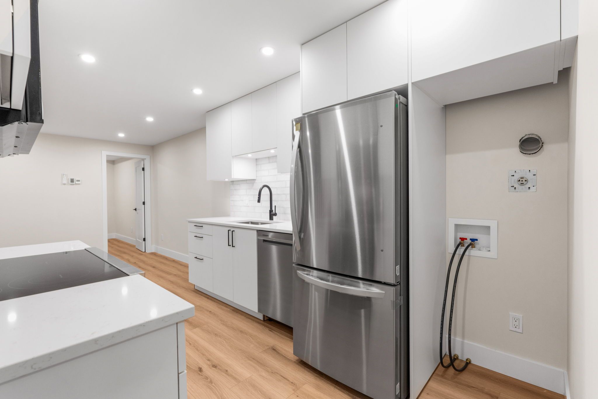 • Modern kitchen features quartz countertops and stainless steel appliances.